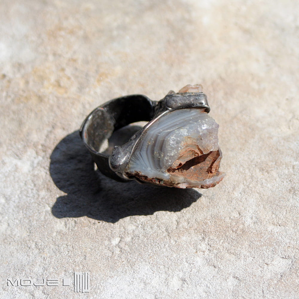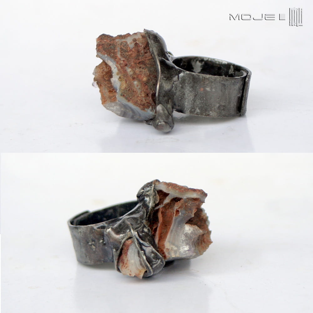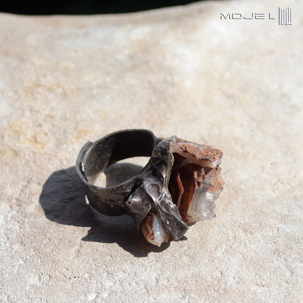 Pierścionek z naturalną surową bryłką agatu w kolorach szaro-brązowych.