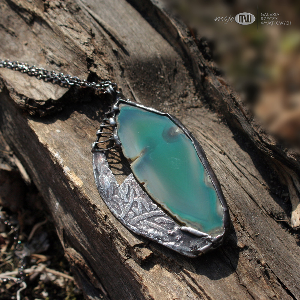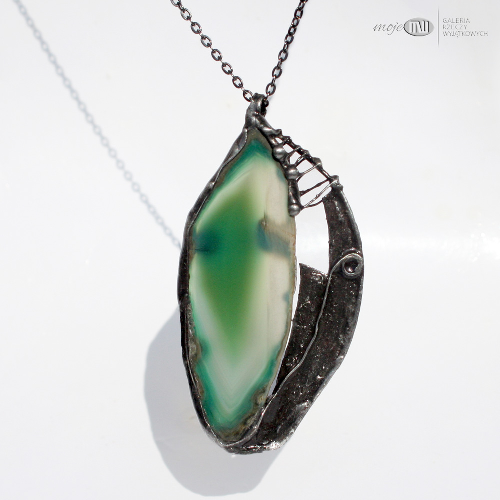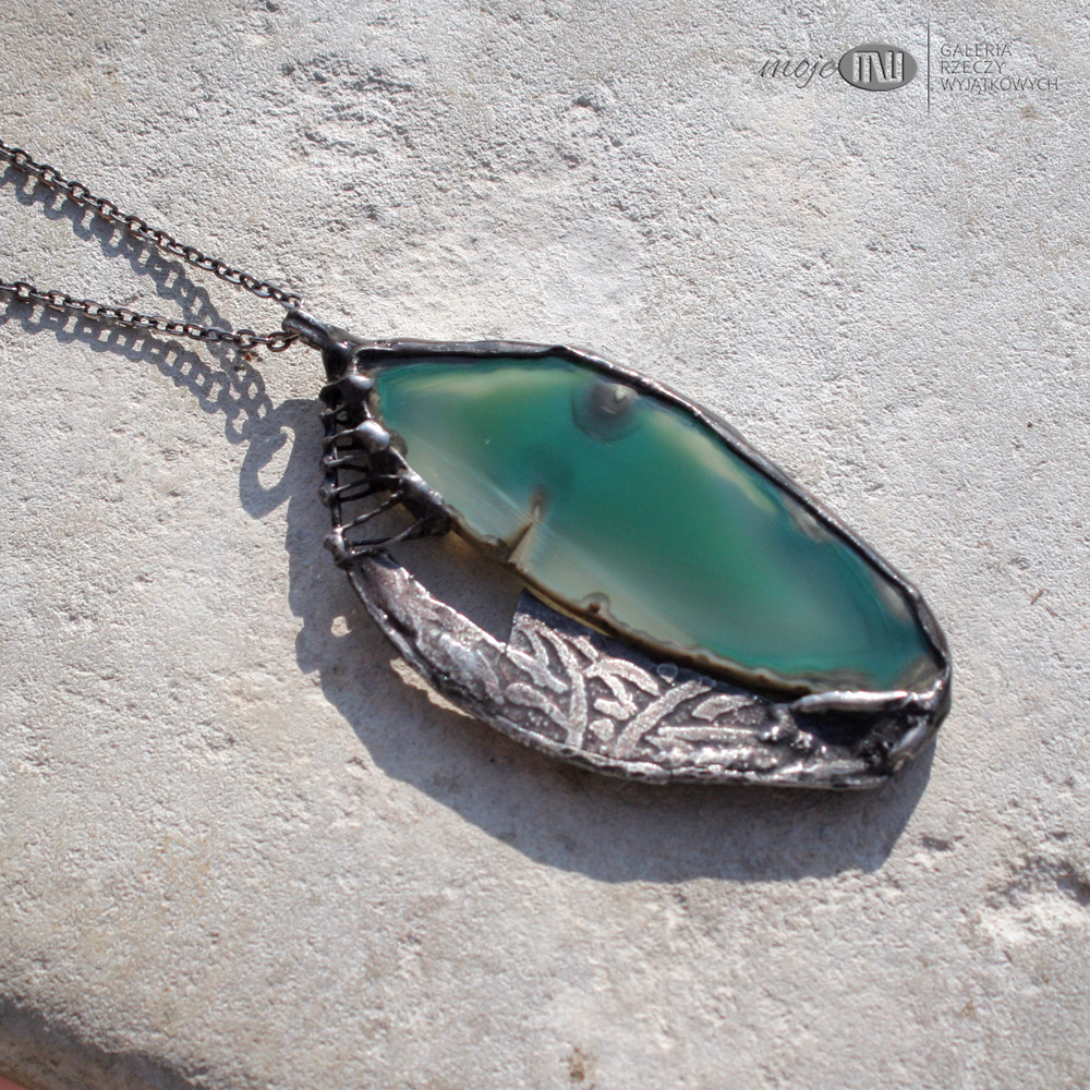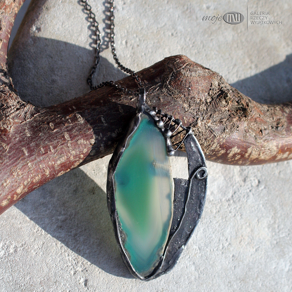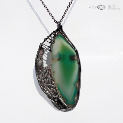 Wisior uformowany z plastra agatu i miedzi. Agat jest w pięknym zielono-szmaragdowym kolorze. Oprawiony i wykończony jest miedzią - cynowaną, patynowaną i przecieraną, a trawiony wzór urozmaica powierzchnię metalu. Jest dwustronny - po drugiej stronie na metalowym elemencie jest tylko samotny zawijas. Wisior zawieszony jest na łańcuszku w kolorze grafitowym. Zazwyczaj dodaję łańcuszek o długości ok. 60-70 cm, ale klient może podać długość, która go interesuje.