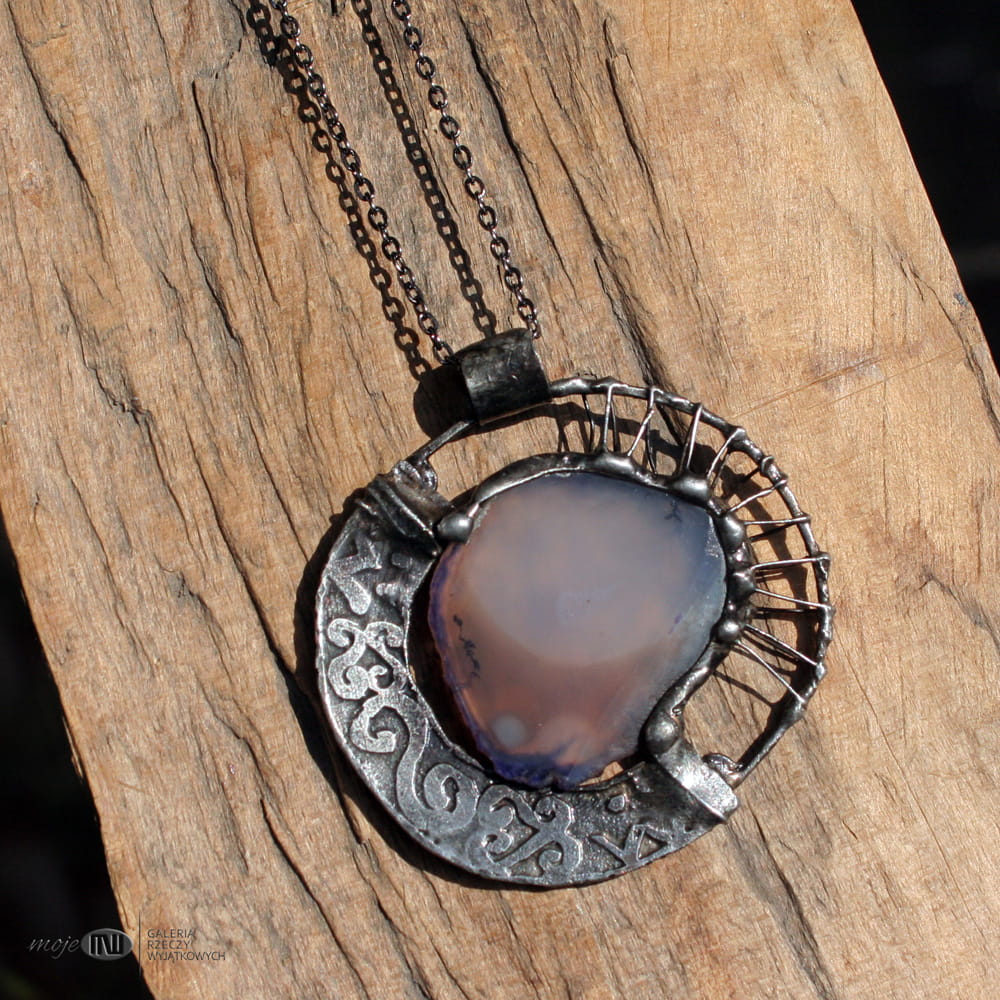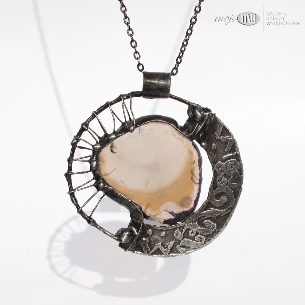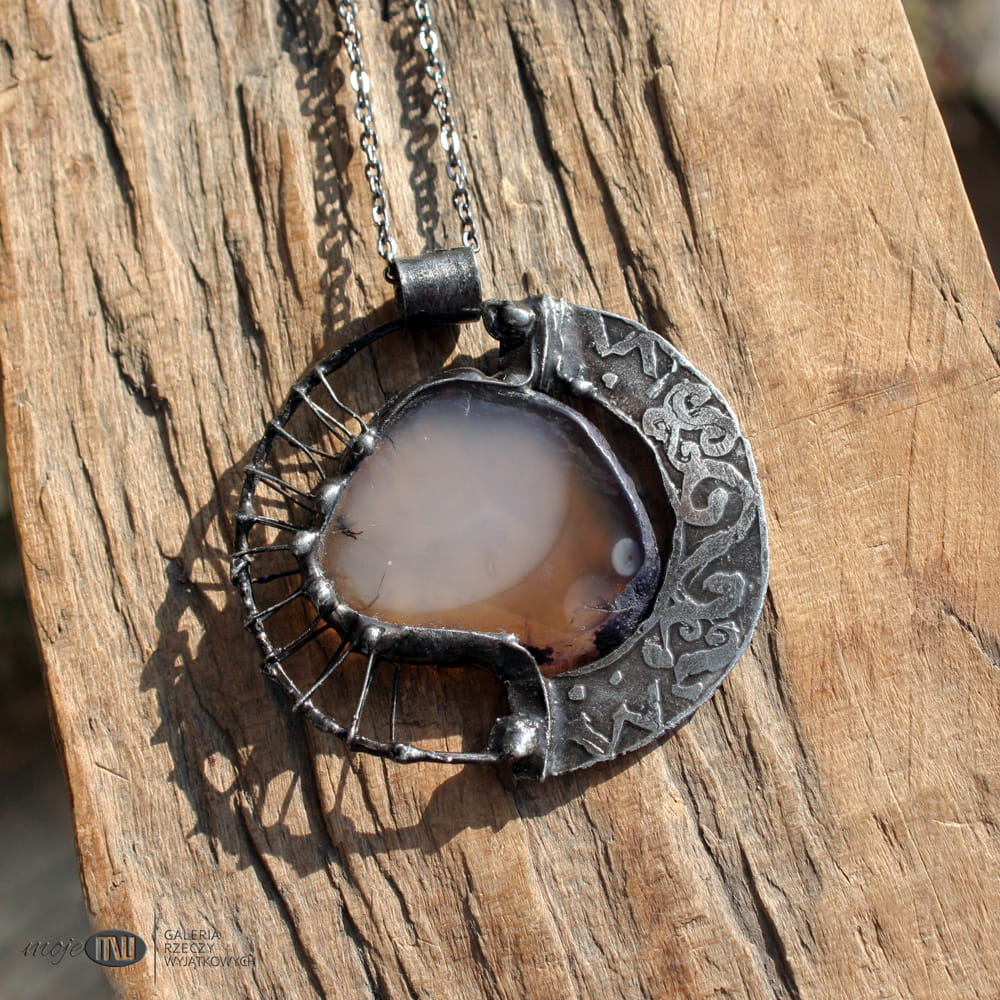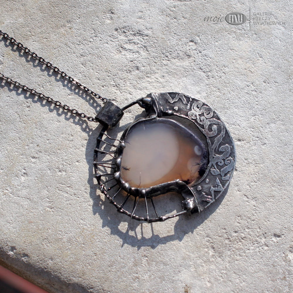 Wisior uformowany z plastra agatu i miedzi. Agat jest w stonowanym brązowo-beżowym kolorze. Oprawiony i wykończony jest miedzią - cynowaną, patynowaną i przecieraną, a trawiony florystyczny wzór urozmaica powierzchnię metalu. Jest dwustronny - po drugiej stronie na metalowym elemencie wytrawiony jest taki sam wzór jak na przodzie. Wisior zawieszony jest na łańcuszku w kolorze grafitowym. Zazwyczaj dodaję łańcuszek o długości ok. 60-70 cm, ale klient może podać długość, która go interesuje.