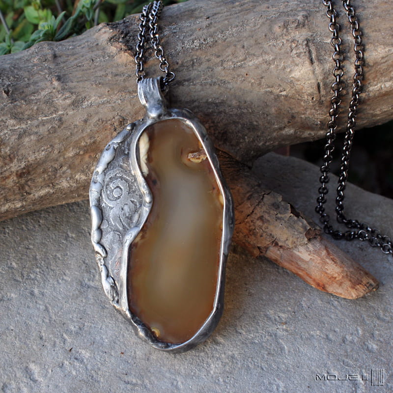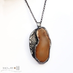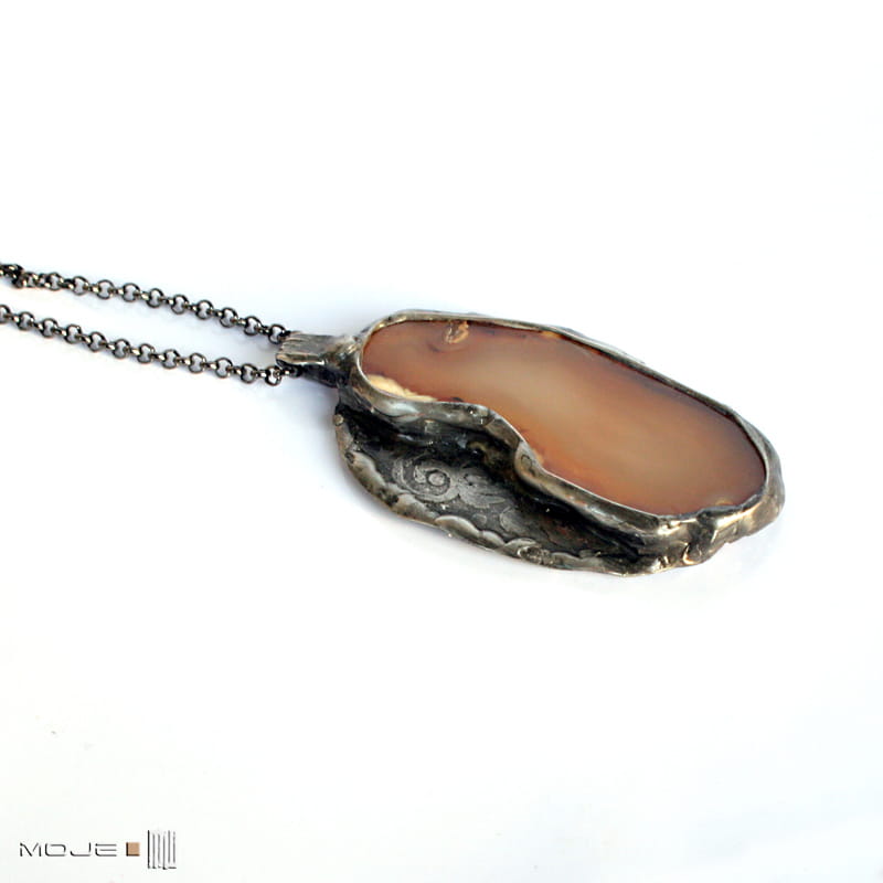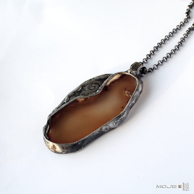 Wisior zrobiony jest z plastra agatu w kolorach ziemisto-brązowych. Oprawiony w miedź - trawioną, cynowaną, patynowaną i przecieraną. Kolorystyka zbliżona jest do żywiołu ziemi - w ciepłych odcieniach. Wisior zawieszony jest na łańcuszku w kolorze grafitowym o dł. 68 cm.