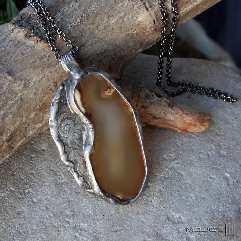 Wisior z plastra agatu w kolorach ziemisto-brązowych.