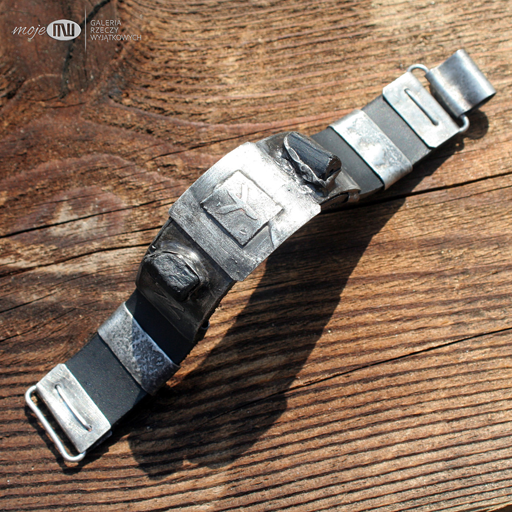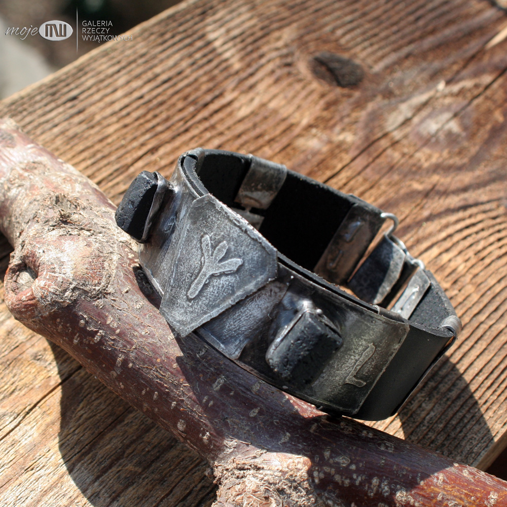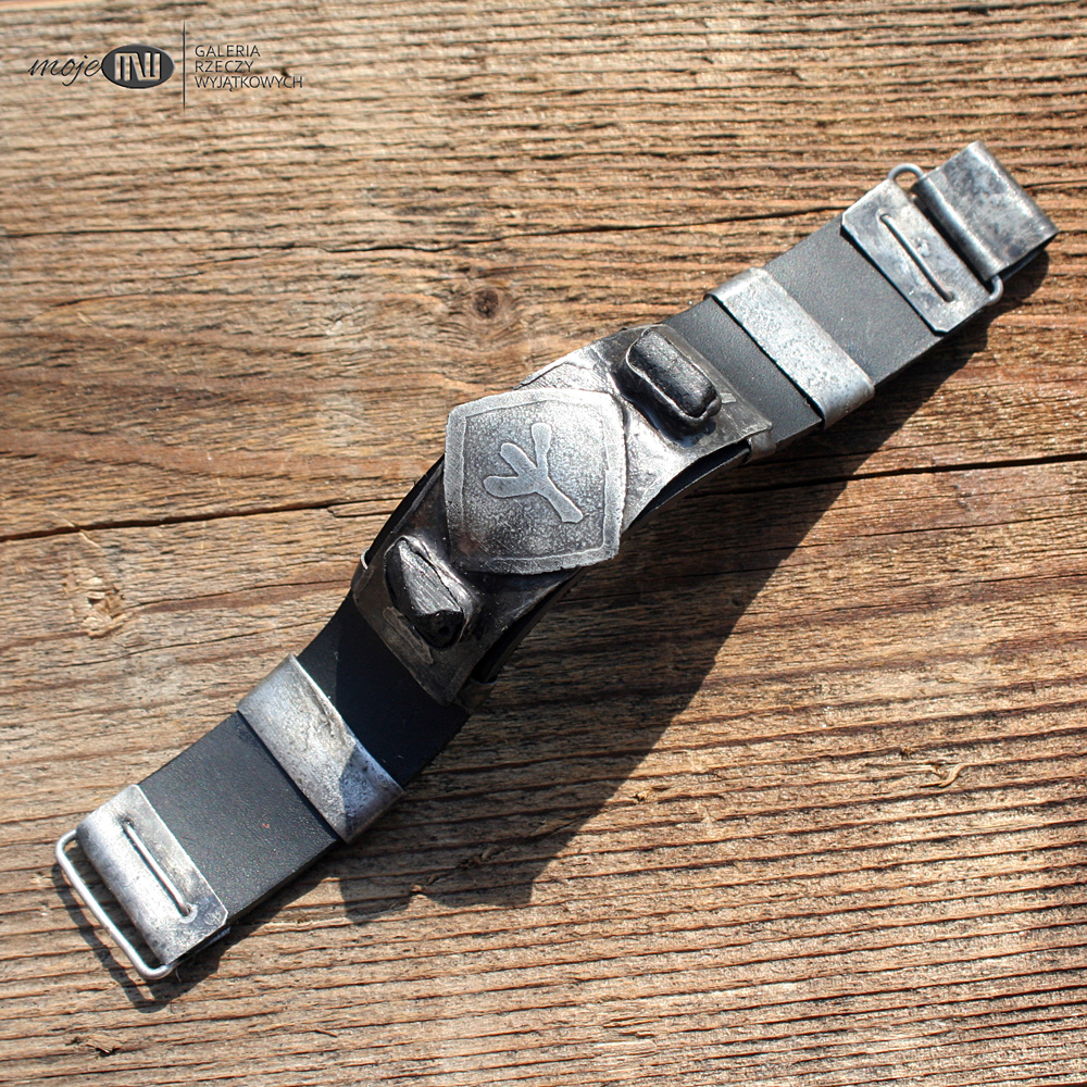 Bazę stanowi licowana czarna skóra gr. 3 mm. Elementy ozdobne i zapięcia również zrobione są z cynowanej miedzi.