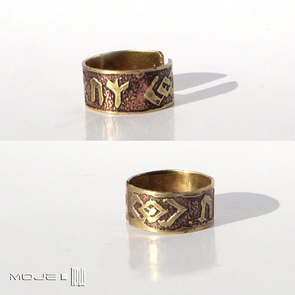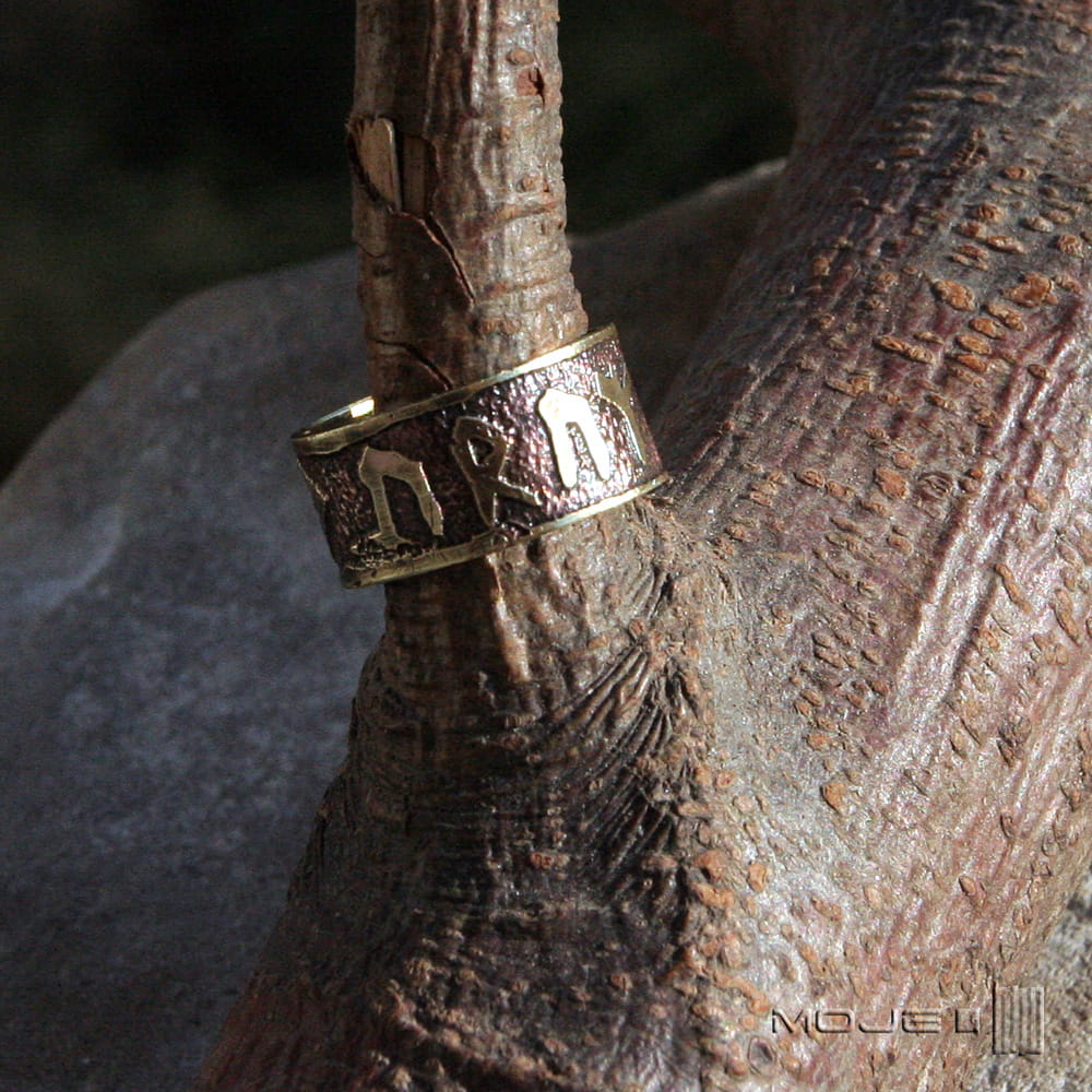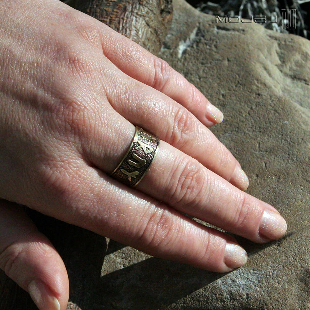 Mosiężna obrączka unisex. Jest ozdobiona wytrawionymi w metalu runami, które składają się na amulet zdrowia. Sposób wykonania sprawia, że jest surowa, rustykalna, nieco etniczna. Jest delikatnie patynowana dla wydobycia wzorów.