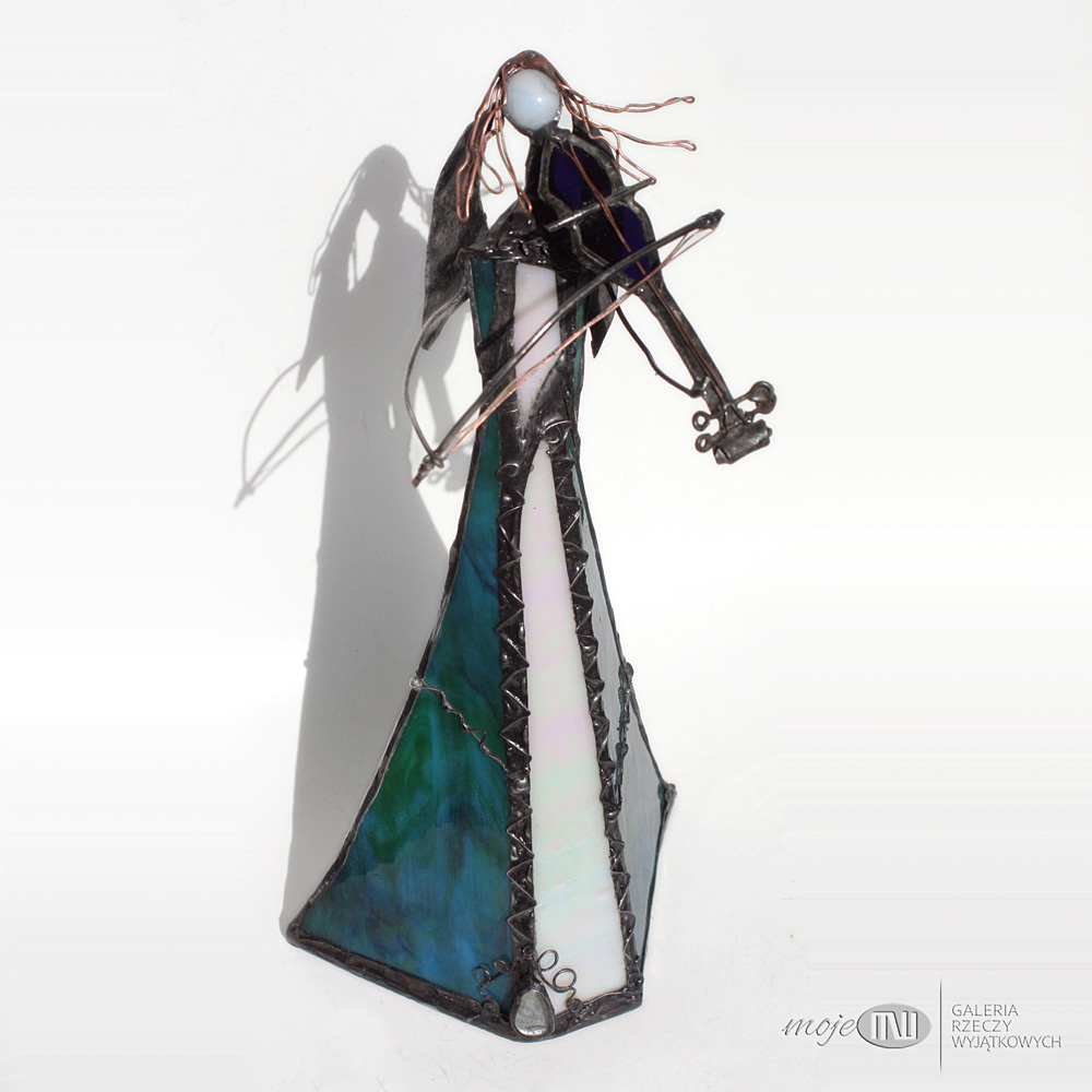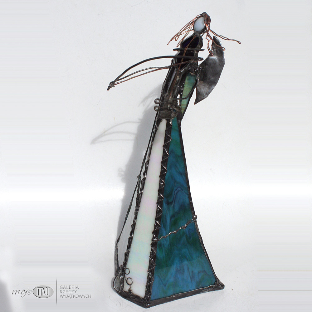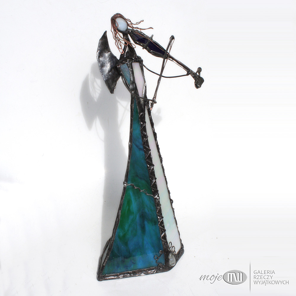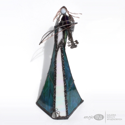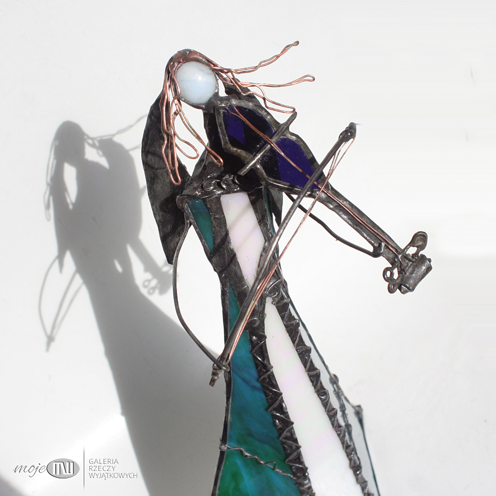 Anioł zrobiony jest z morskiego oraz białego szkła witrażowego - białe szkło ma opalizującą perłowo warstwę. Oprawiony witrażową techniką Tiffany z użyciem miedzi i cyny - patynowany. Jego różową główkę zrobiłam metodą fusingu (wypalanie szkła w temp. min. 800 stopni), skrzydła są z miedzianej blachy - również cynowanej i patynowanej. Anioł z rozwianym włosem gra na szklanych skrzypcach...