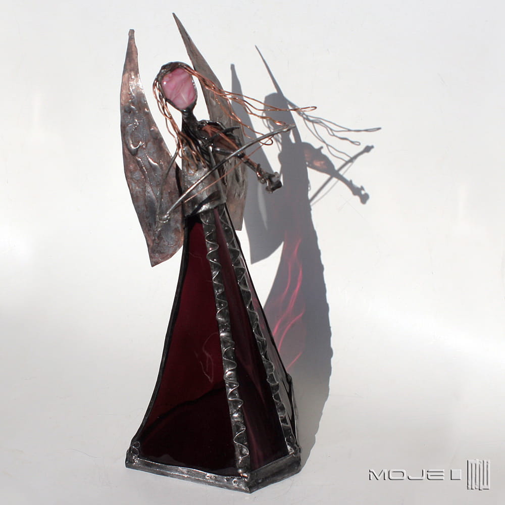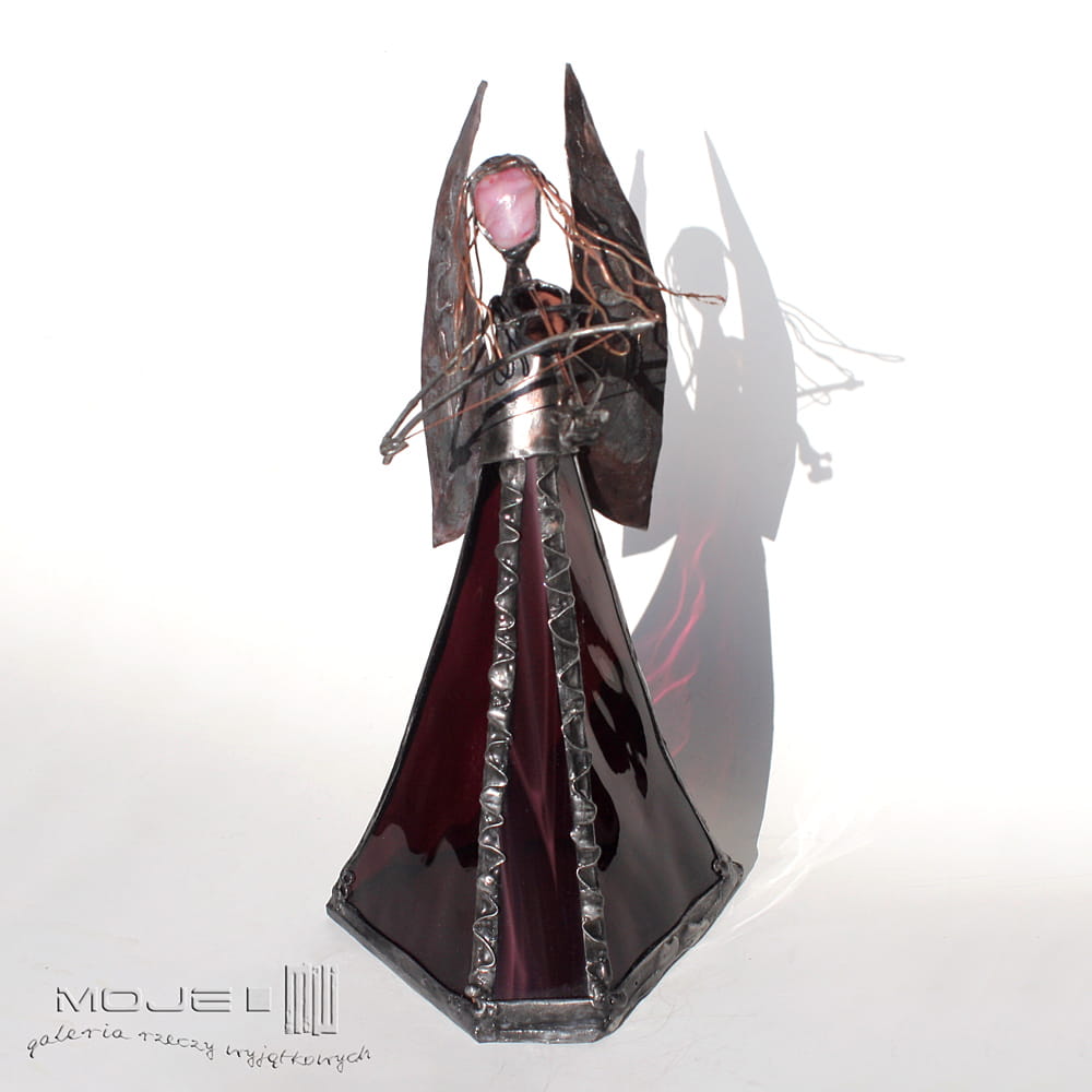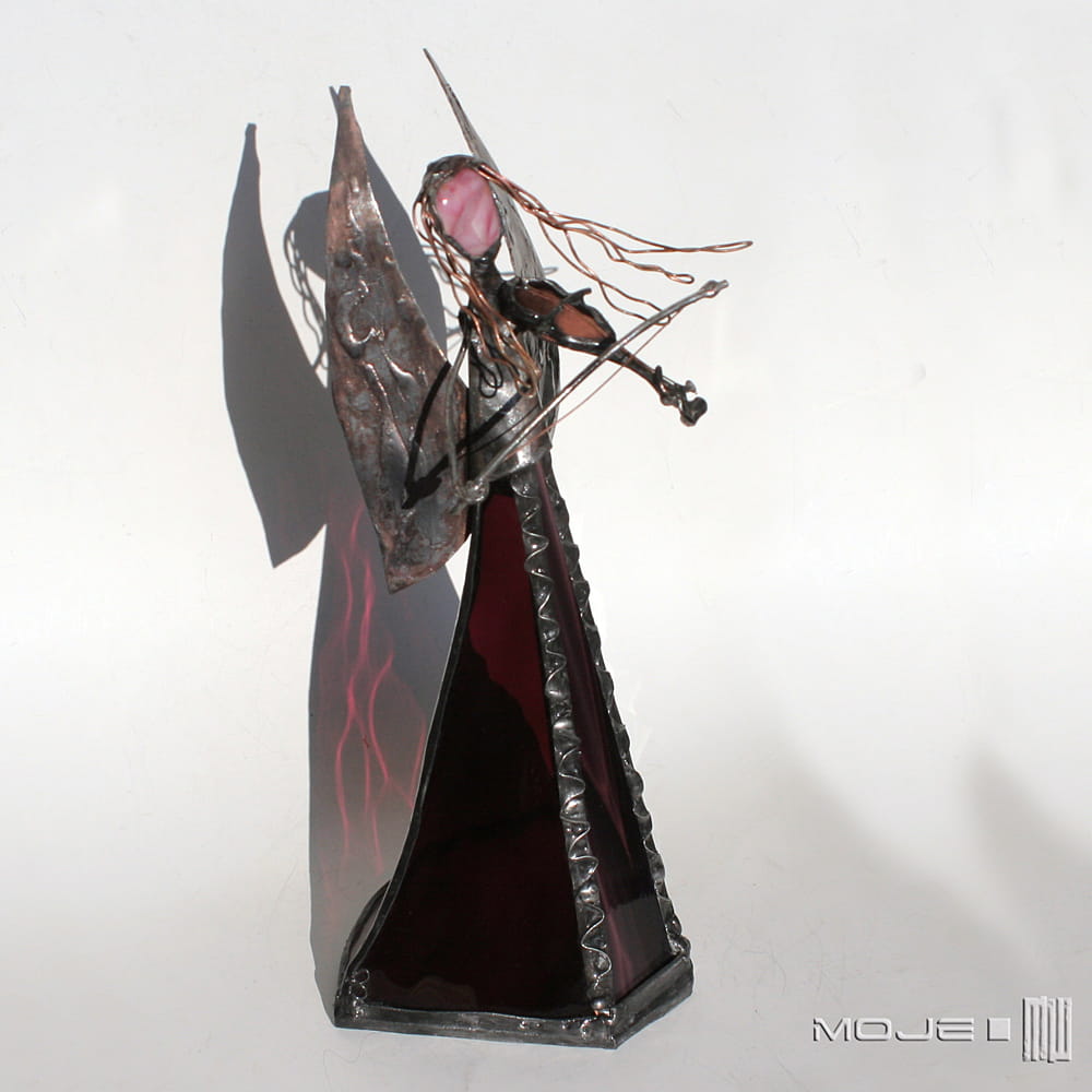 Anioł zrobiony jest z ciemnego szkła witrażowego w kolorach śliwkowych i fioletowych - szkło częściowo przejrzyste, częściowo mleczne. Oprawiony witrażową techniką Tiffany z użyciem miedzi i cyny - patynowany i przecierany. Jego różową główkę zrobiłam metodą fusingu (wypalanie szkła w temp. min. 800 stopni), skrzydła są z miedzianej blachy - również cynowanej i patynowanej. Anioł gra na szklanych skrzypcach...