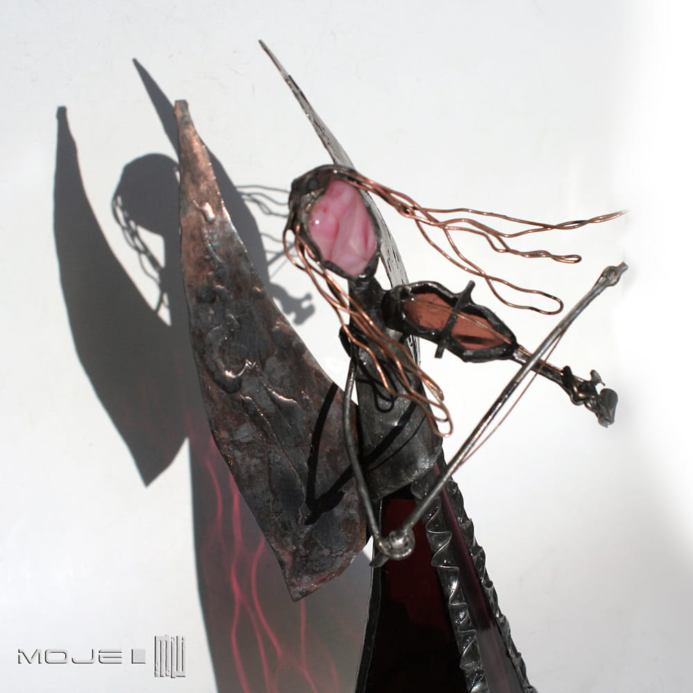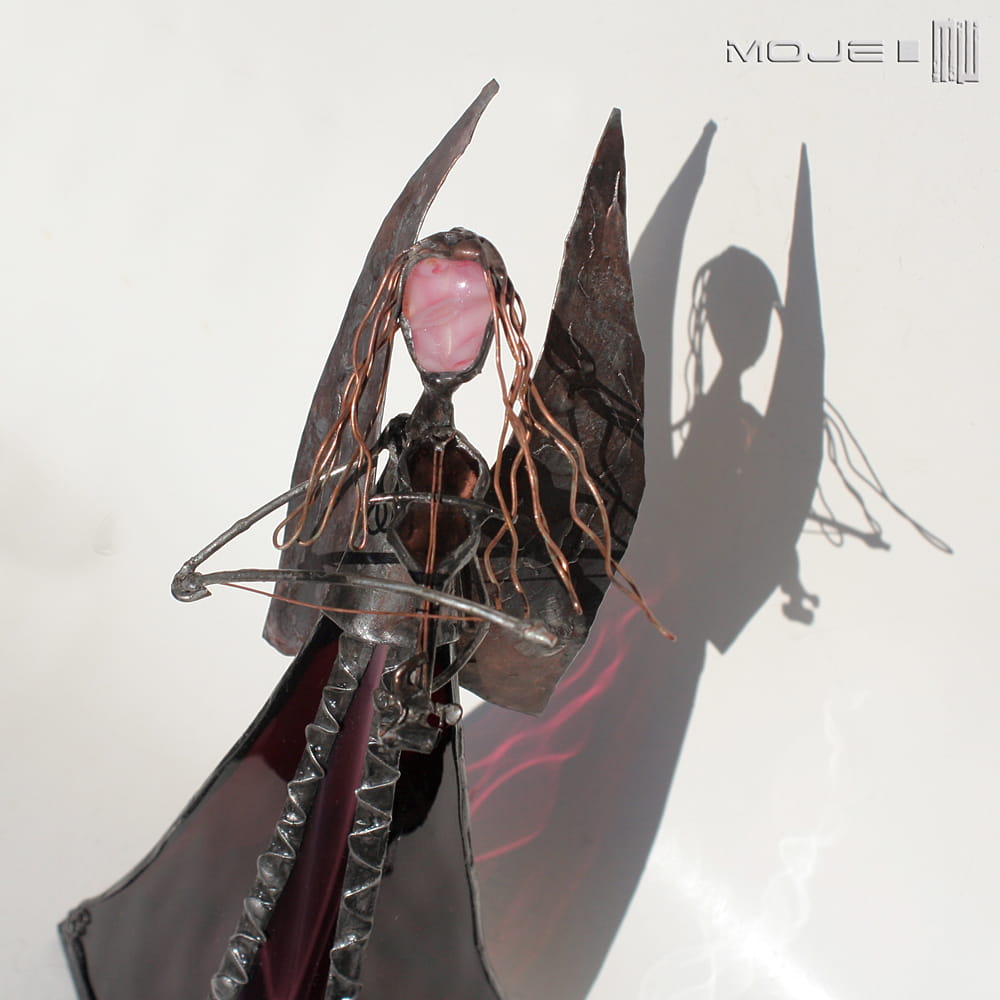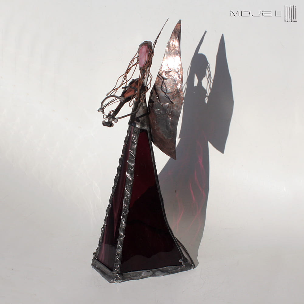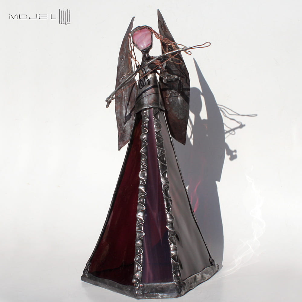 Anioł zrobiony jest z ciemnego szkła witrażowego w kolorach śliwkowych i fioletowych - szkło częściowo przejrzyste, częściowo mleczne. Oprawiony witrażową techniką Tiffany z użyciem miedzi i cyny - patynowany i przecierany. Jego różową główkę zrobiłam metodą fusingu (wypalanie szkła w temp. min. 800 stopni), skrzydła są z miedzianej blachy - również cynowanej i patynowanej. Anioł gra na szklanych skrzypcach...