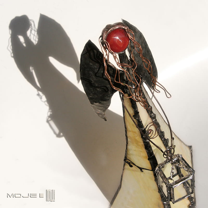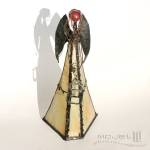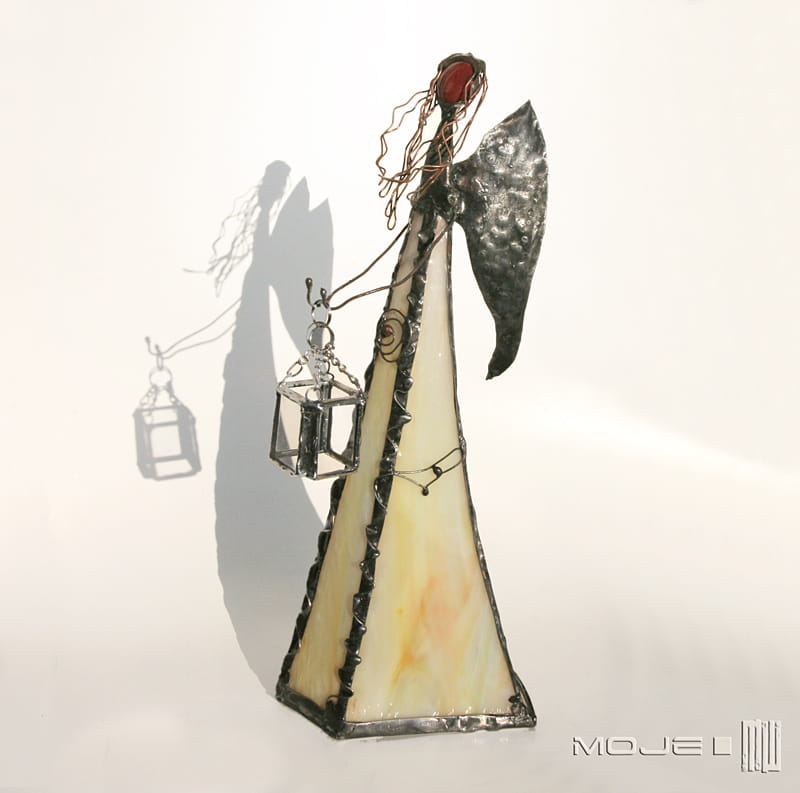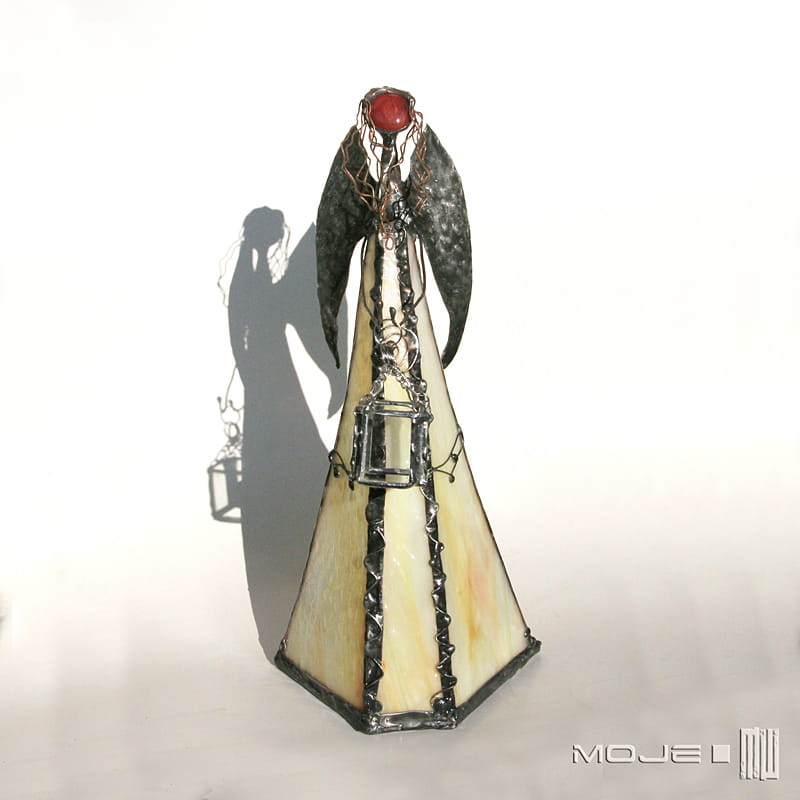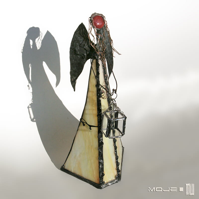 Anioł zrobiony jest z kremowo-żółto-pomarańczowego szkła witrażowego, oprawiony witrażową techniką Tiffany z użyciem miedzi i cyny - patynowany i przecierany. Jego główkę zrobiłam metodą fusingu (wytapianie szkła w temp. min. 800 stopni), skrzydła są z miedzianej blachy - również cynowanej i patynowanej. Anioł trzyma z rękach latarenkę...