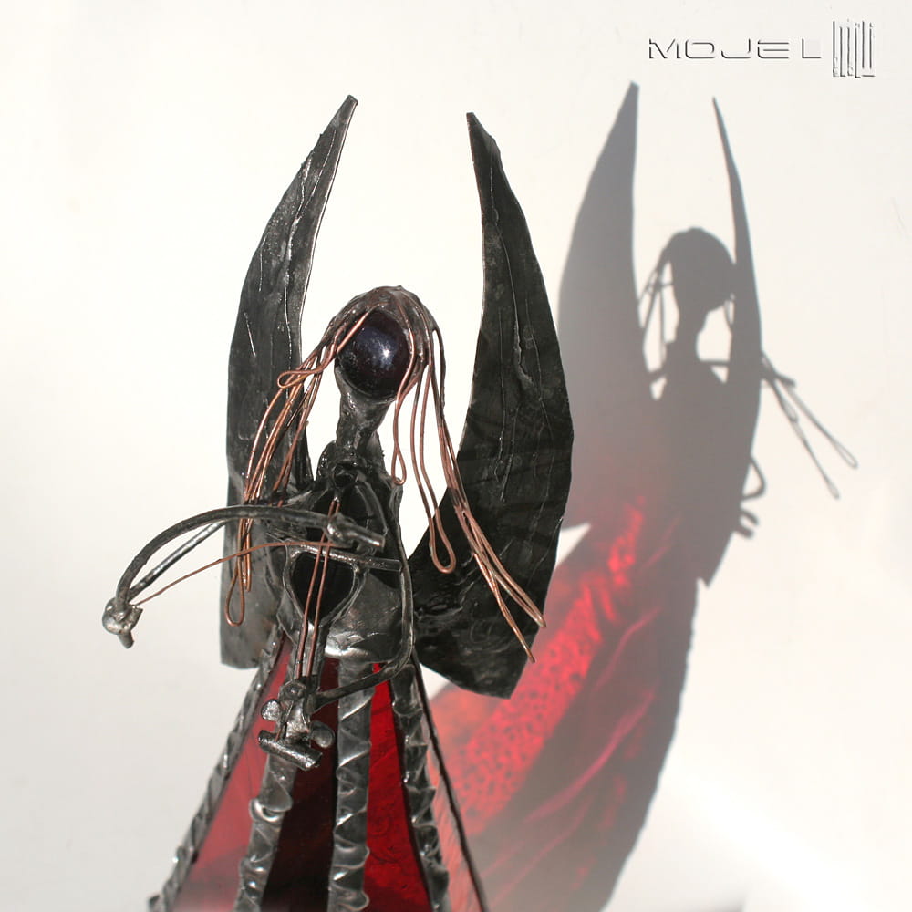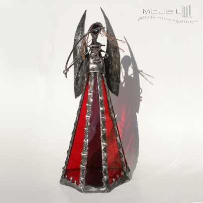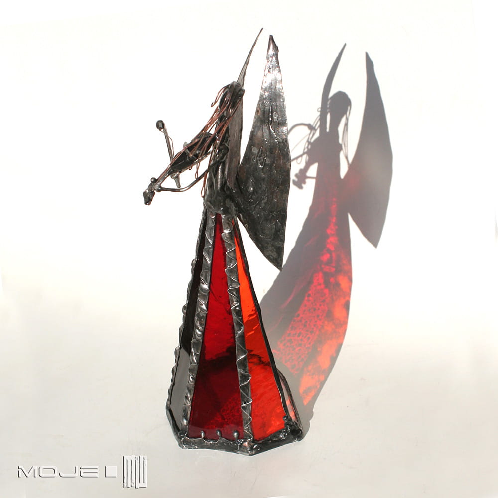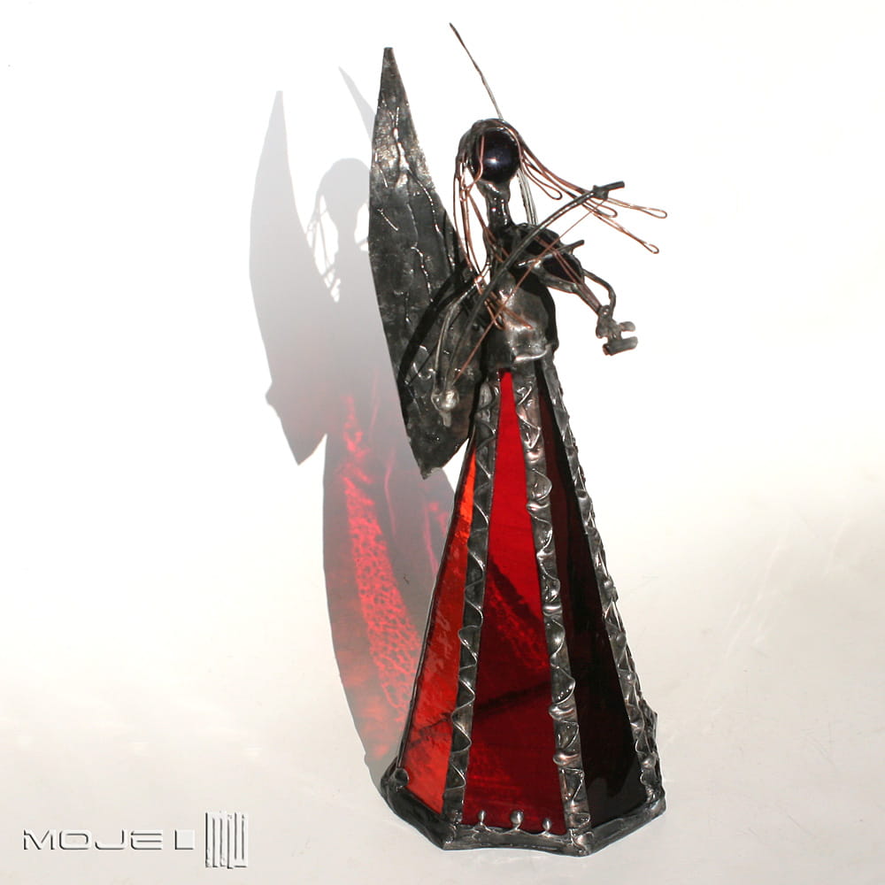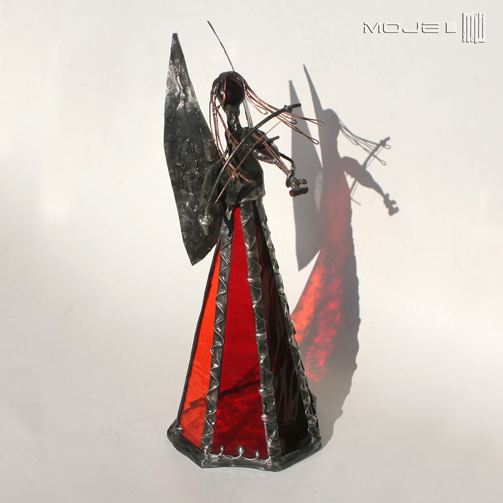Anioł zrobiony jest z pomarańczowego, czerwonego i bordowego szkła witrażowego. Oprawiony witrażową techniką Tiffany z użyciem miedzi i cyny - patynowany i przecierany. Jego główkę zrobiłam metodą fusingu (wypalanie szkła w temp. min. 800 stopni), skrzydła są z miedzianej blachy - również cynowanej i patynowanej. Anioł gra na szklanych skrzypcach...