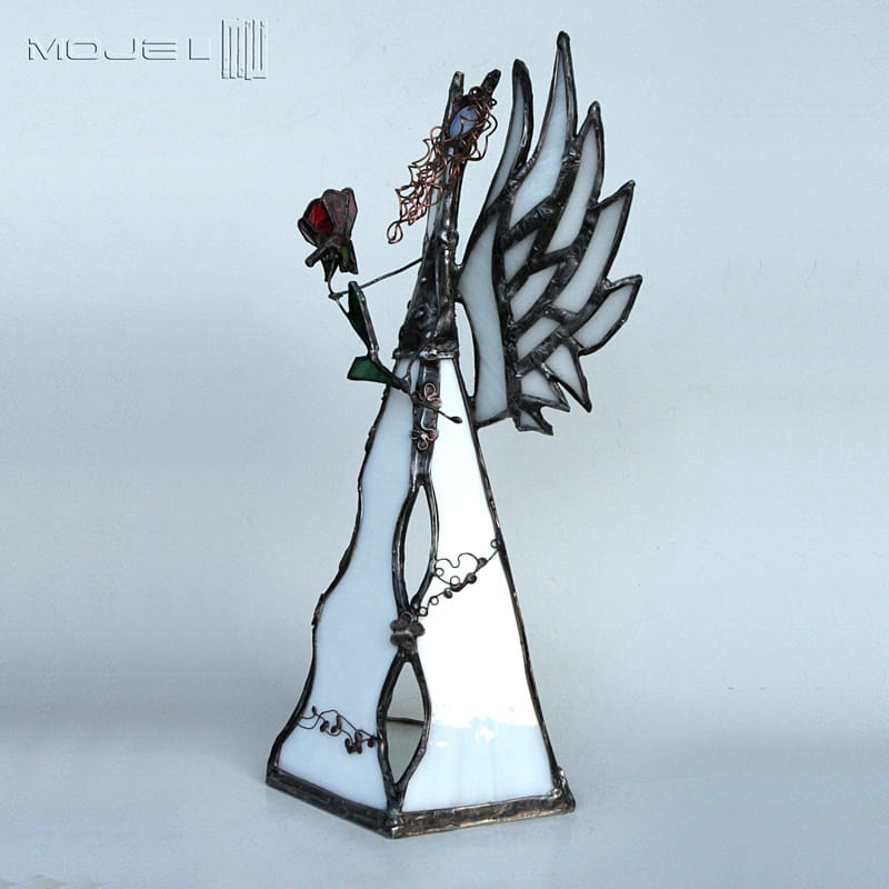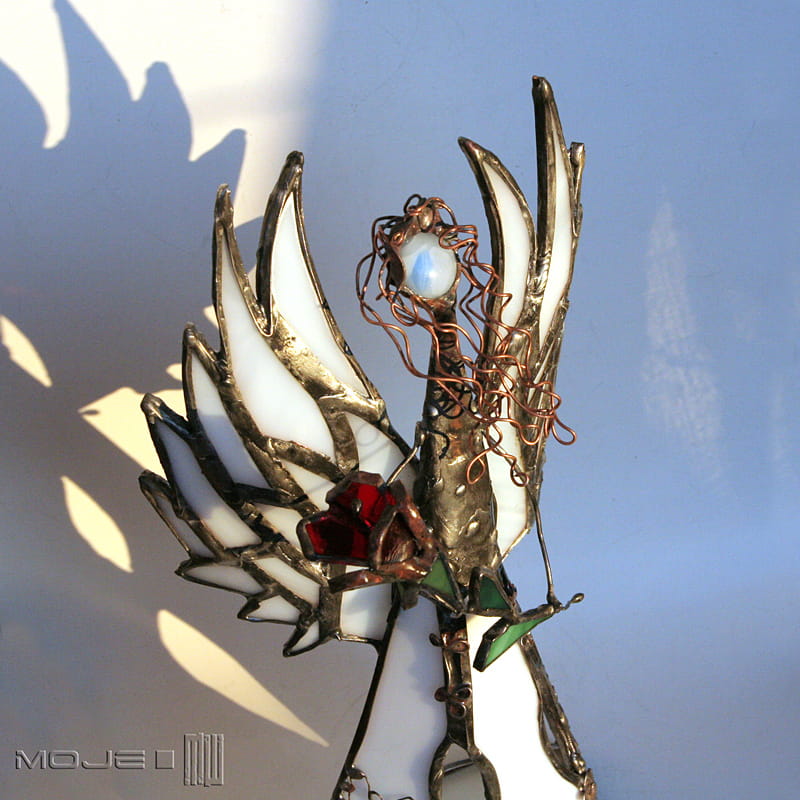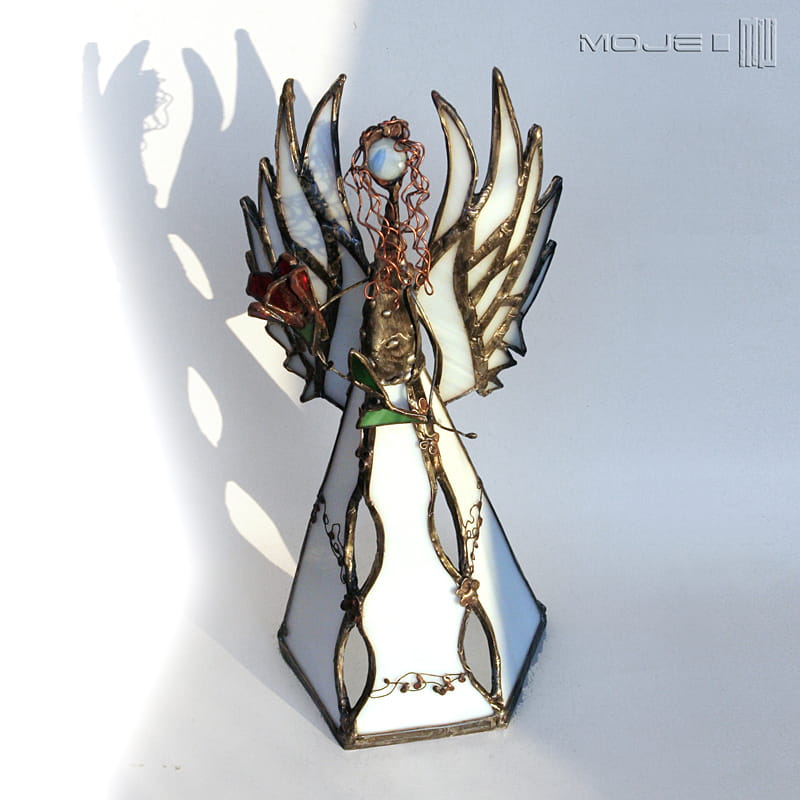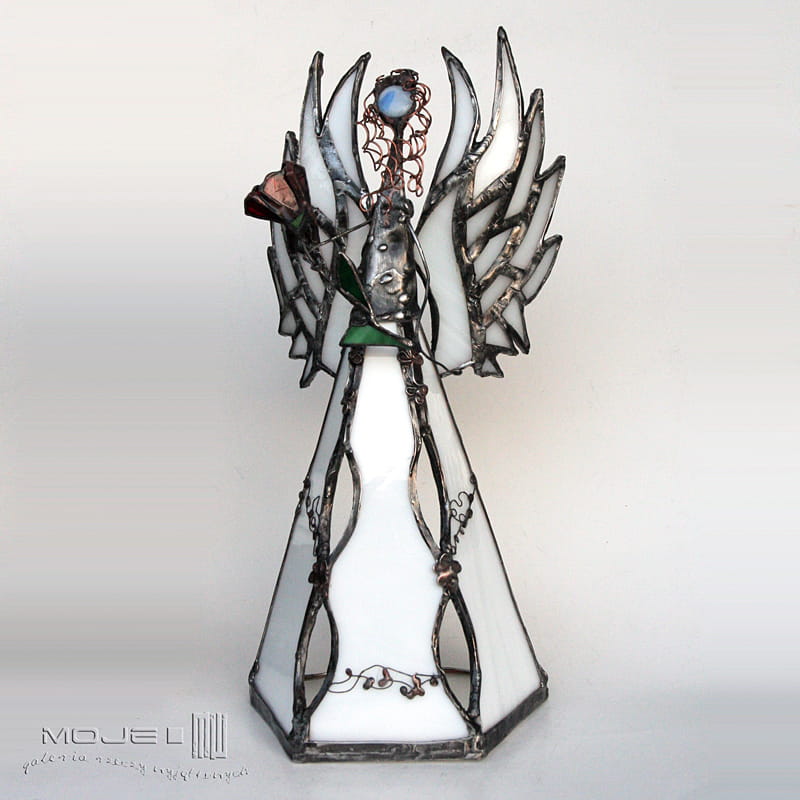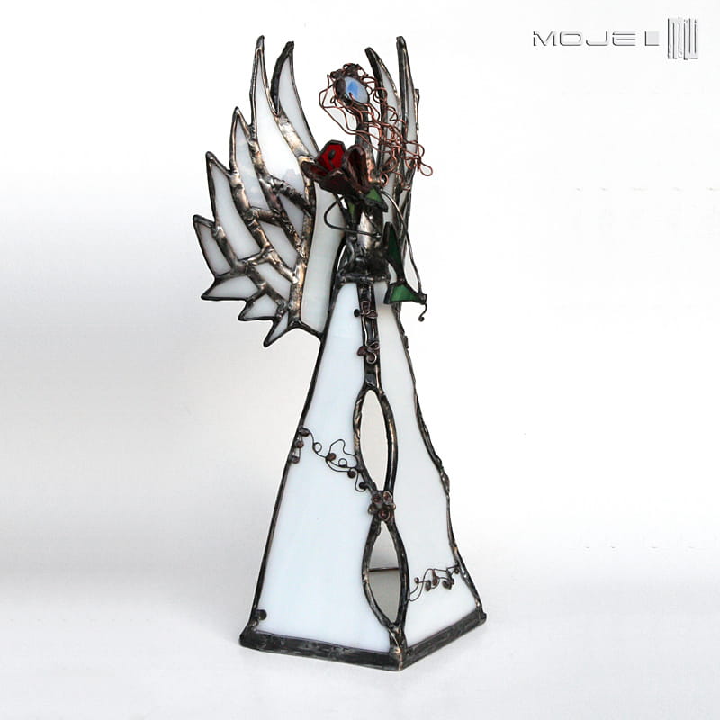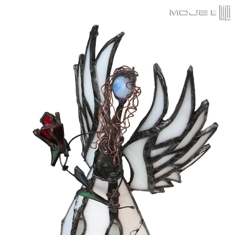 Anioł zrobiony jest z mlecznego białego szkła witrażowego. Oprawiony jest witrażową techniką Tiffany z użyciem miedzi i cyny - patynowany i przecierany. Jego główkę zrobiłam metodą fusingu (wypalanie szkła w temp. min. 800 stopni). Skrzydła są także pracowicie zrobione z białego szkła, anioł trzyma bordowy szklany kwiat. Podstawka z bezbarwnego szkła.