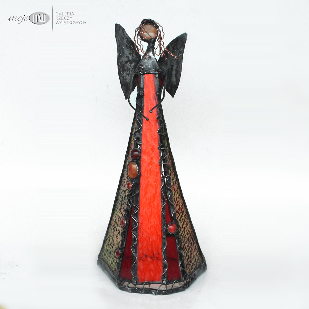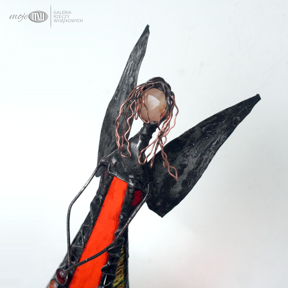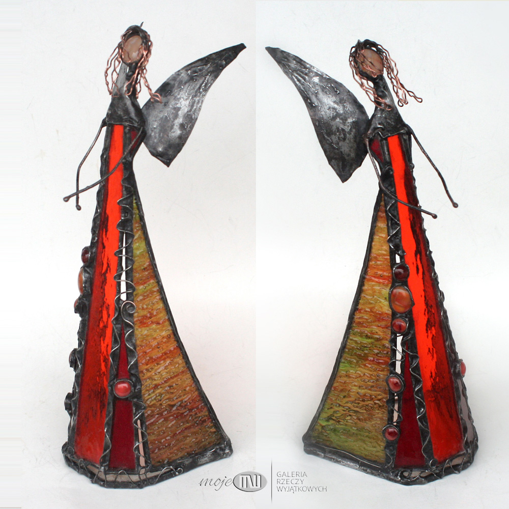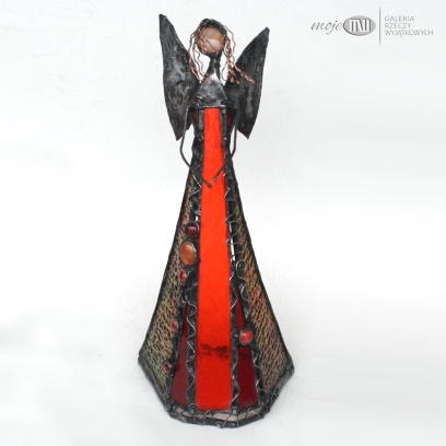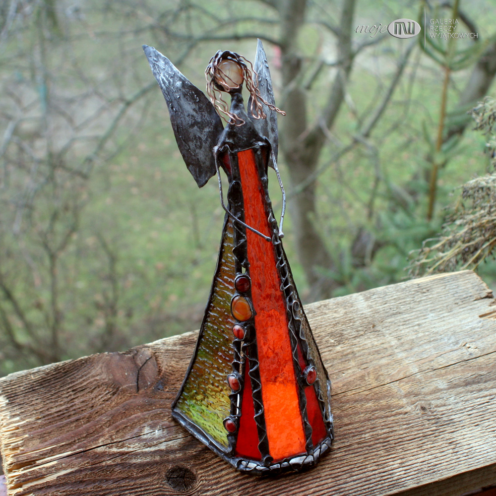Anioł zrobiony jest ze szkła witrażowego, przejrzystego i półprzejrzystego, w kolorach pomarańczowym i w oliwkowo-brązowym melanżu z wyraźną fakturą. Dodatkową ozdobą są szklane guzy wytopione przeze mnie metodą fusingu. Oprawiony witrażową techniką Tiffany z użyciem miedzi i cyny - patynowany. Skrzydła są z miedzianej blachy - również cynowanej i patynowanej.