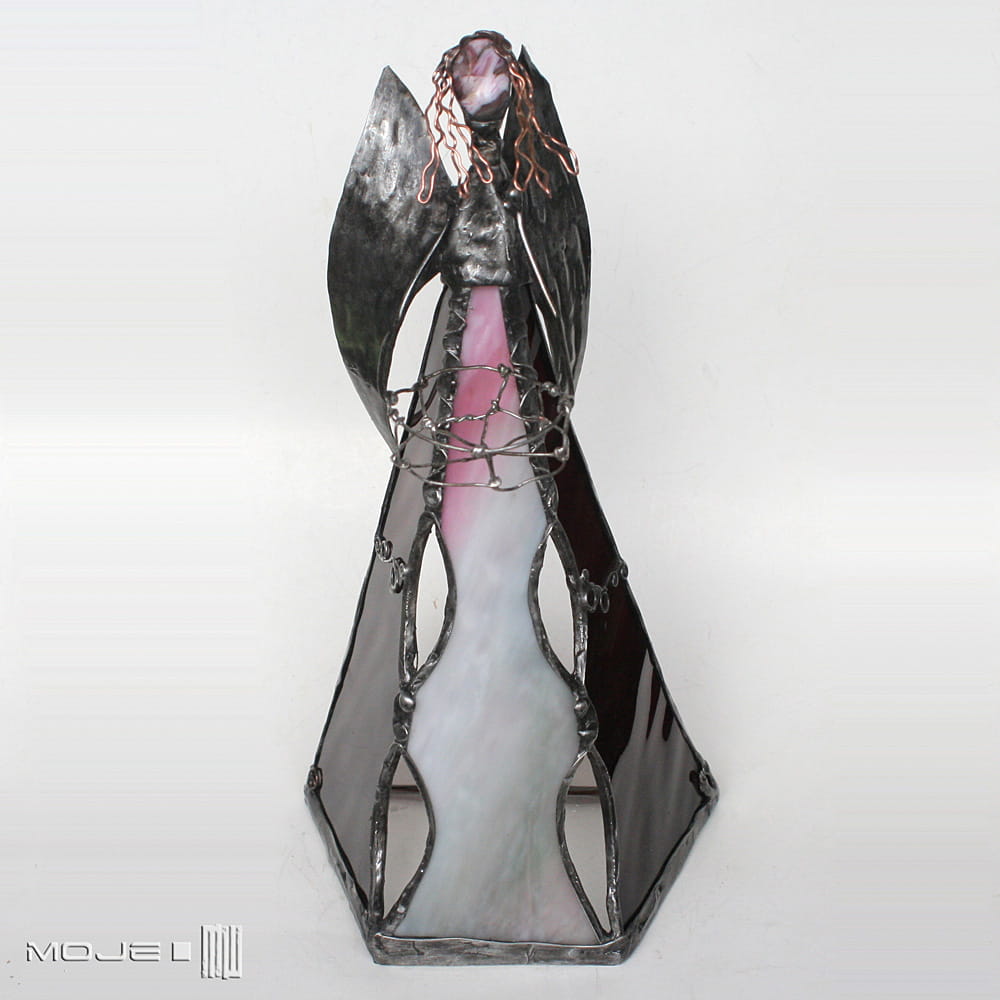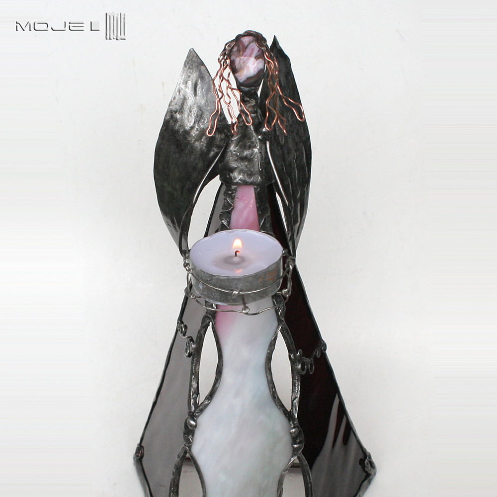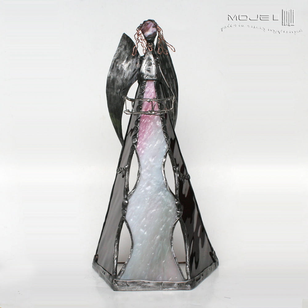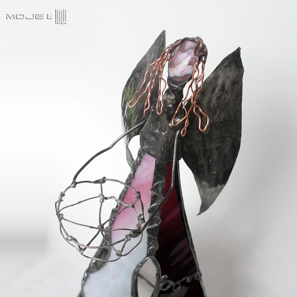 Anioł zrobiony jest ze śliwkowego przejrzystego oraz szaroróżowego gęstego szkła witrażowego z fakturą, oprawiony witrażową techniką Tiffany z użyciem miedzi i cyny - patynowany i przecierany. Jego główkę zrobiłam metodą fusingu (wypalanie szkła w temp. min. 800 stopni), skrzydła są z miedzianej blachy - również cynowanej i patynowanej. Podstawka z bezbarwnego szkła.