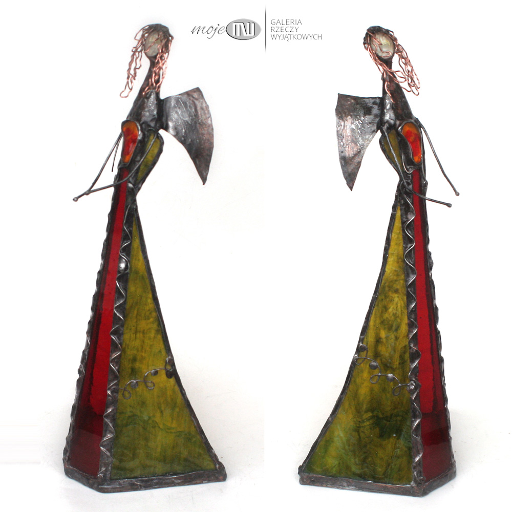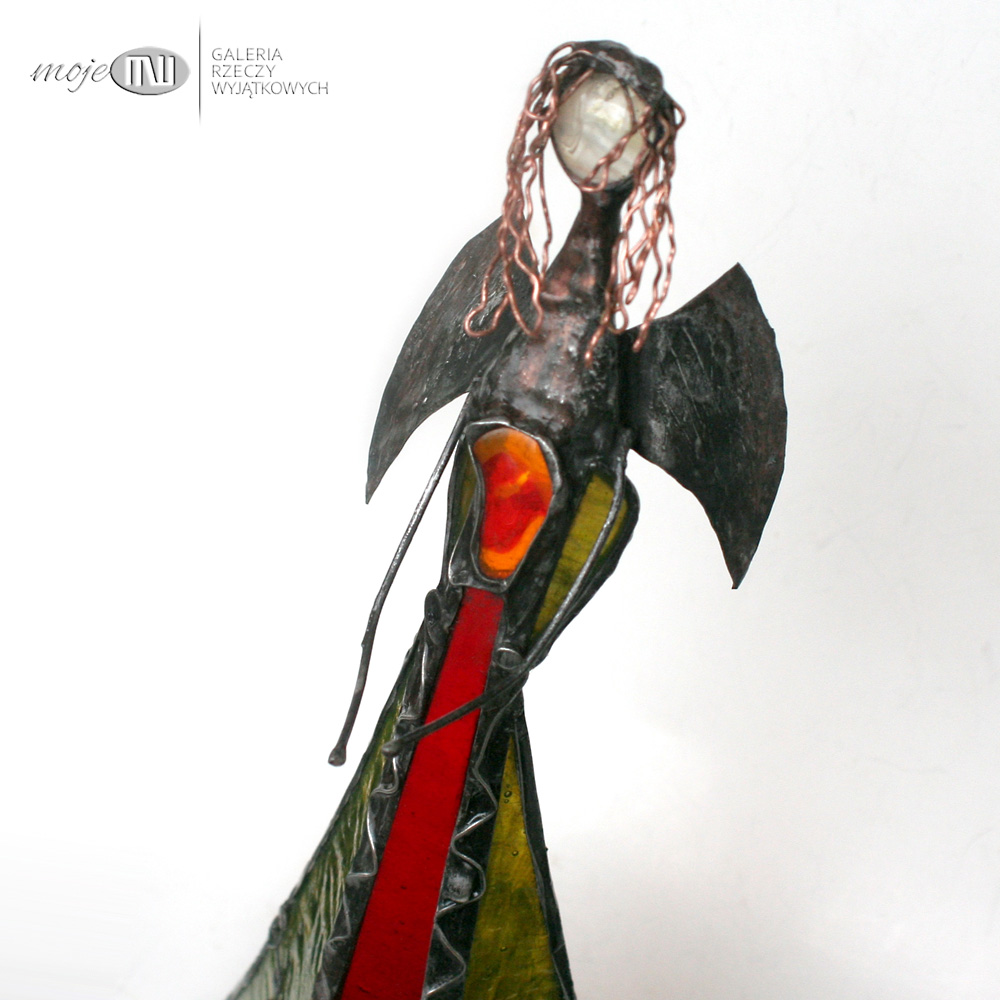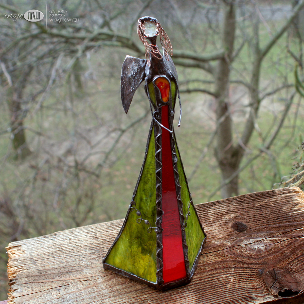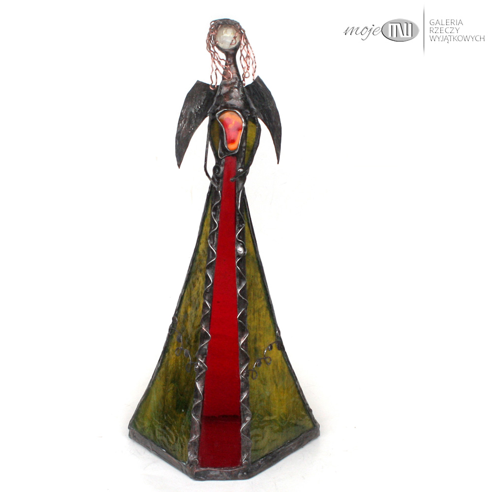 Anioł zrobiony jest ze szkła witrażowego, przejrzystego i półprzejrzystego, w kolorach czerwonym i w oliwkowo-zielonym z delikatną fakturą. Oprawiony witrażową techniką Tiffany z użyciem miedzi i cyny - patynowany. Skrzydła są z miedzianej blachy - również cynowanej i patynowanej.