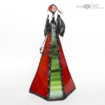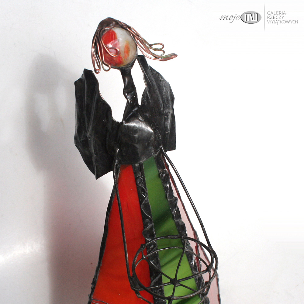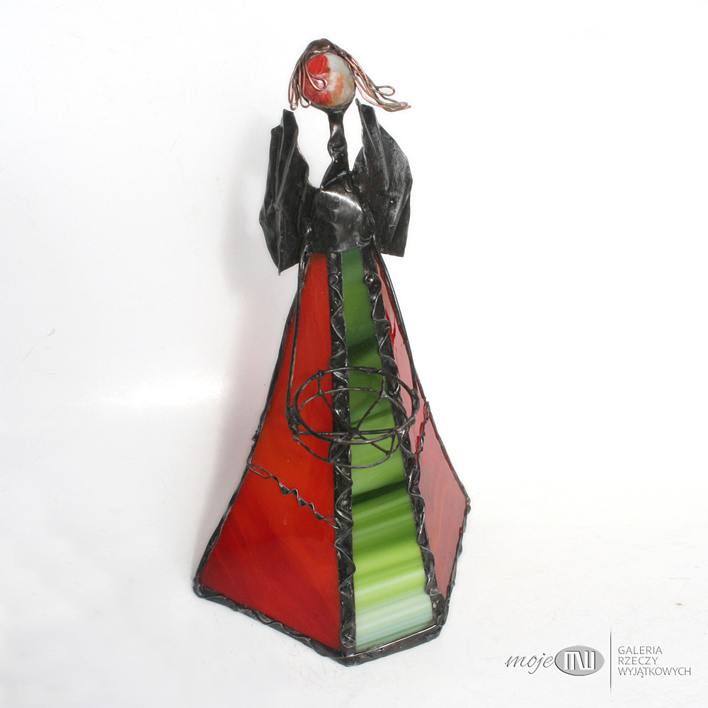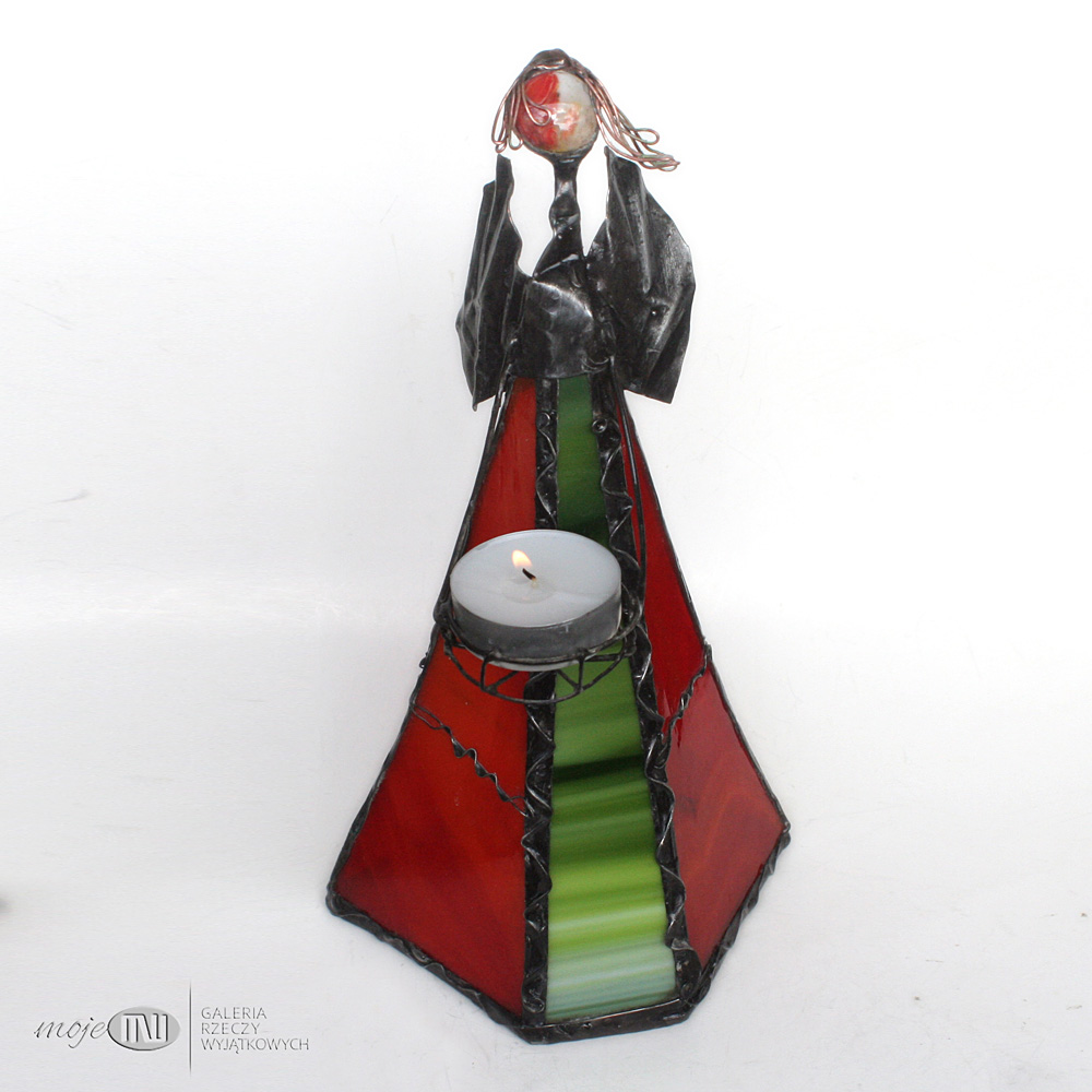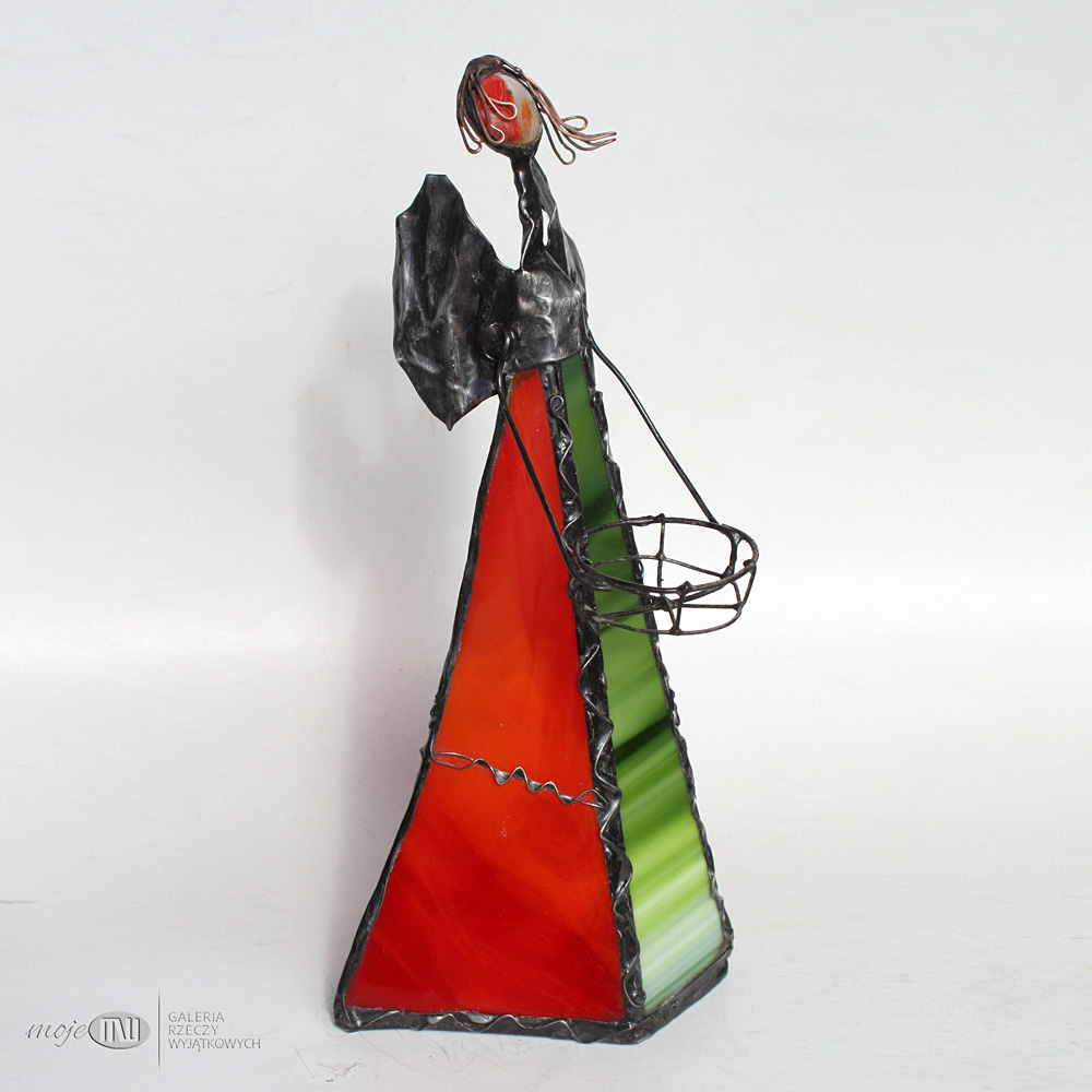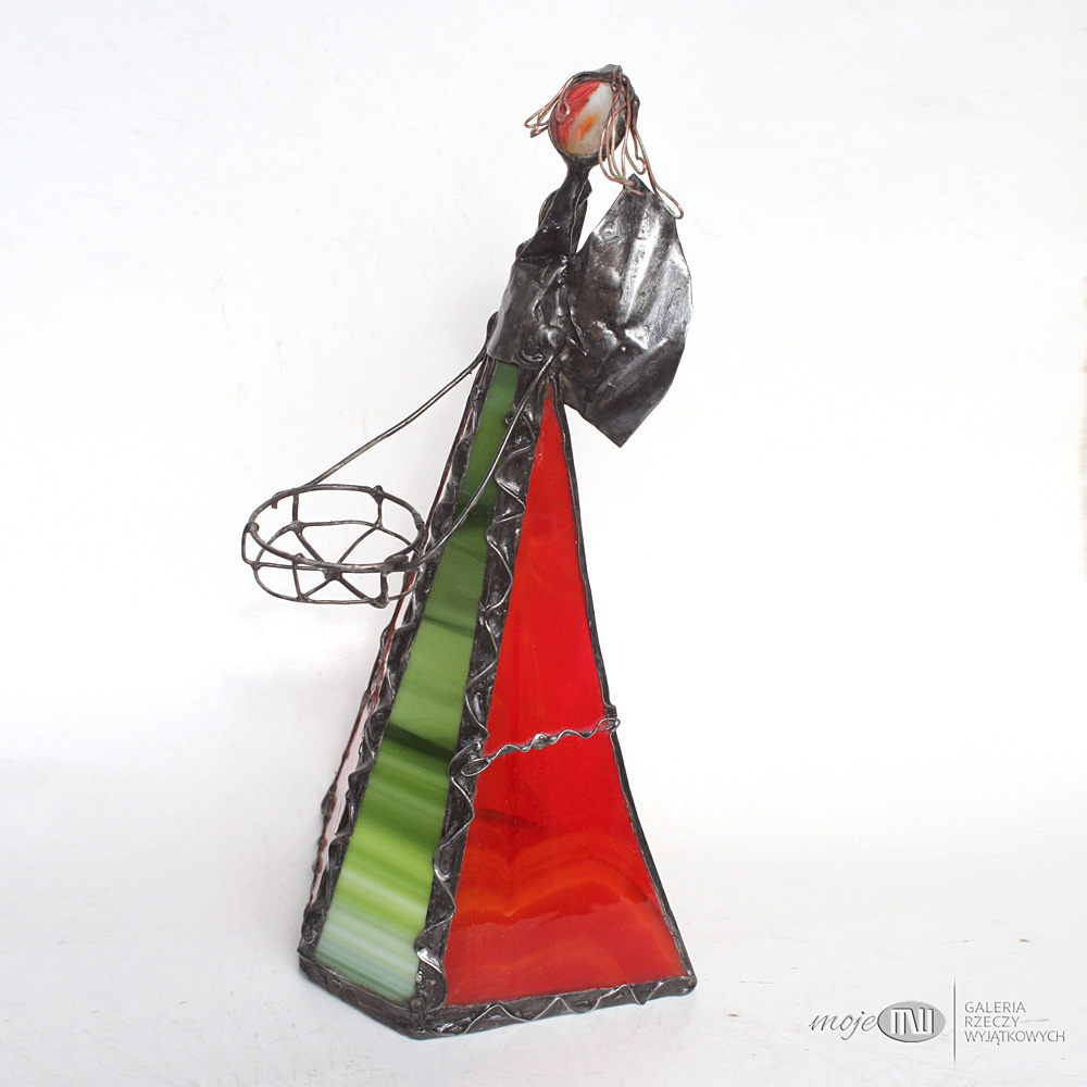 Anioł zrobiony jest ze szkła witrażowego w kontrastowych kolorach czerwieni i zieleni. Oprawiony witrażową techniką Tiffany z użyciem miedzi i cyny - patynowany. Jego główkę zrobiłam metodą fusingu (wypalanie szkła w temp. min. 800 stopni), skrzydła są z miedzianej blachy - również cynowanej i patynowanej. Anioł trzyma koszyczek, do którego można włożyć świeczkę-podgrzewacz.