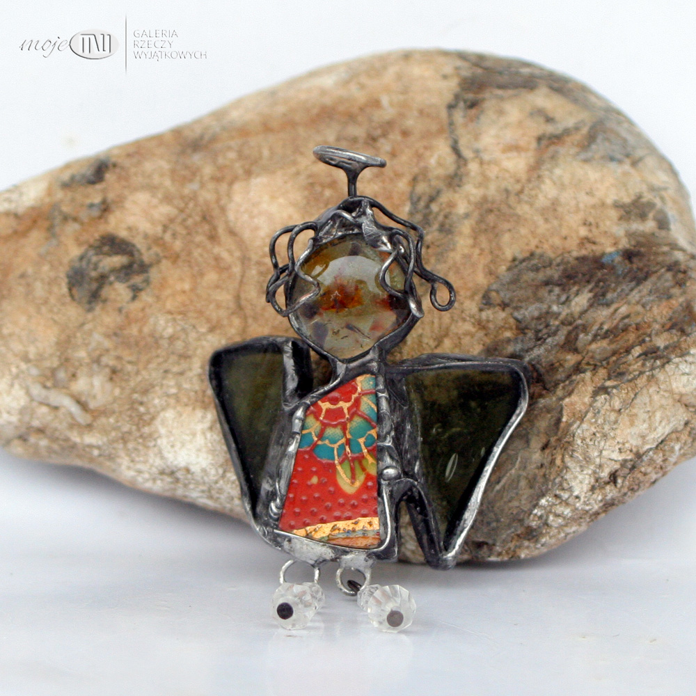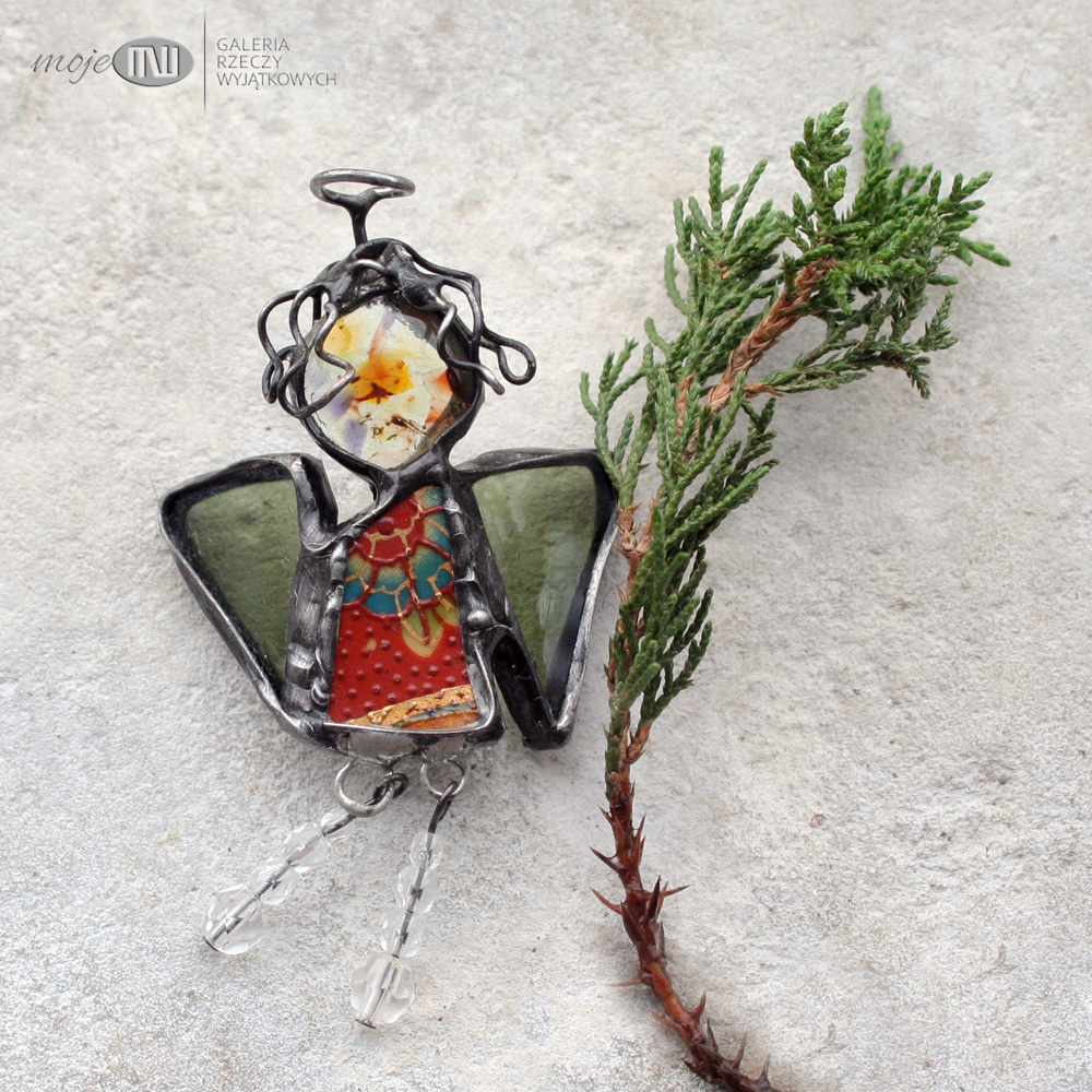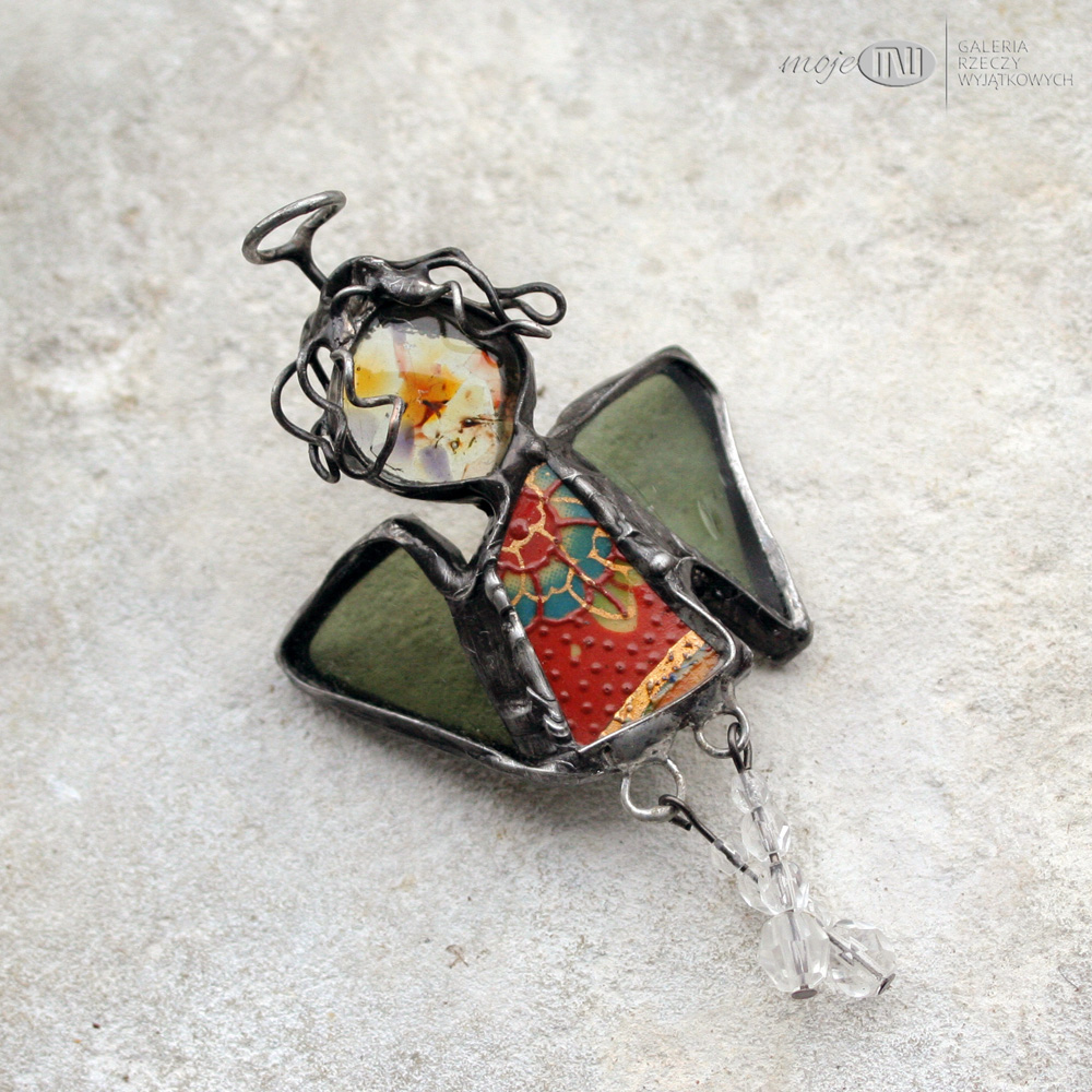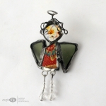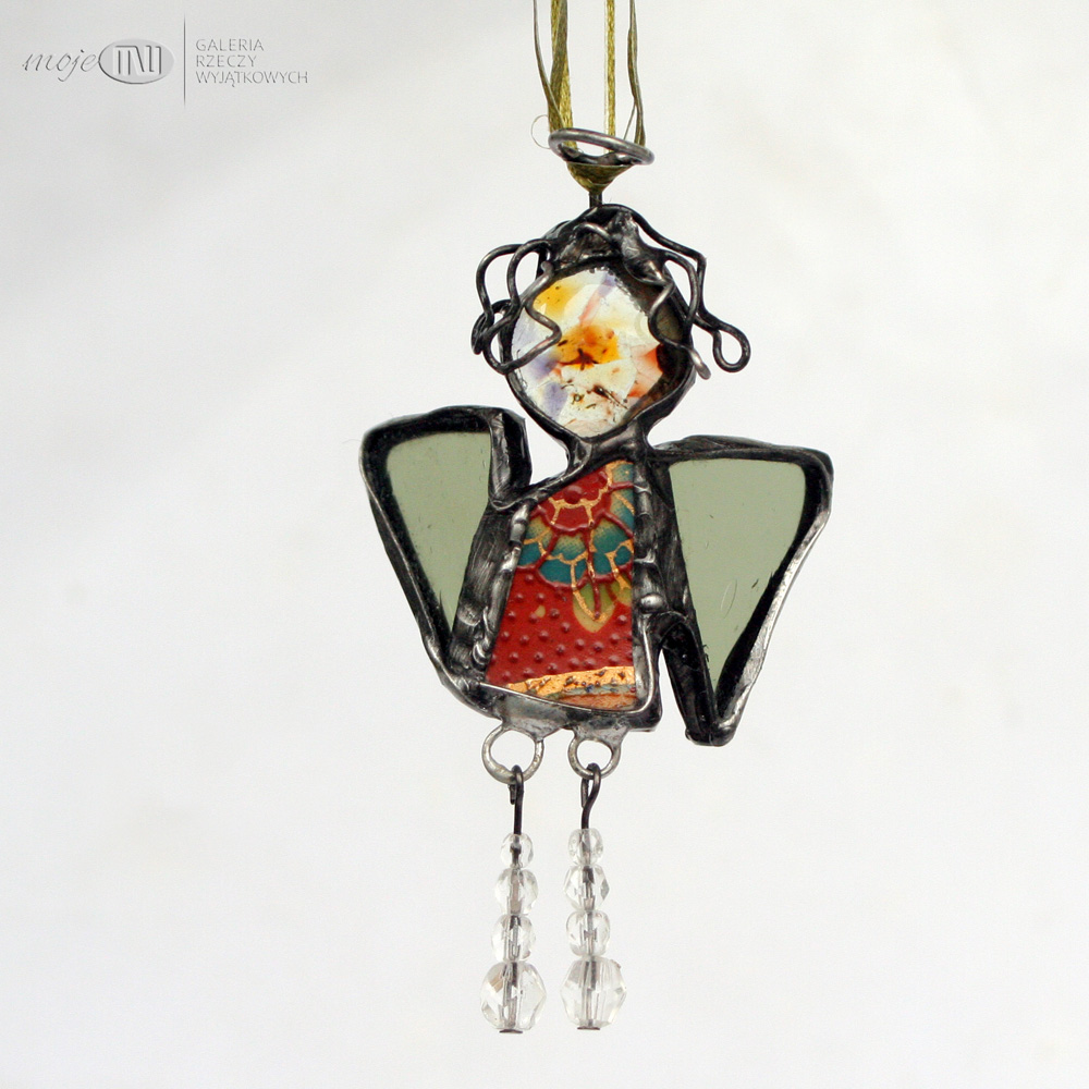 Anioł zrobiony jest z fragmentu porcelanowego wazonu oraz zielonego przejrzystego szkła witrażowego, oprawiony witrażową techniką Tiffany z użyciem miedzi i cyny. Jego główkę zrobiłam metodą fusingu (wypalanie szkła w temp. 800 stopni), ma koralikowe nóżki.