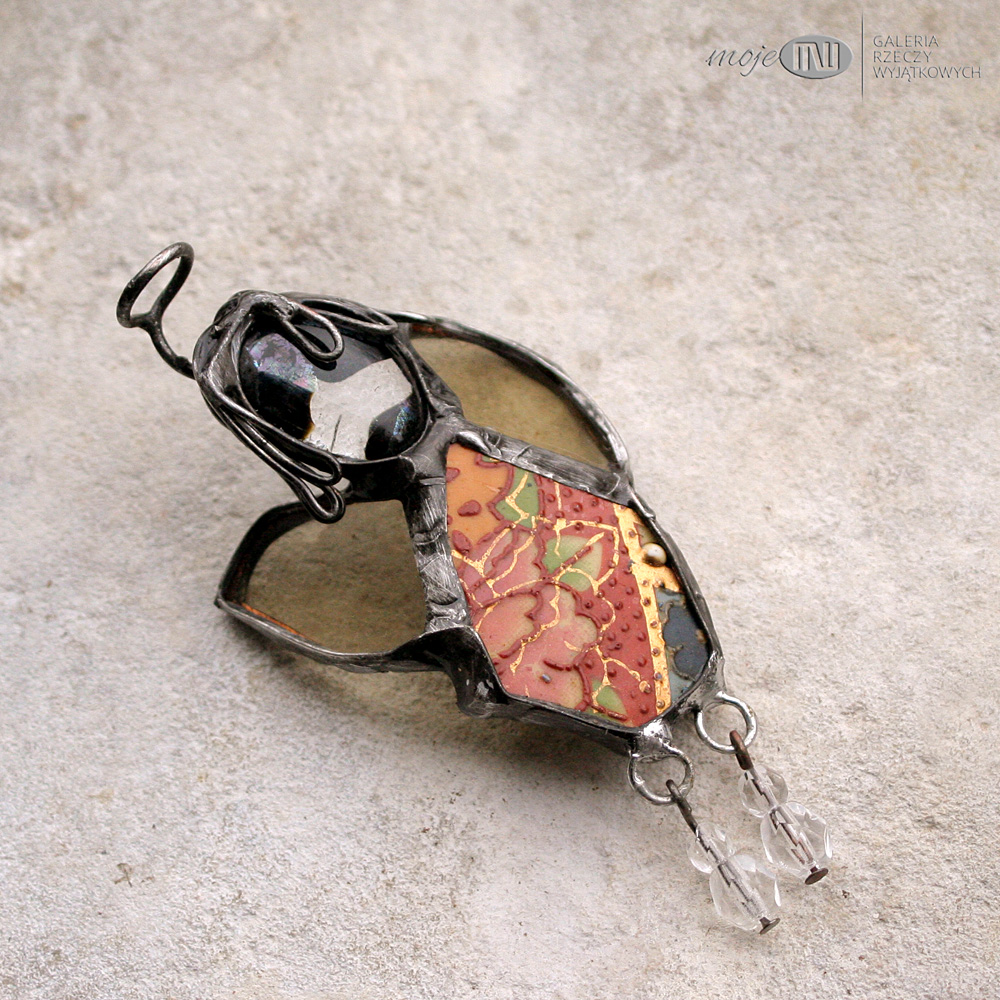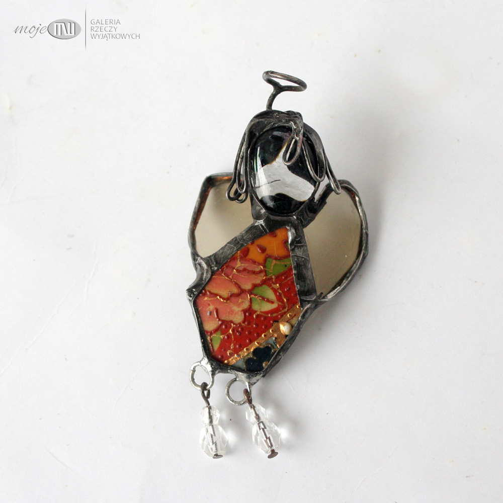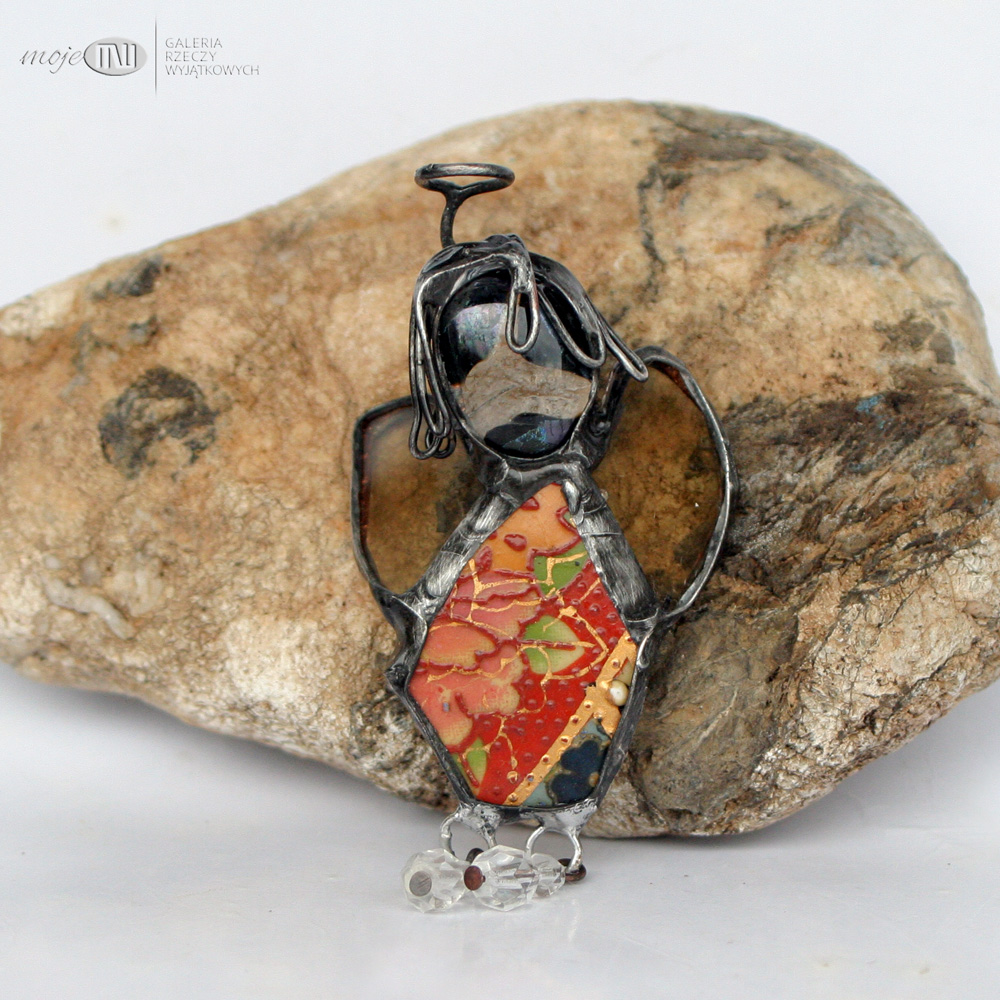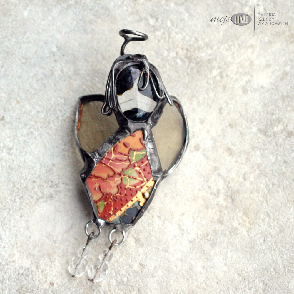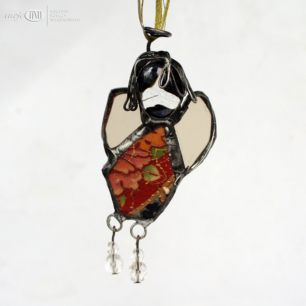 Anioł zrobiony jest z fragmentu porcelanowego wazonu oraz beżowego przejrzystego szkła witrażowego, oprawiony witrażową techniką Tiffany z użyciem miedzi i cyny. Jego główkę zrobiłam metodą fusingu (wypalanie szkła w temp. 800 stopni), ma koralikowe nóżki.