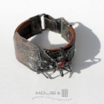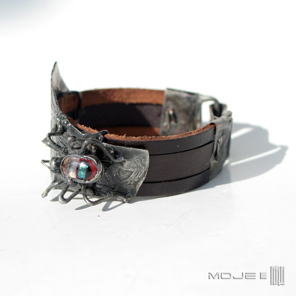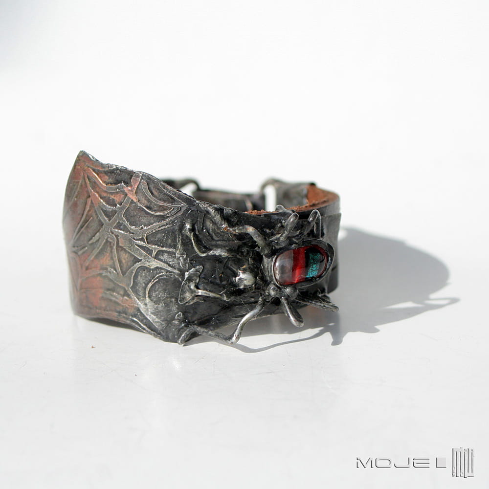 Bransoleta z trawionej miedzianej blachy i skórzanych rzemieni. Na nieregularnej blasze wytrawione są wzory nawiązujące do pajęczyny, a głównym elementem jest trójwymiarowy pająk. Jego tułów wytopiłam metodą fusingu ze szkła, oprawiony i wykończony jest miedzią. Miedź pokryta jest cyną, patynowaną i przecieraną dla wydobycia wzorów. Bazą maneli są płaskie skórzane rzemienie w odcieniach ciemnego brązu o szerokości 10 i 5 mm.