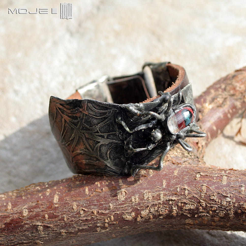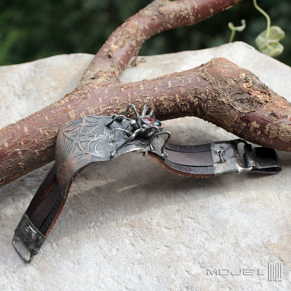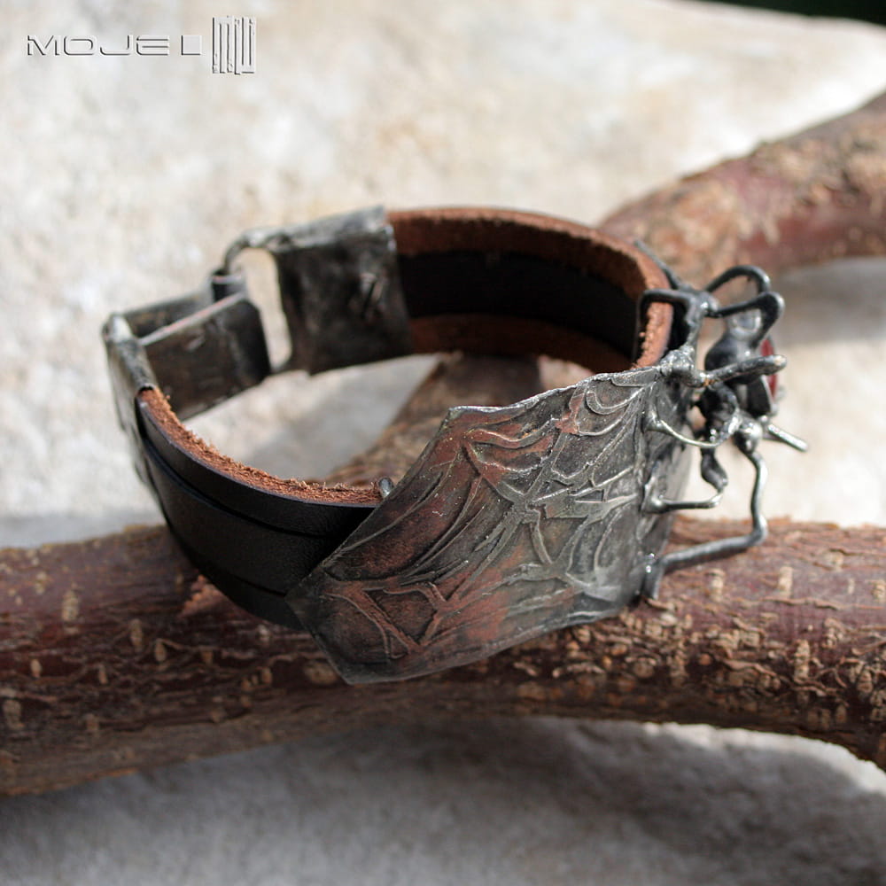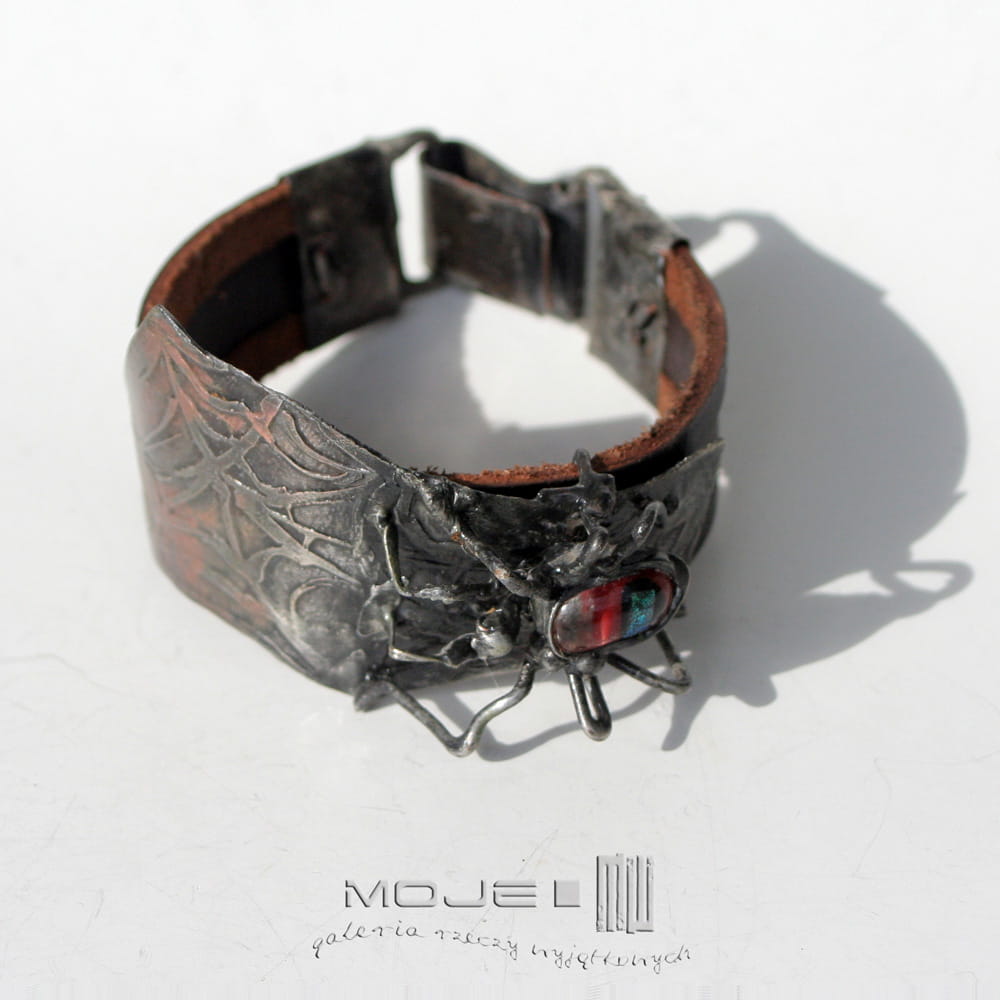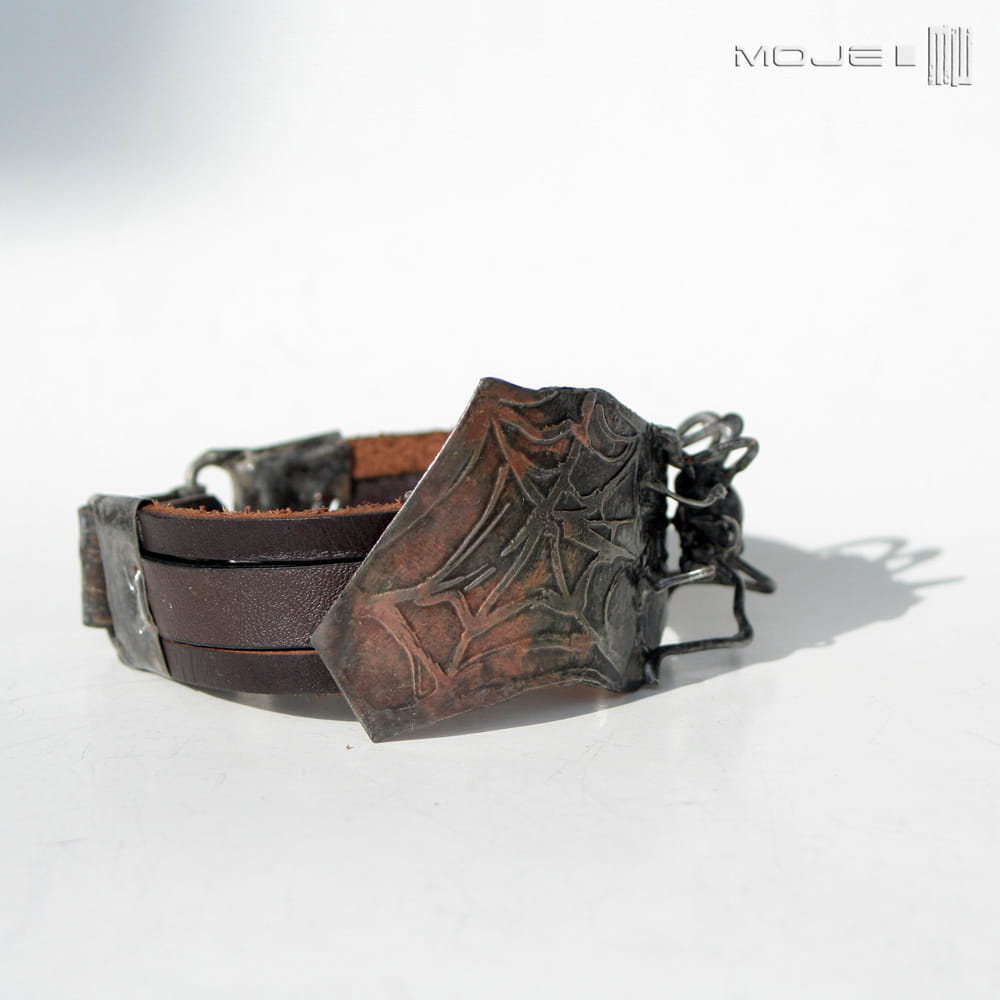 Bransoleta z trawionej miedzianej blachy i skórzanych rzemieni ze stylizowanym pająkiem.