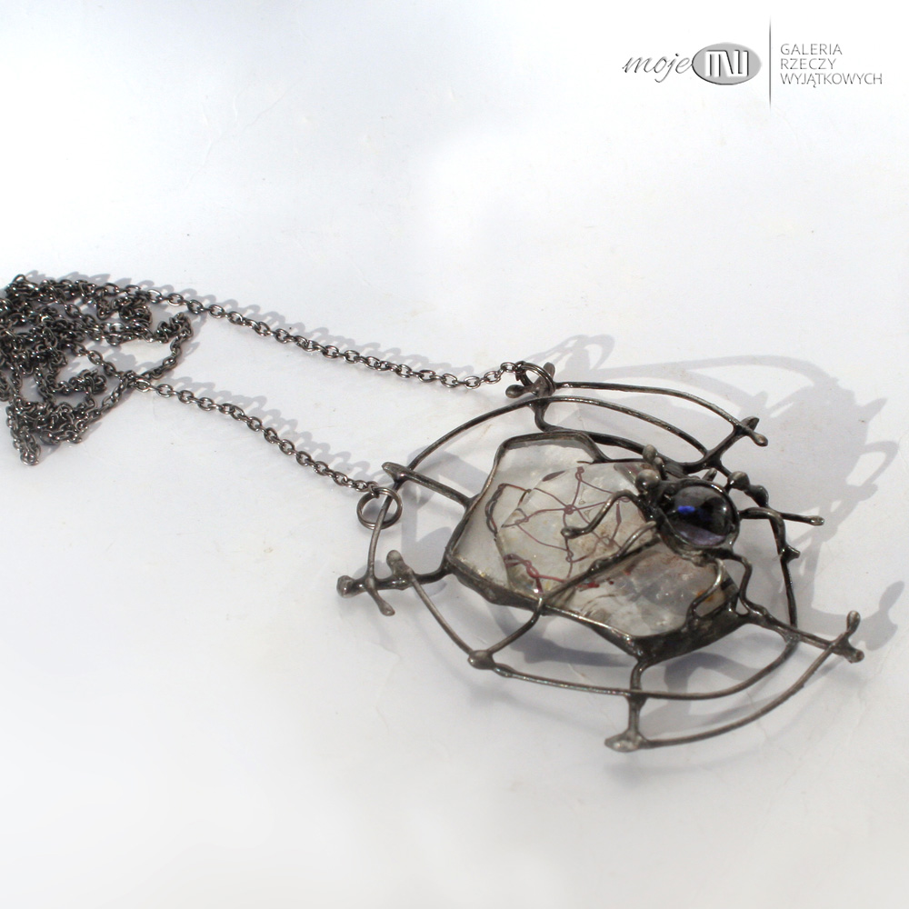 Wisior ze szkła i miedzi z pająkiem na pajęczynie.