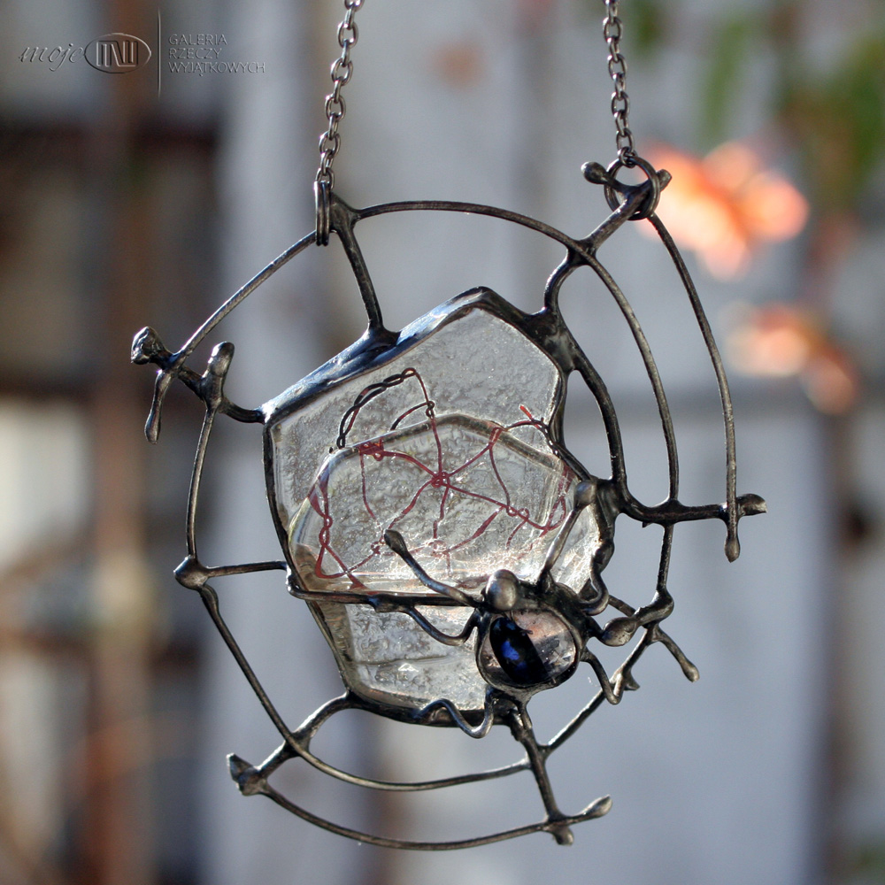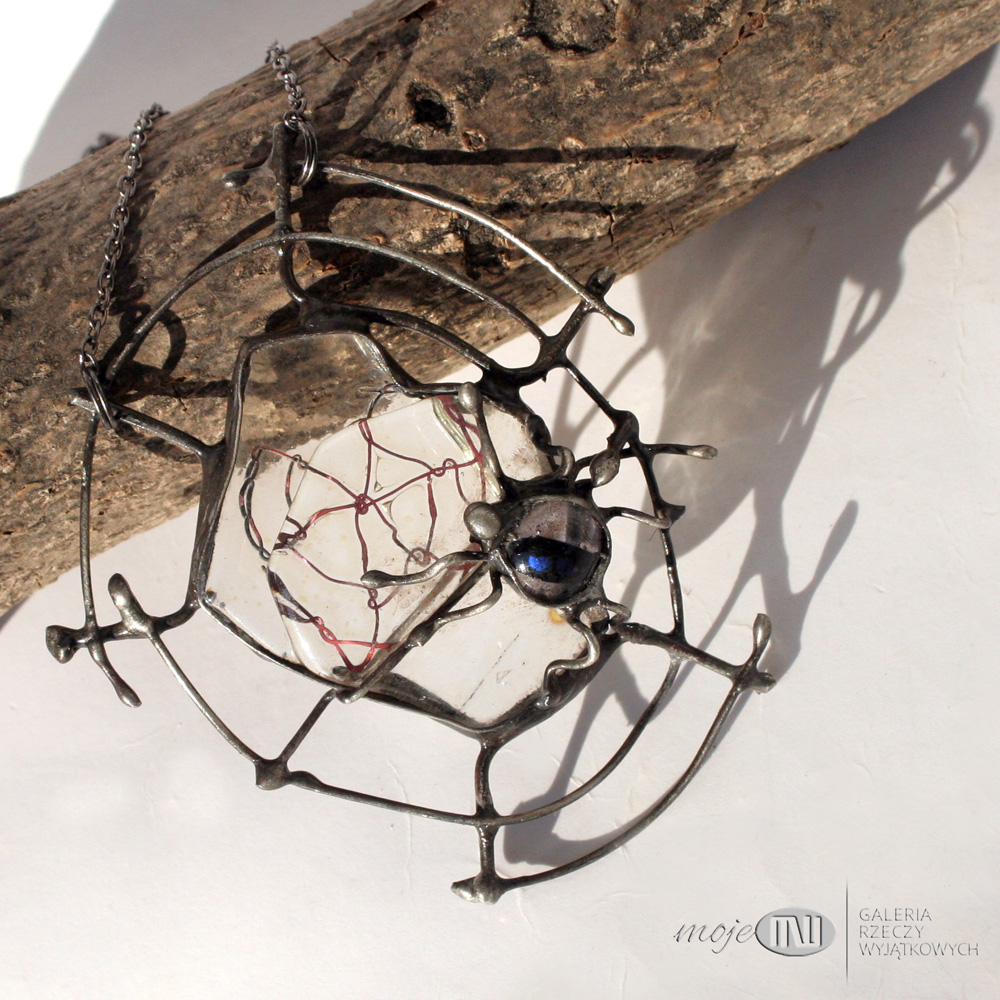 Charakterystyczny i niepowtarzalny wisior ze szkła i miedzi. Dichroiczny pająk siedzi na swej szklano-miedzianej pajęczynie i czeka na ofiarę...