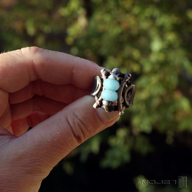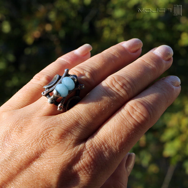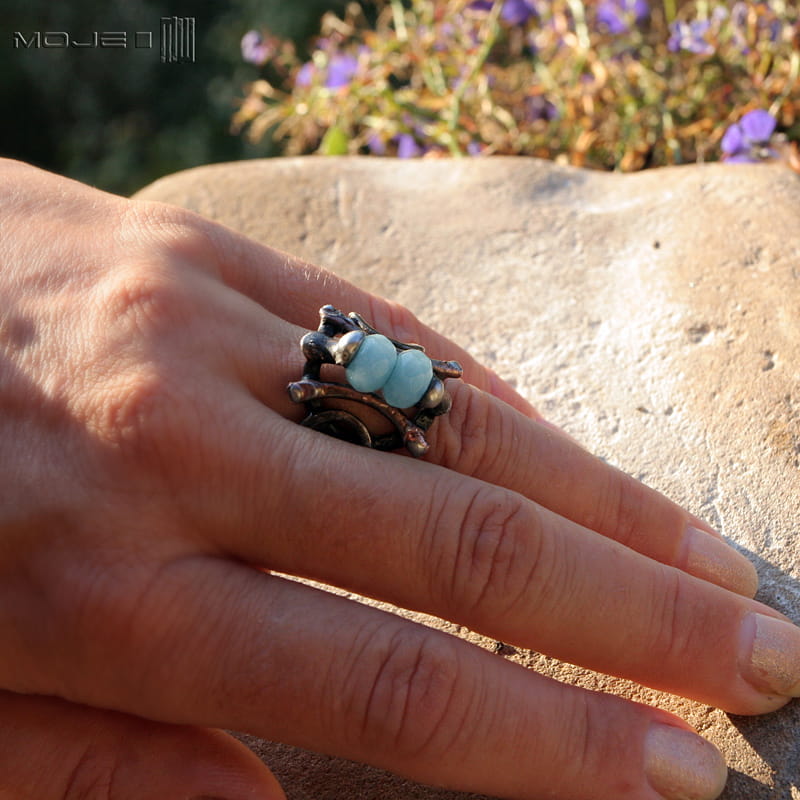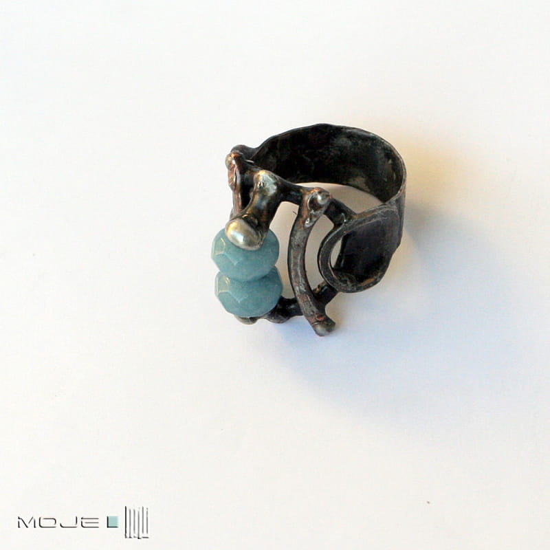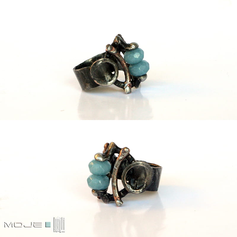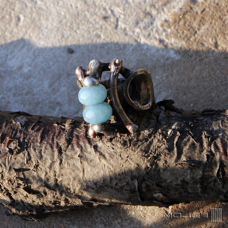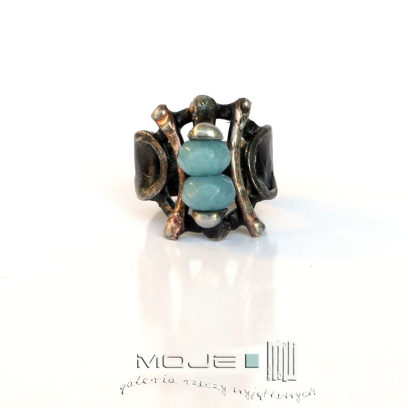 Fantazyjny pierścionek z fasetowanymi koralami bladoniebieskiego awenturynu. Zrobiłam go z miedzi - młotkowanej, cynowanej, patynowanej i przecieranej. Na palcu prezentuje się okazale i niebanalnie.