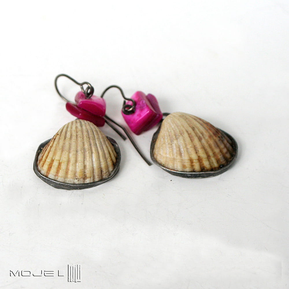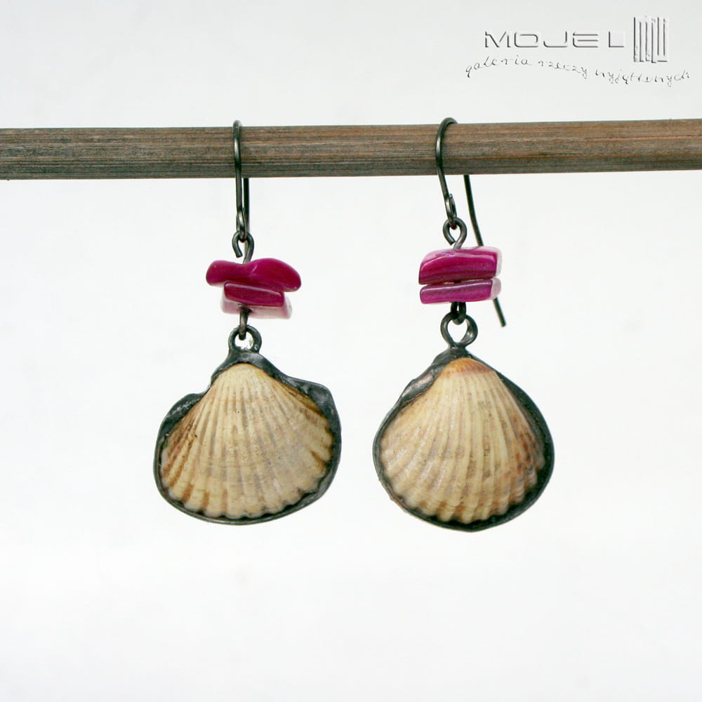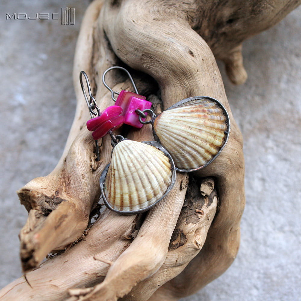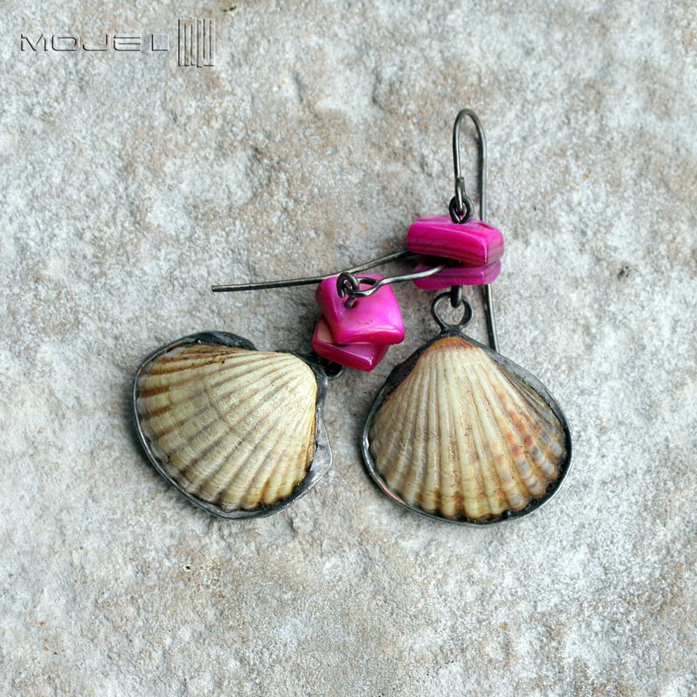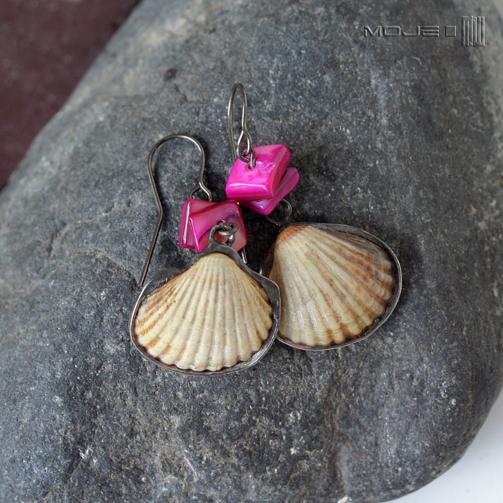 Oprawiłam je w miedź pokrytą cyną, patynowaną i lekko przetartą. Koloru dodają im plastry z różowej masy perłowej. Zawieszone są na metalowym biglu w kolorze grafitowym. Kolczyki są leciutkie, a bałtyckie muszelki są kruche, więc trzeba się obchodzić z nimi ostrożnie :)