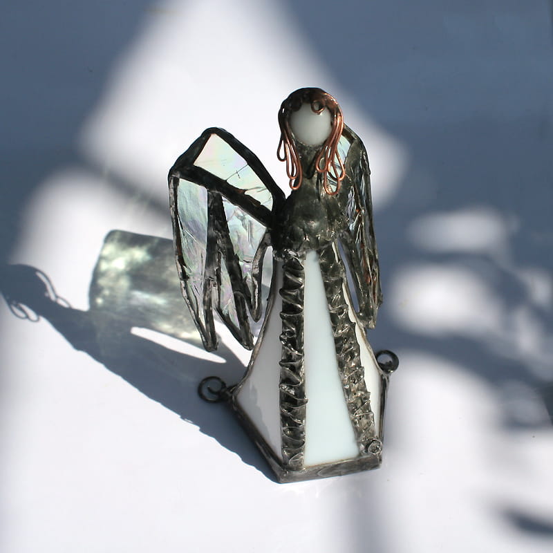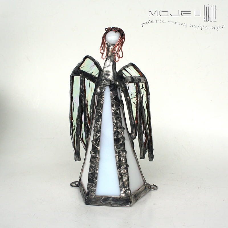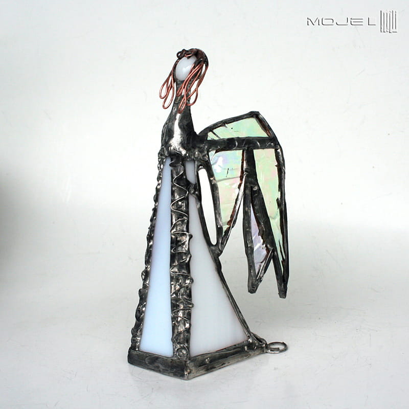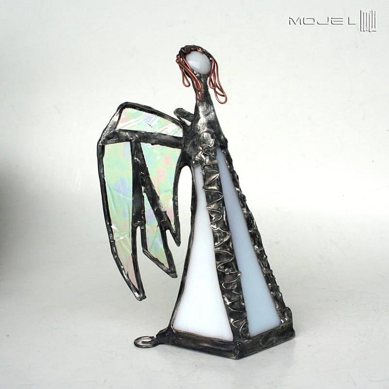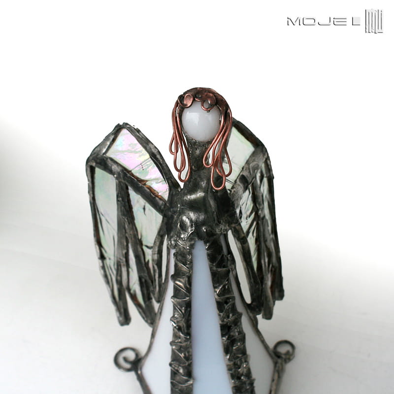 Zrobiony jest ze szkła witrażowego - białego gęstego, przejrzystego opalizującego i białego z leciutkim lawendowym odcieniem. Oprawiony witrażową techniką Tiffany z użyciem miedzi i cyny - patynowany i przecierany. Jego główkę zrobiłam metodą fusingu (wypalanie szkła w temp. min. 800 stopni). Podstawka z bezbarwnego szkła.
