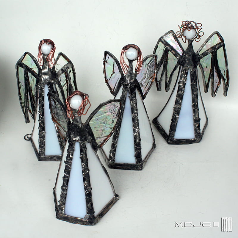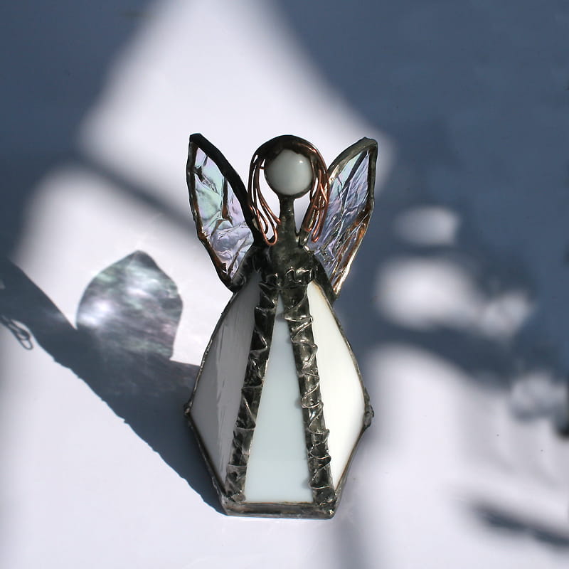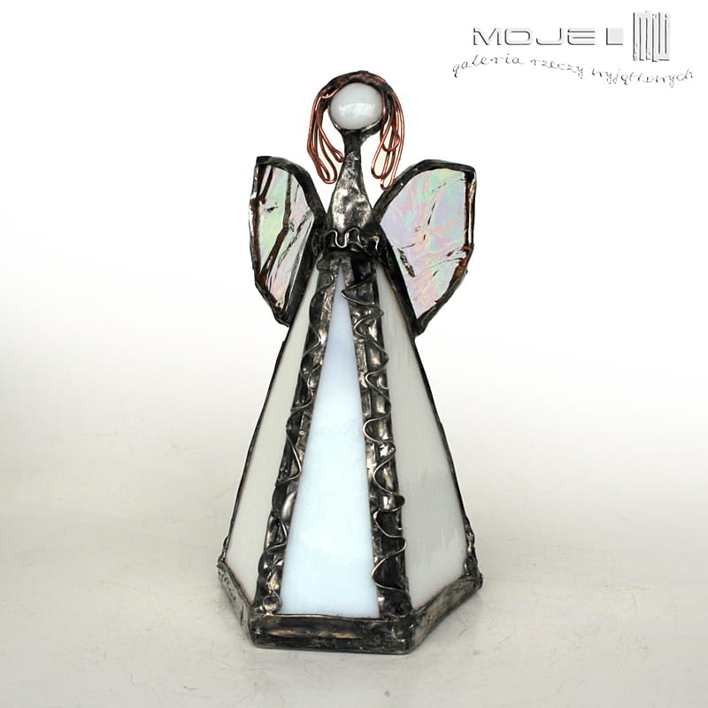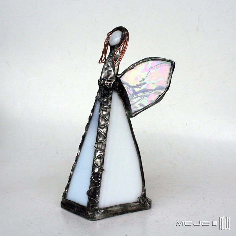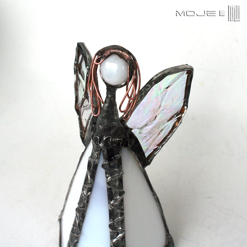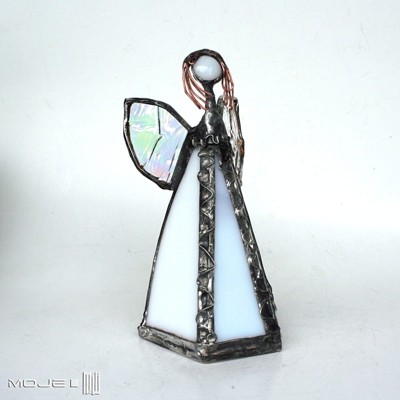 Zrobiony jest ze szkła witrażowego - białego gęstego, przejrzystego opalizującego i białego z leciutkim lawendowym odcieniem. Oprawiony witrażową techniką Tiffany z użyciem miedzi i cyny - patynowany i przecierany. Jego główkę zrobiłam metodą fusingu (wypalanie szkła w temp. min. 800 stopni). Podstawka z bezbarwnego szkła.
