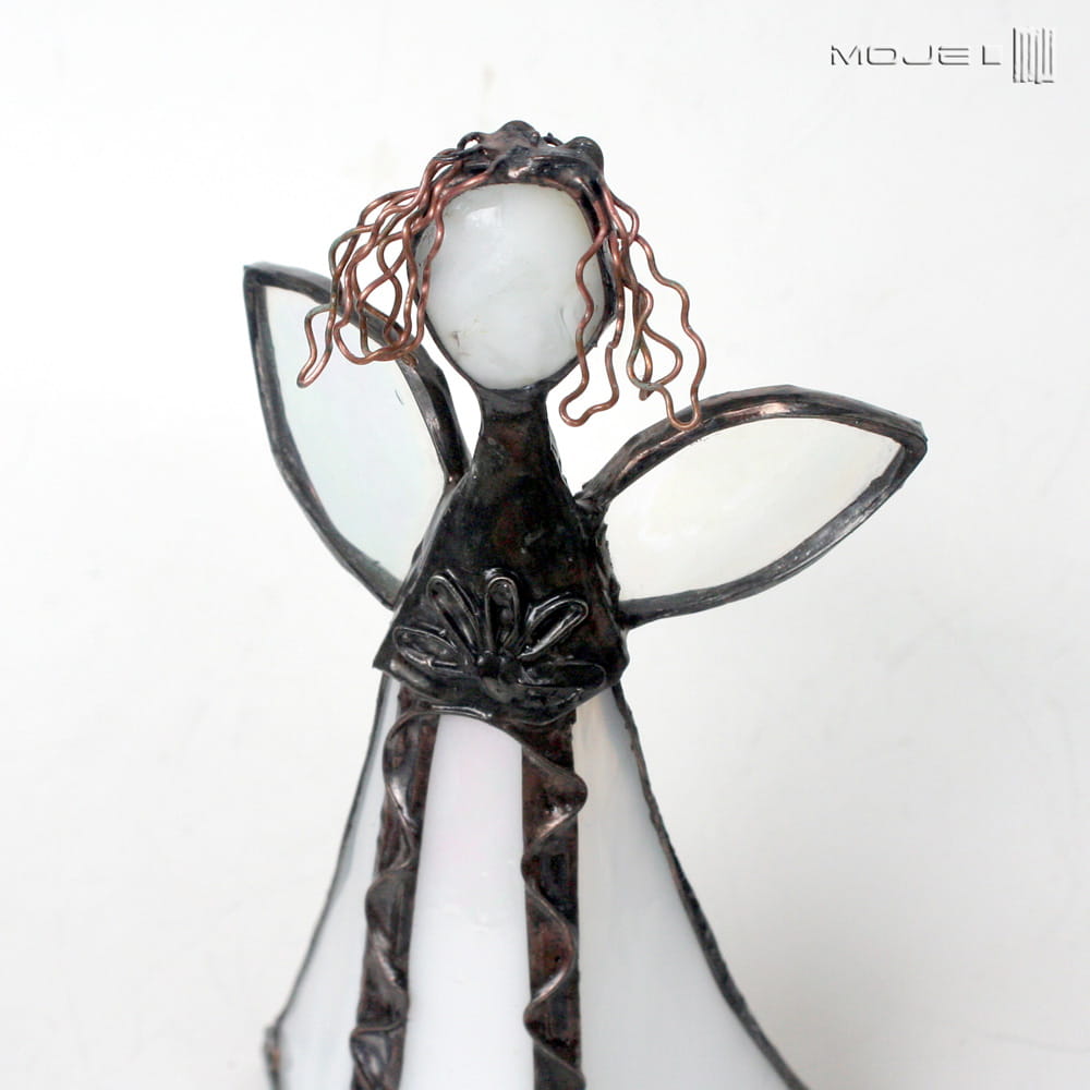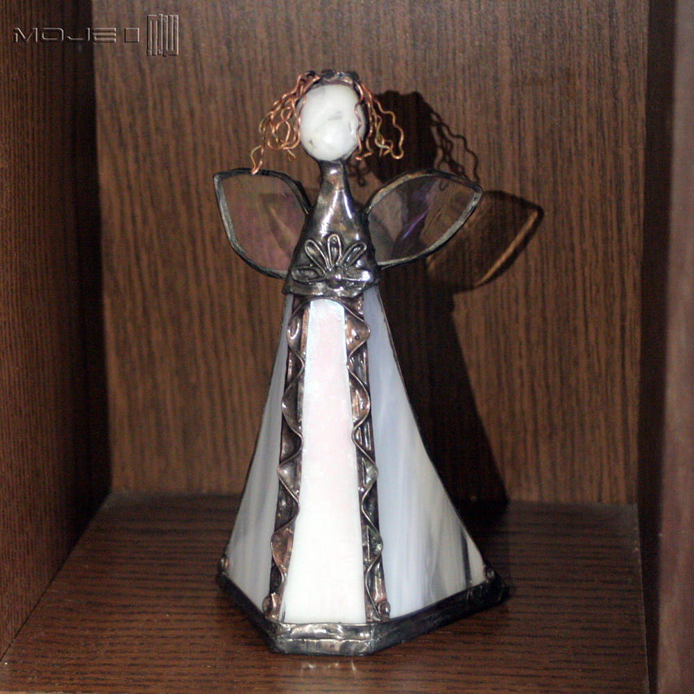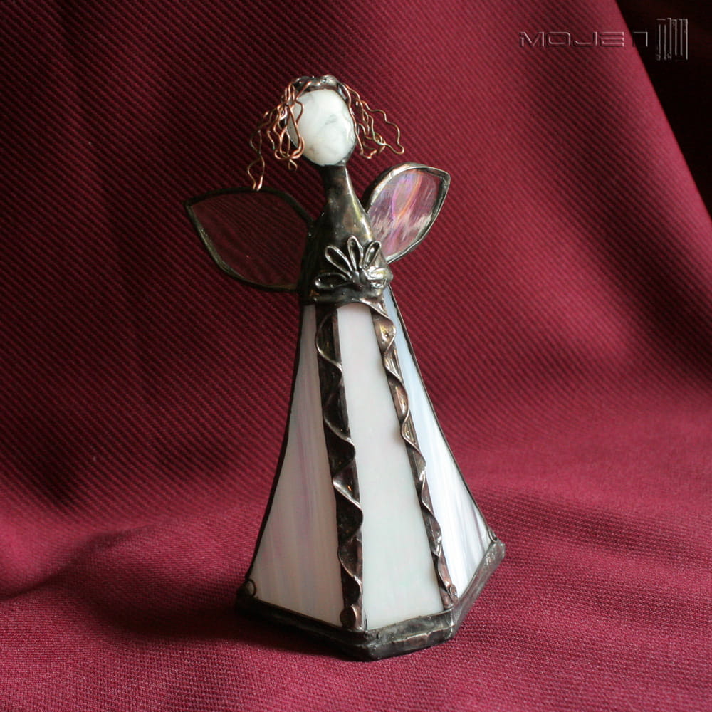 Zrobiony jest ze szkła witrażowego - białego półgęstego i białego z opalizującą tęczowo powłoką. Oprawiony witrażową techniką Tiffany z użyciem miedzi i cyny - patynowany i przecierany. Jego główkę zrobiłam metodą fusingu (wypalanie szkła w temp. min. 800 stopni). Skrzydła są z przejrzystego iryzującego szkła. Podstawka z bezbarwnego szkła.