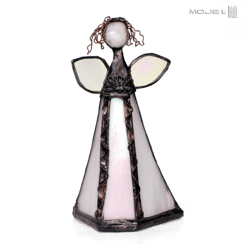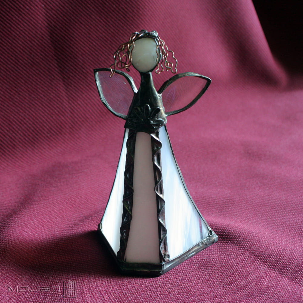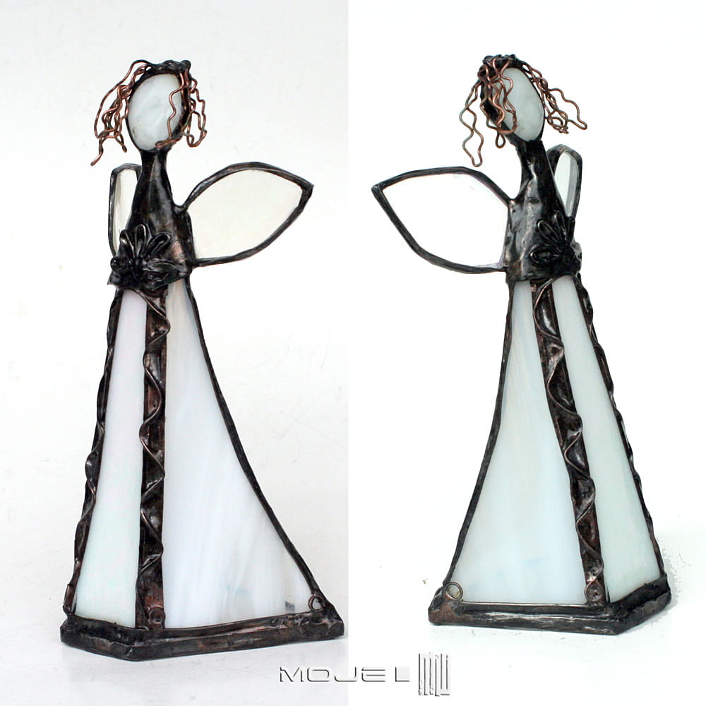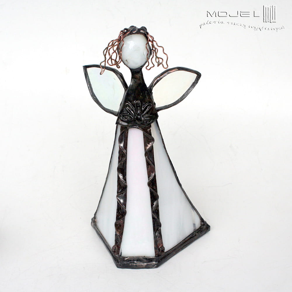 Zrobiony jest ze szkła witrażowego - białego półgęstego i białego z opalizującą tęczowo powłoką. Oprawiony witrażową techniką Tiffany z użyciem miedzi i cyny - patynowany i przecierany. Jego główkę zrobiłam metodą fusingu (wypalanie szkła w temp. min. 800 stopni). Skrzydła są z przejrzystego iryzującego szkła. Podstawka z bezbarwnego szkła.