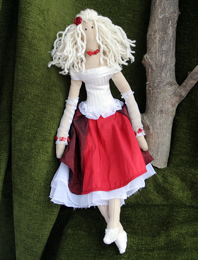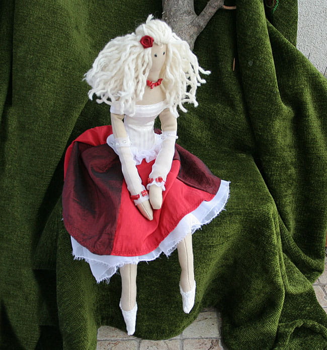 Miękka, uszyta z materiału, antyalergiczne wypełnienie silikonowe, włosy zrobione są z włóczki.