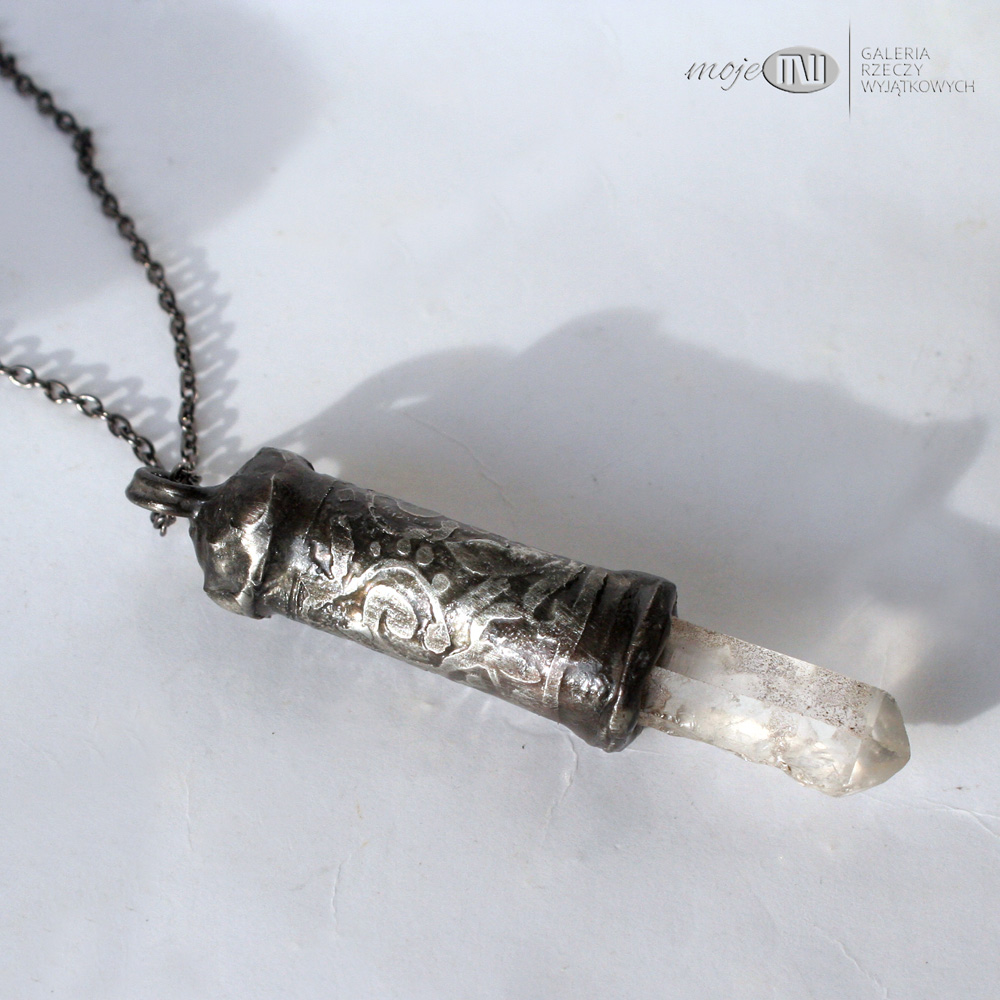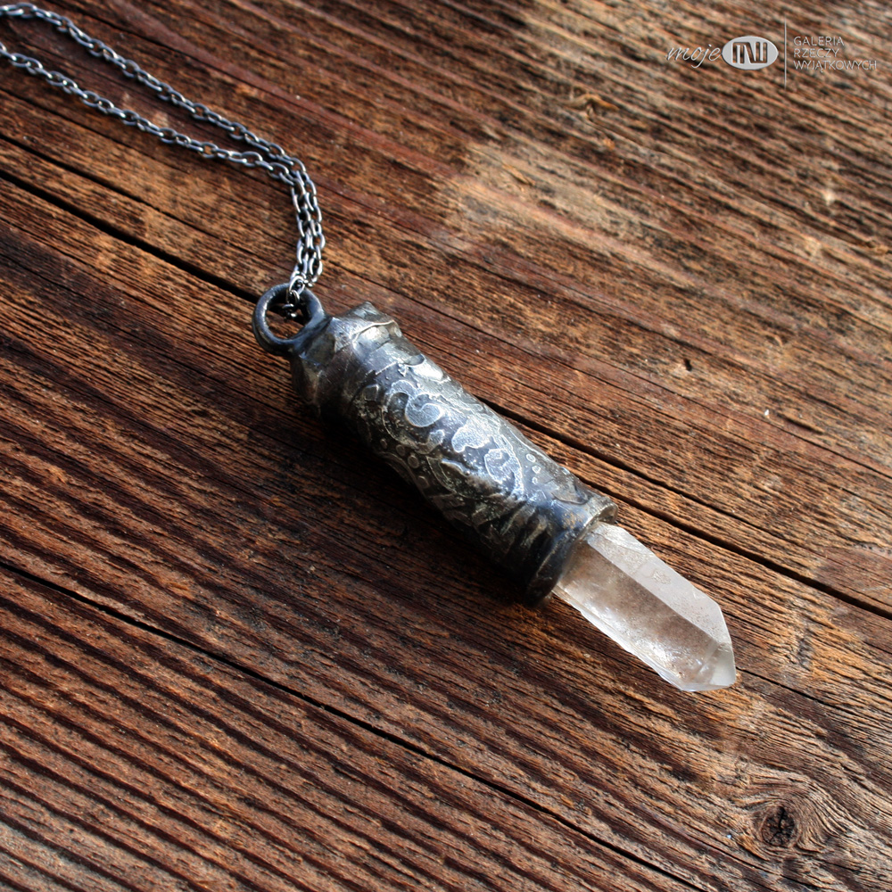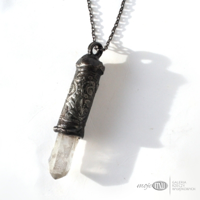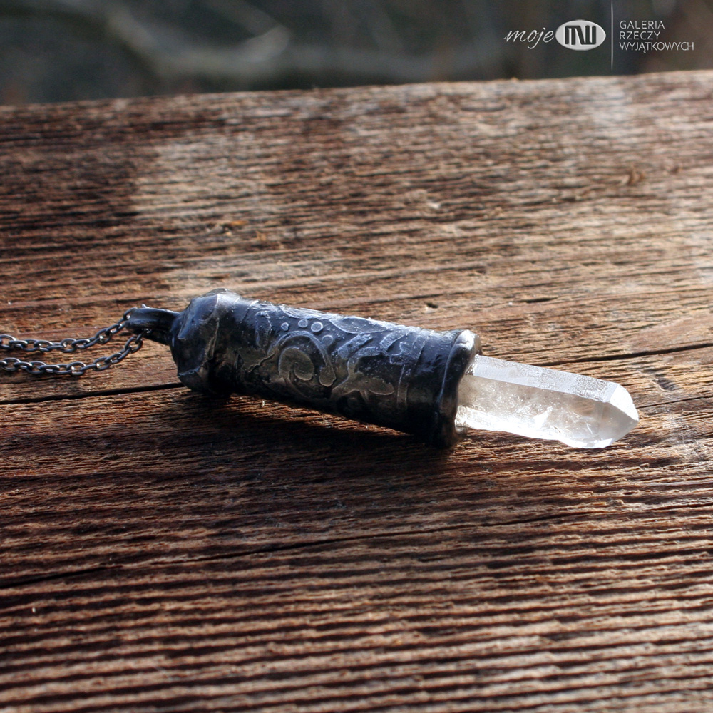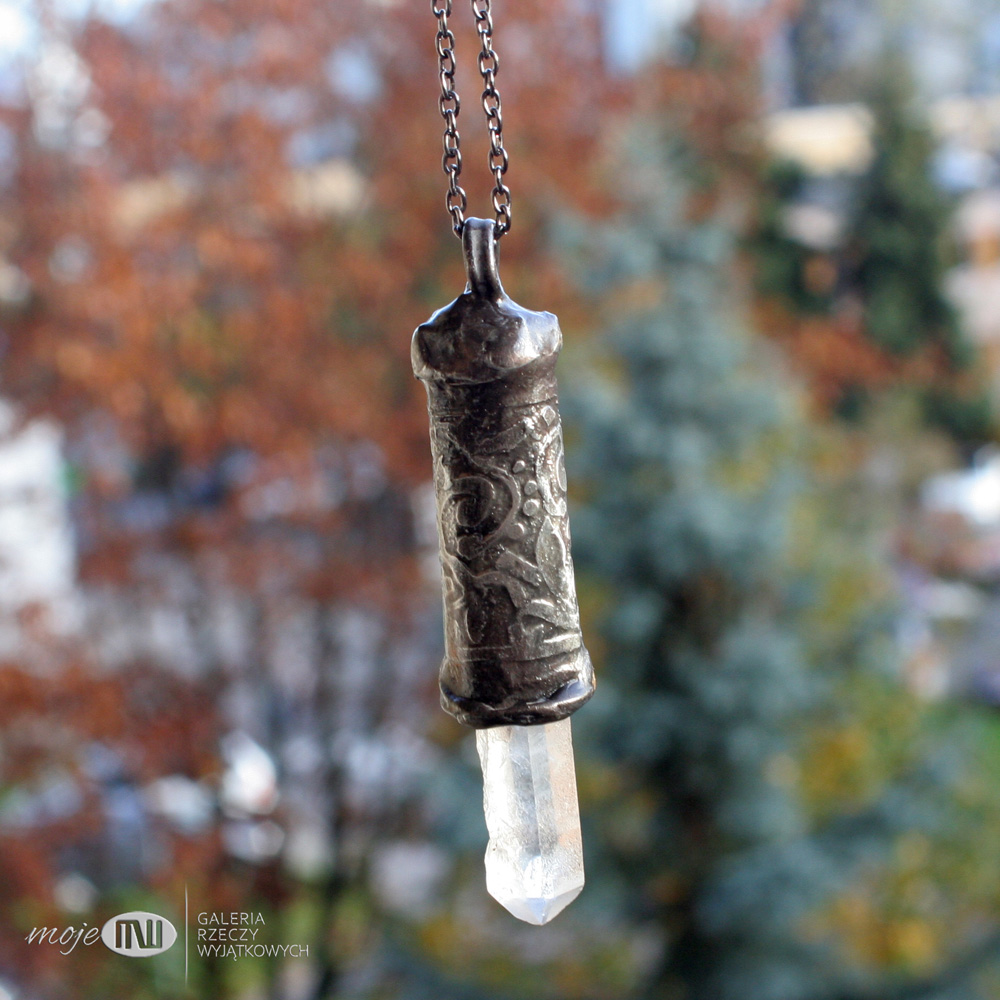 Czarowny wisior z surowym kryształem górskim. Wykonany z miedzi - cynowanej, patynowanej i przecieranej, w której wytrawiłam wzory nadające całości nieco lekkości.
