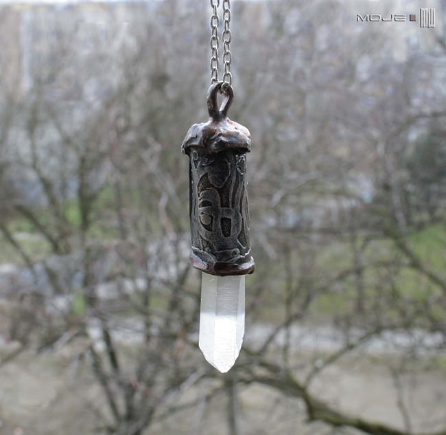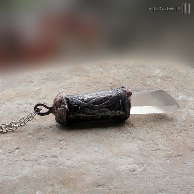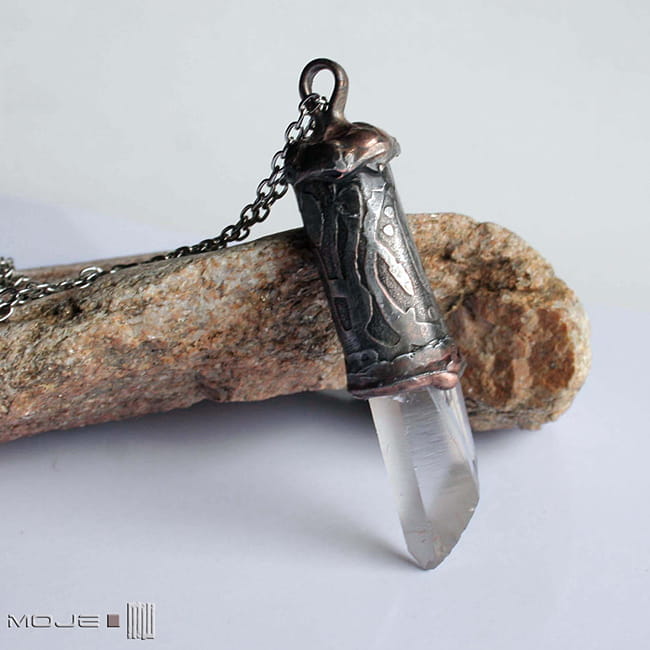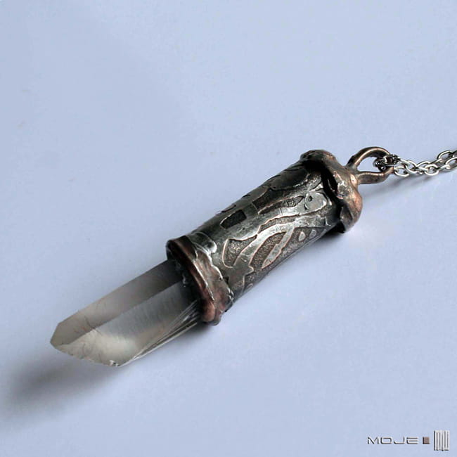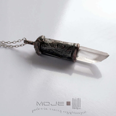 Czarowny wisior z surowym kryształem górskim. Wykonany z miedzi - cynowanej, patynowanej i przecieranej, w której wytrawiłam wzory nadające całości nieco lekkości.