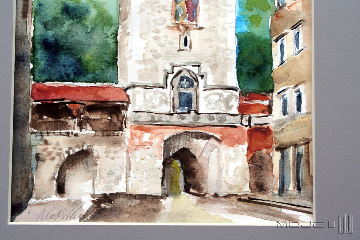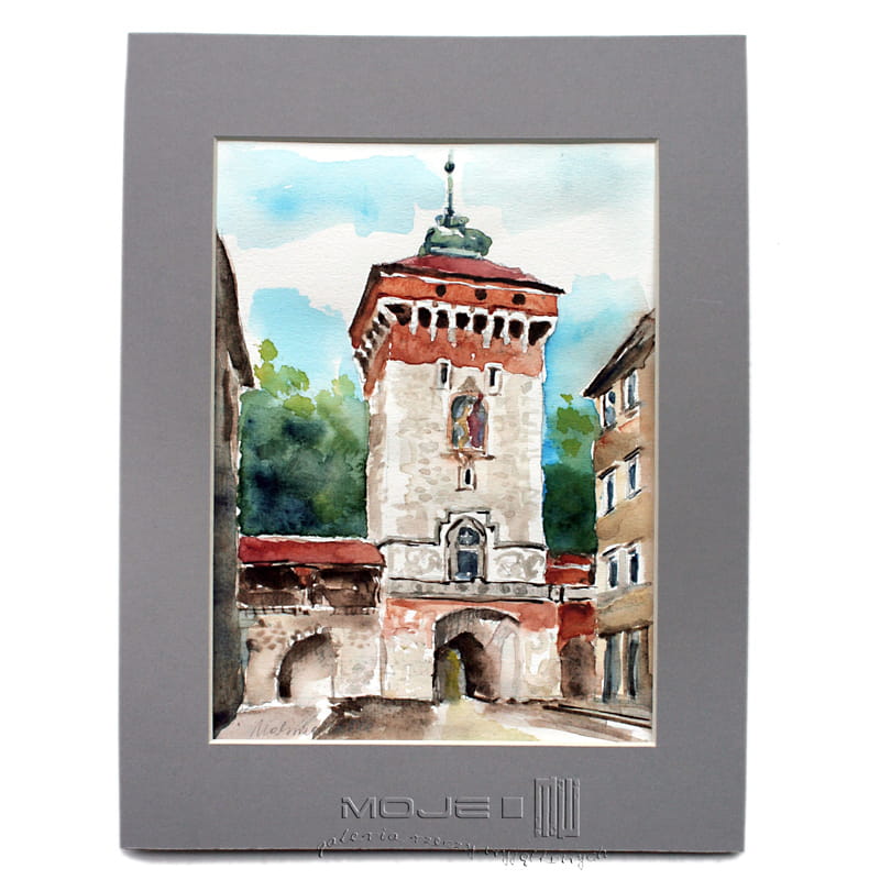Akwarela, malowana na papierze akwarelowym, oprawiona w szare passe partout oraz antyramę.