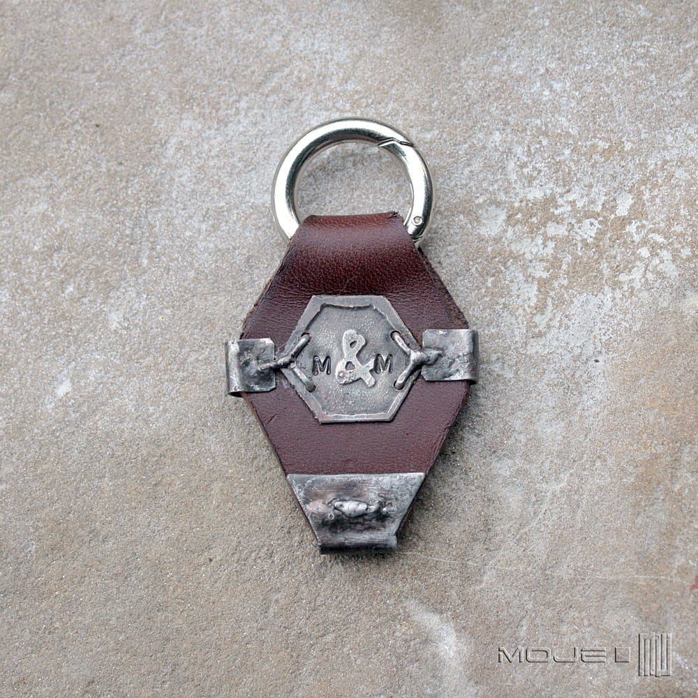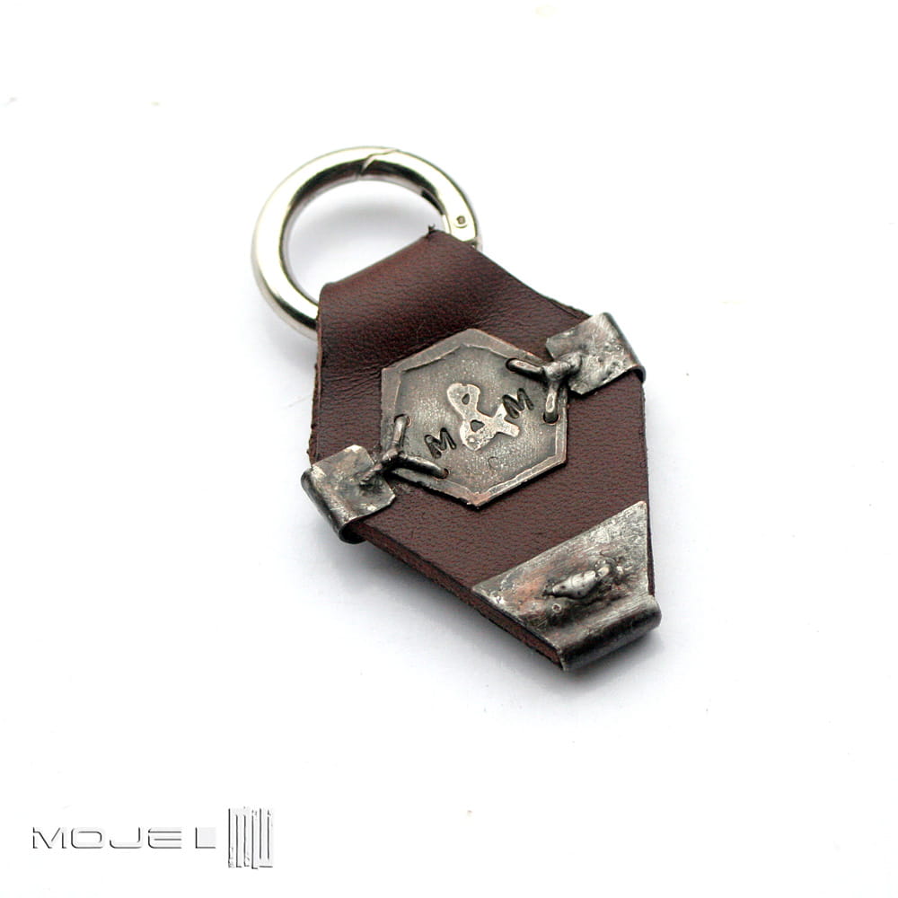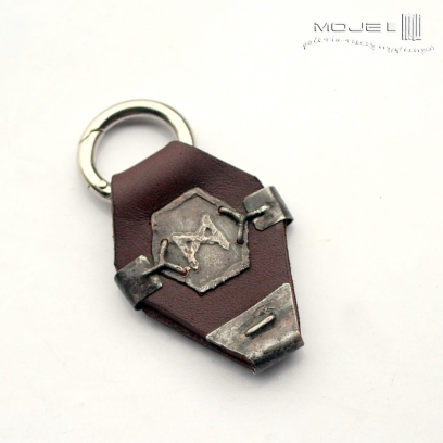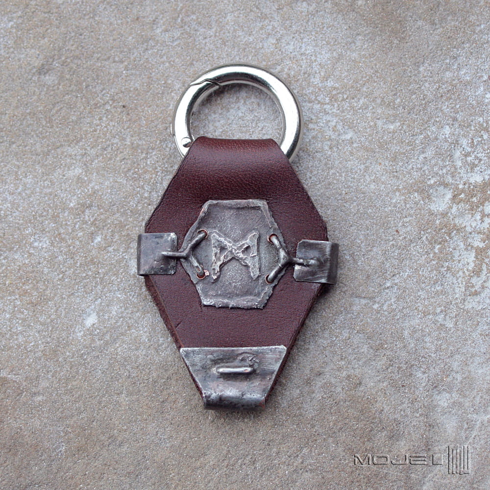 Dwustronny - z obydwu stron wytrawione są w miedzi wybrane runy i znaki. Całość oprawiona i wykończona jest miedzią pokrytą cyną, patynowana i przecierana. Brelok jest dość surowy w wyglądzie, rustykalny. Skóra o gr. 3 mm w kolorze ciemnej czekolady.