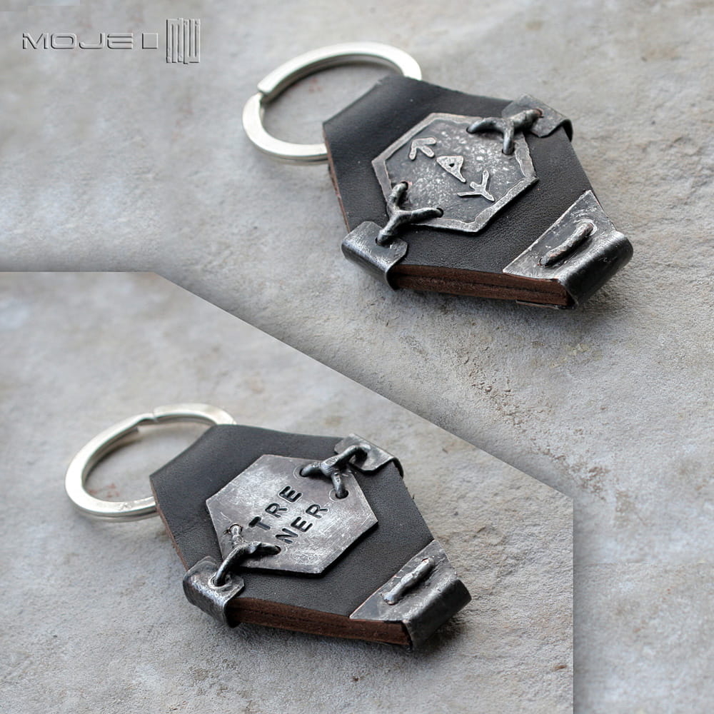 Dwustronny - z jednej strony wytrawione w miedzi wybrane runy, z drugiej strony napis wybity stemplami. Całość oprawiona i wykończona jest miedzią pokrytą cyną, patynowana i przecierana. Brelok jest dość surowy w wyglądzie, rustykalny. Skóra o gr. 3 mm w kolorze bardzo ciemnej czekolady.