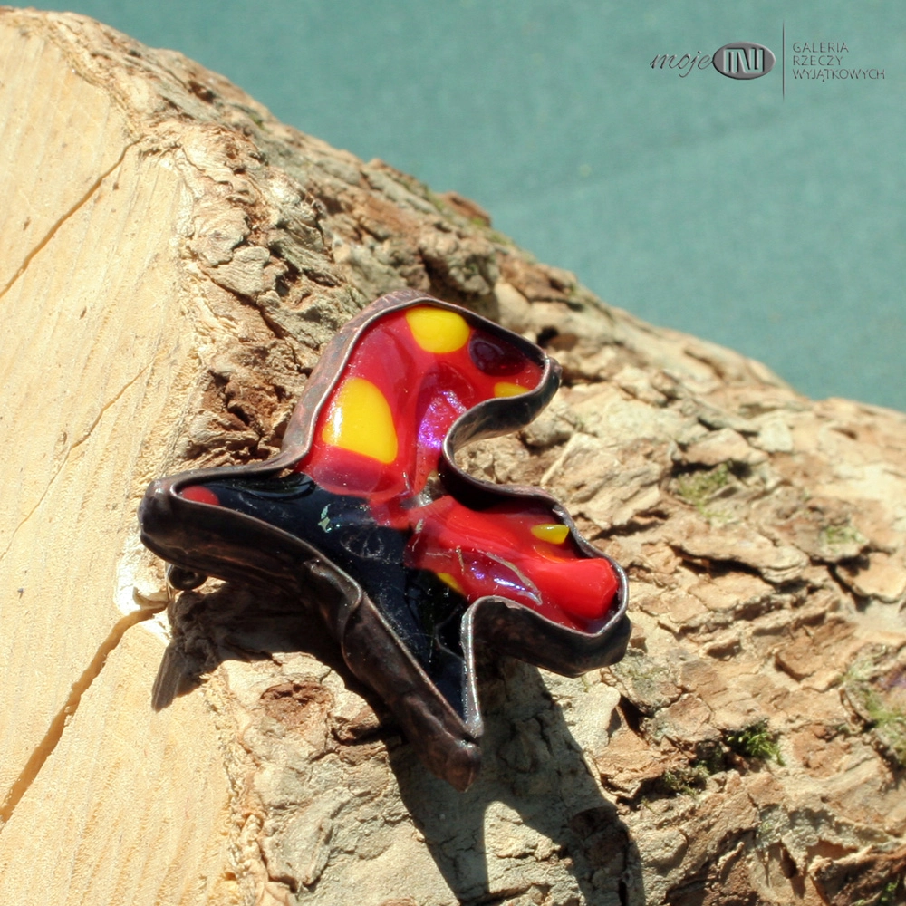 To broszka wykonana przeze mnie ze szkła dichroicznego i miedzi. Szkło wytopione jest w temperaturze kilkuset stopni metodą fusingu.