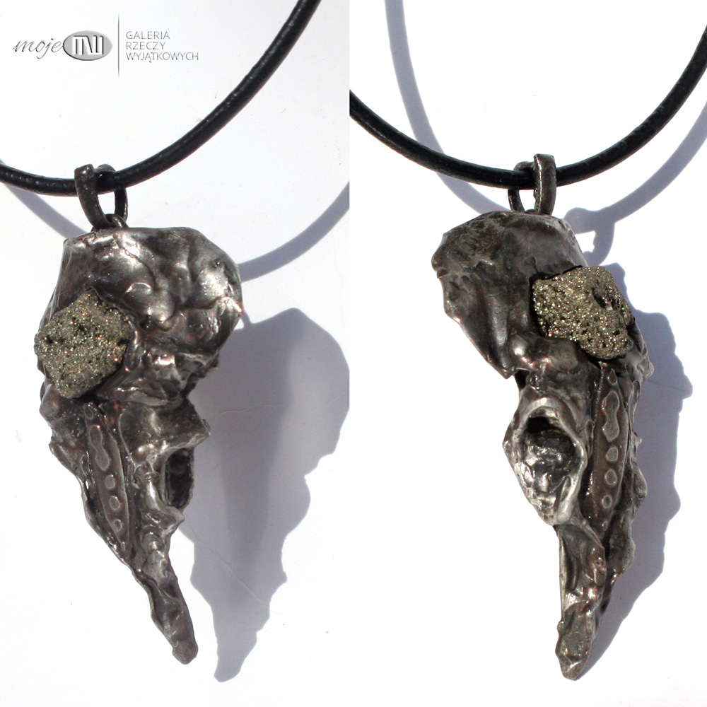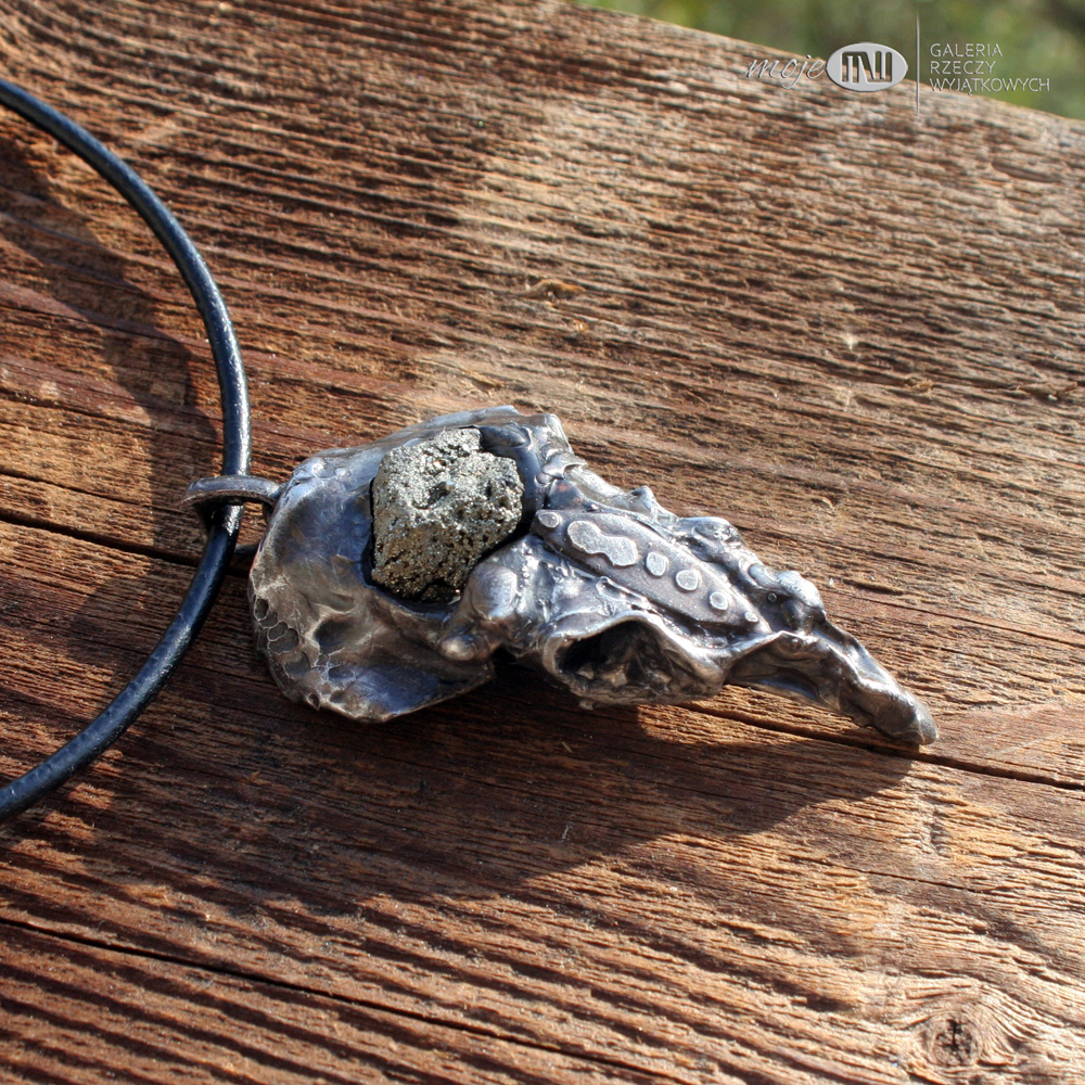 Wisior zrobiony jest z miedzi - trawionej, młotkowanej, pokrytej cyną, patynowanej i przecieranej. Ozdobiony jest bryką surowego pirytu.