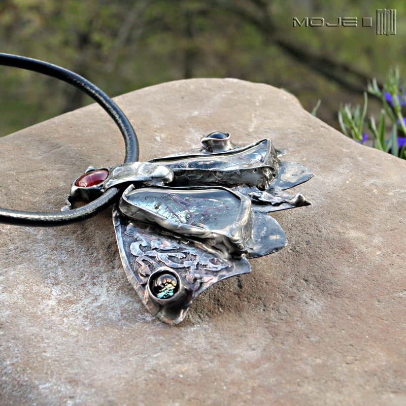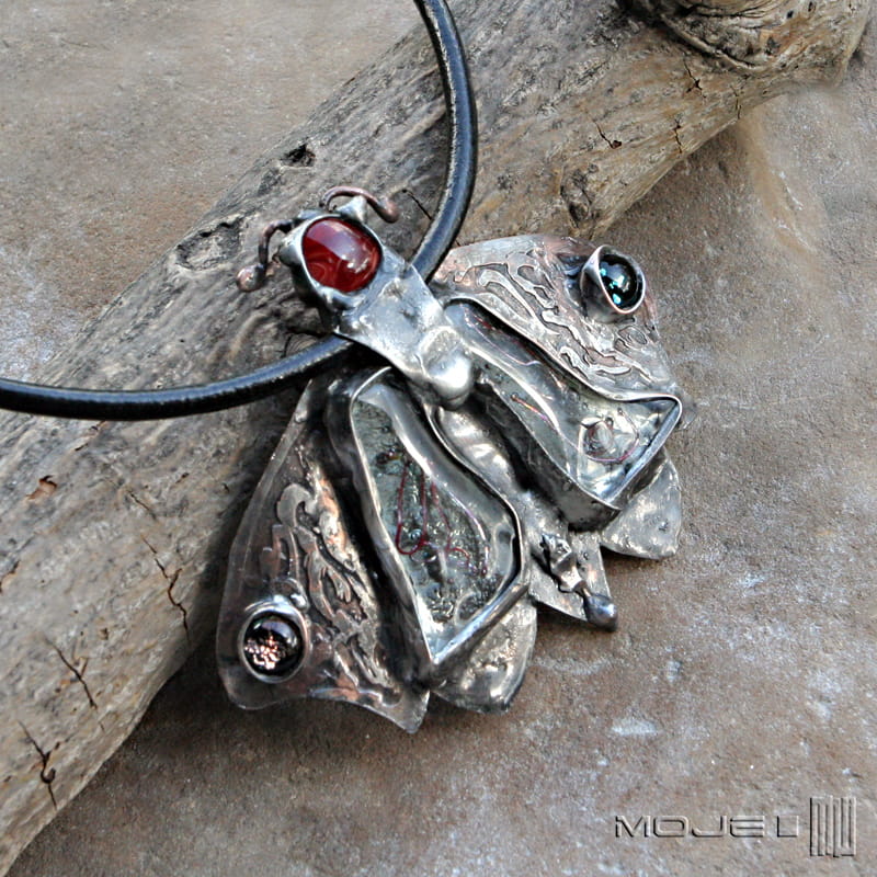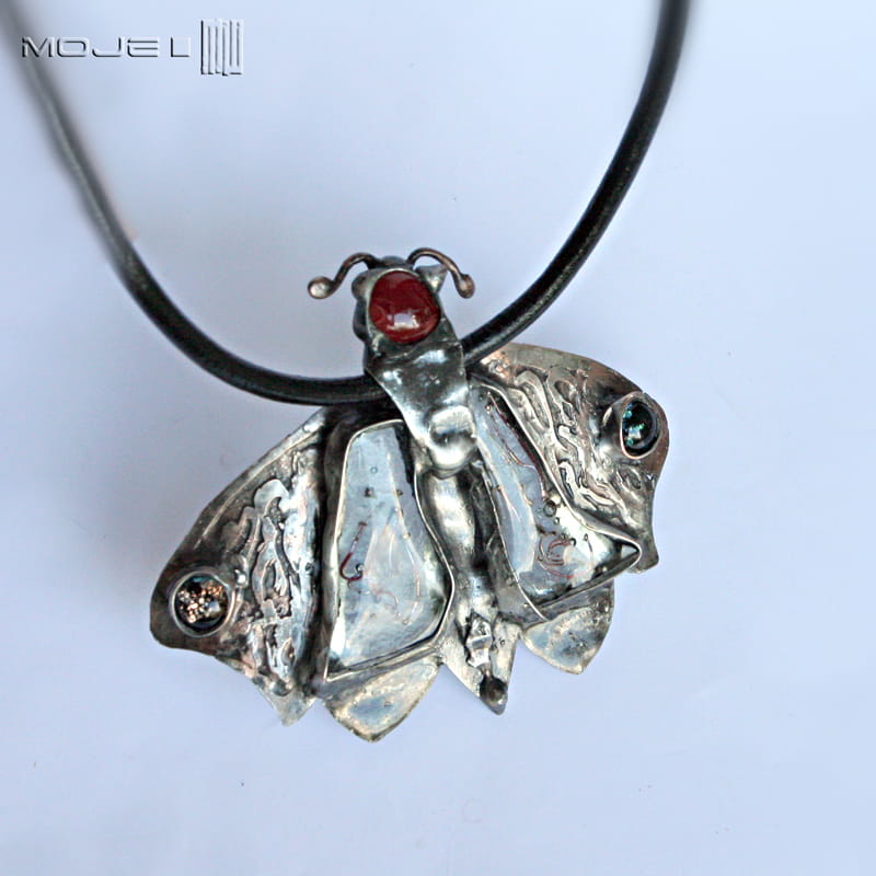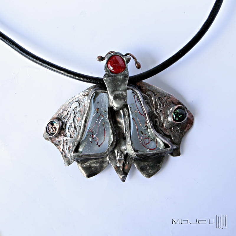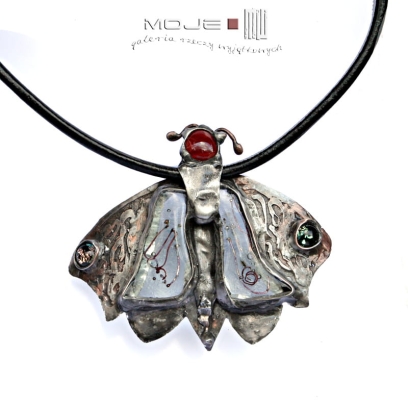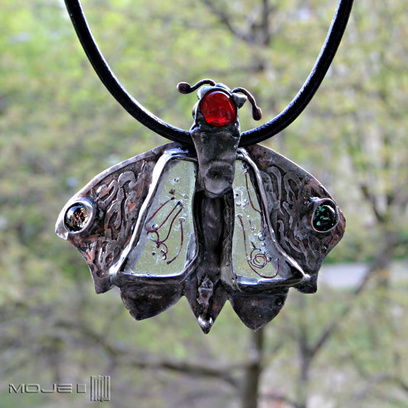 Duży wisior z miedzi i szkła - stylizowana ćma.