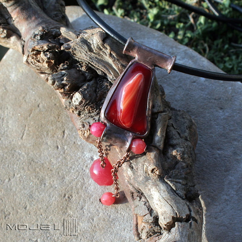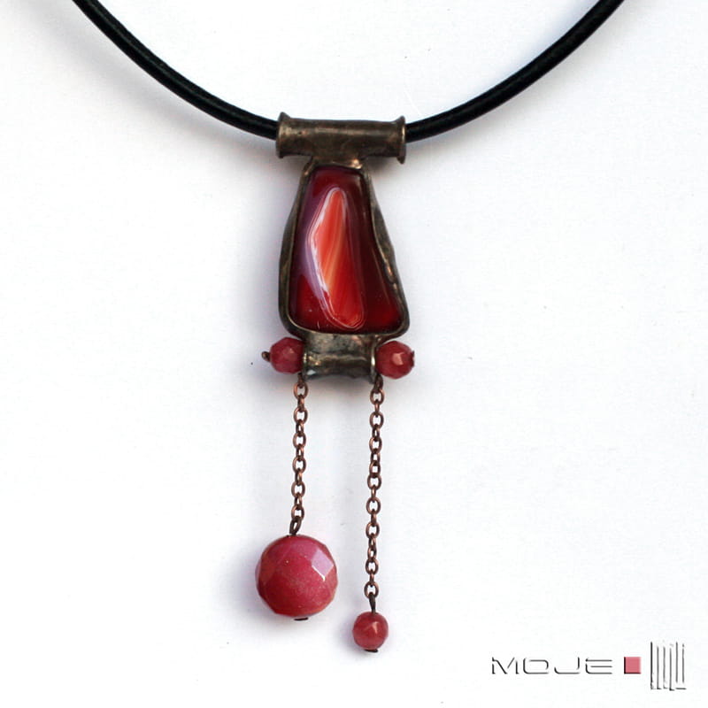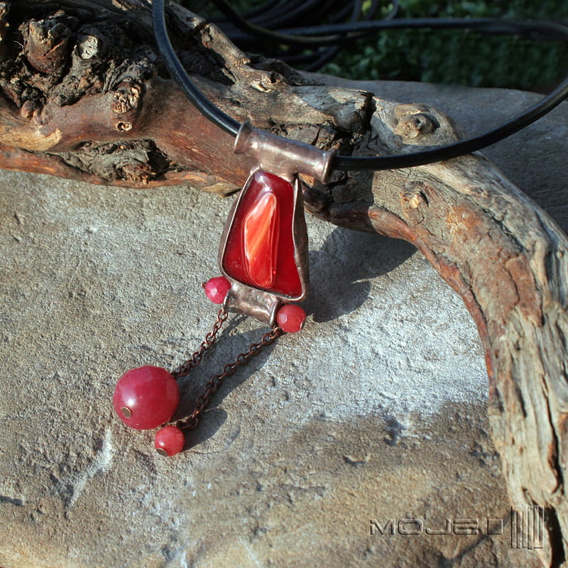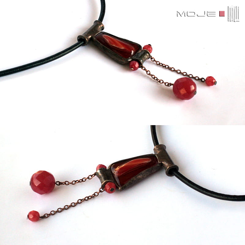 Wisior / naszyjnik w odcieniach gorącej czerwieni. Zrobiłam go ze szklanego kaboszona, który wytopiłam metodą fusingu, marmurowych fasetowanych kulek oraz miedzi - cynowanej, patynowanej i przecieranej. Zawieszony jest na czarnym skórzanym rzemieniu o gr. 3 mm i długości ok. 50 cm
