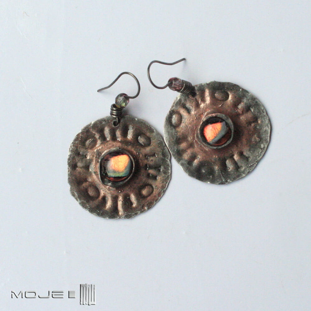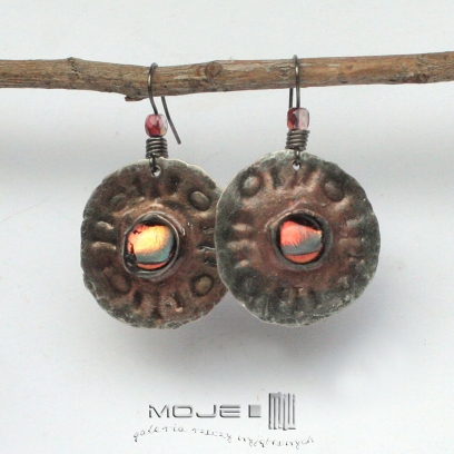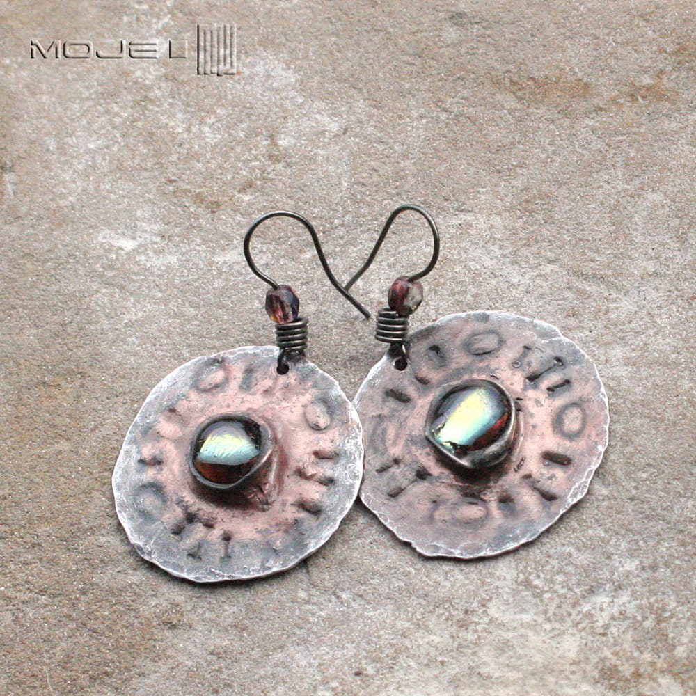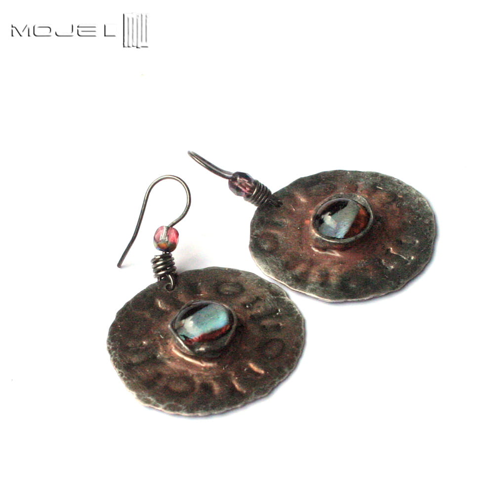 Kolczyki ze szklanym okiem. Szklane kaboszony, pięknie opalizujące w słońcu, osadzone są na okrągłej miedzianej blasze z wybitymi znakami - młotkowanej, cynowanej, patynowanej i przecieranej. Metalowe bigle.