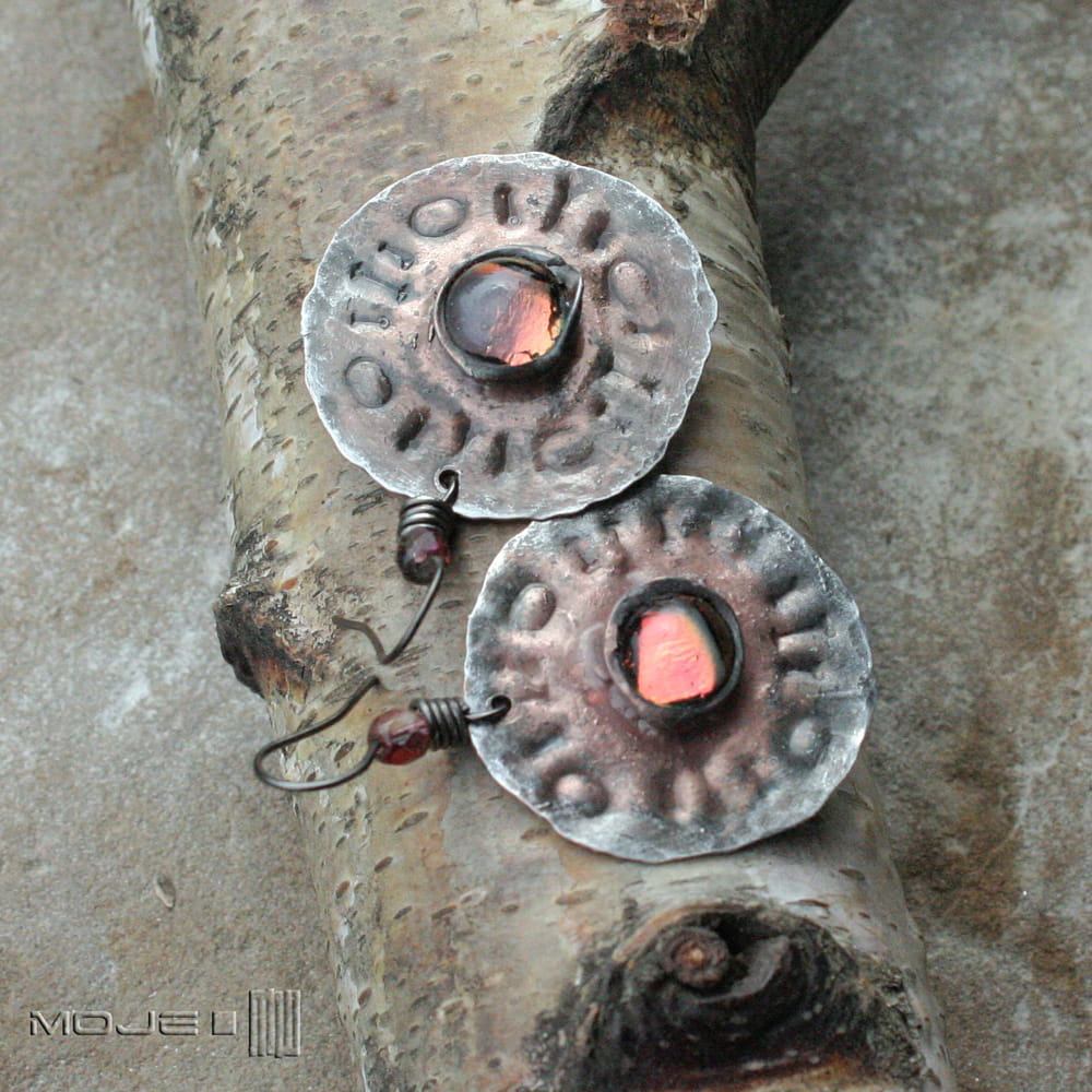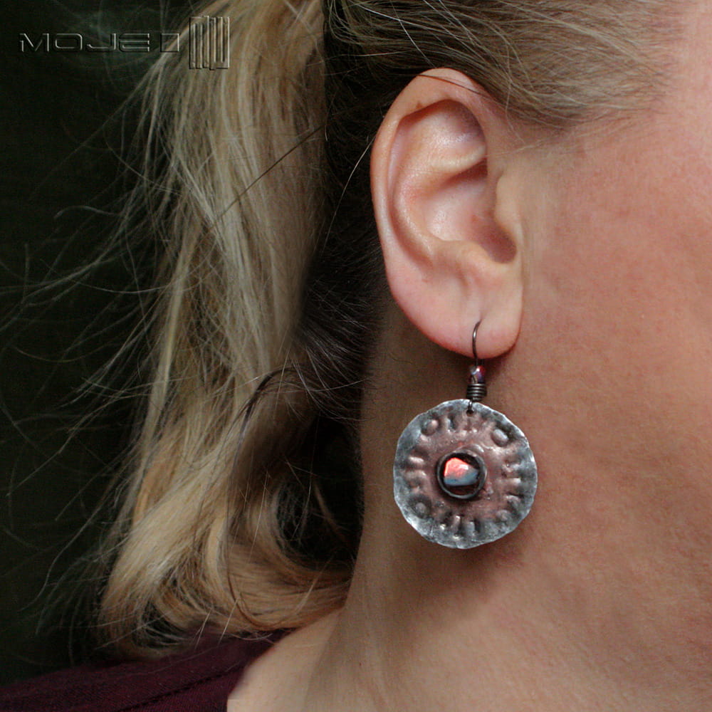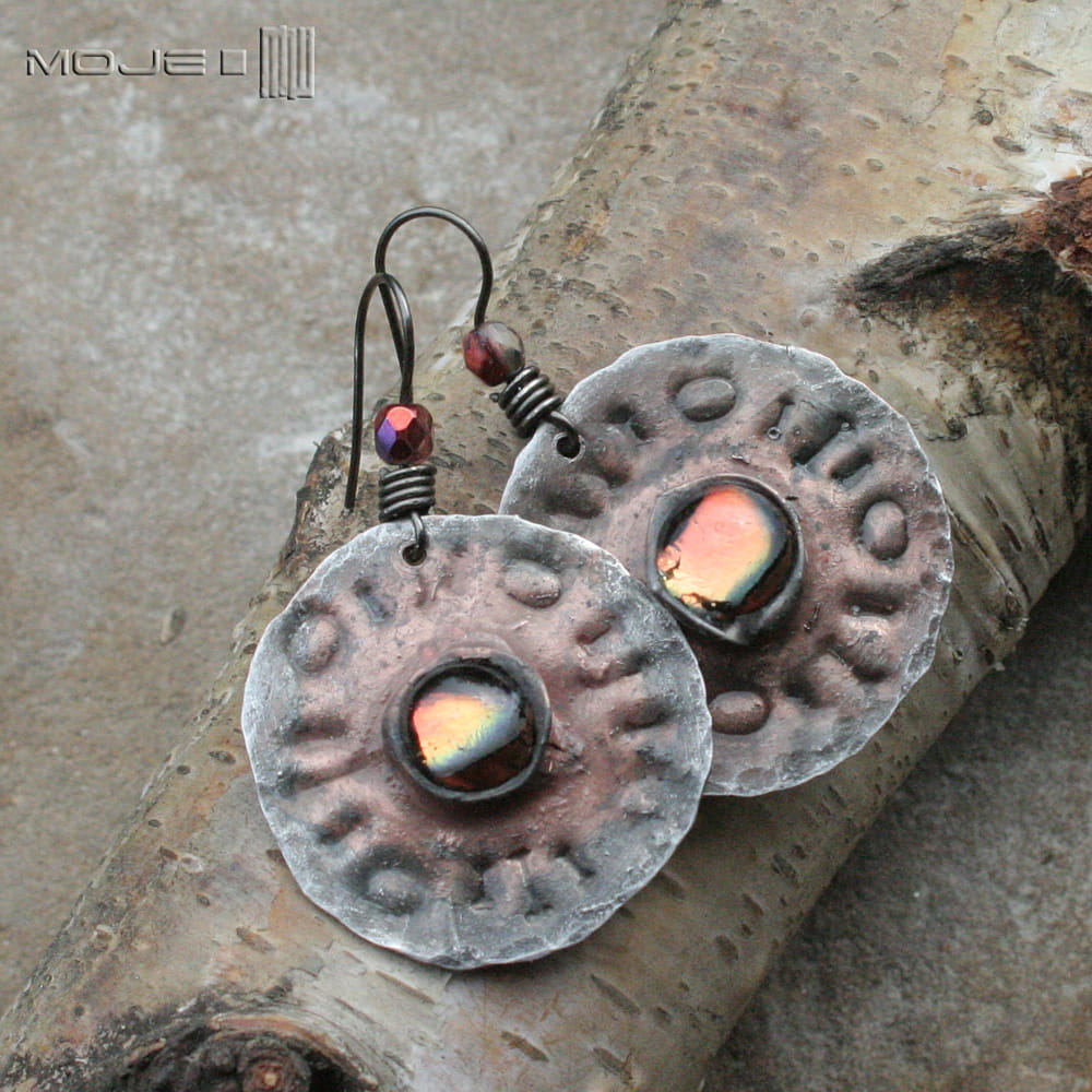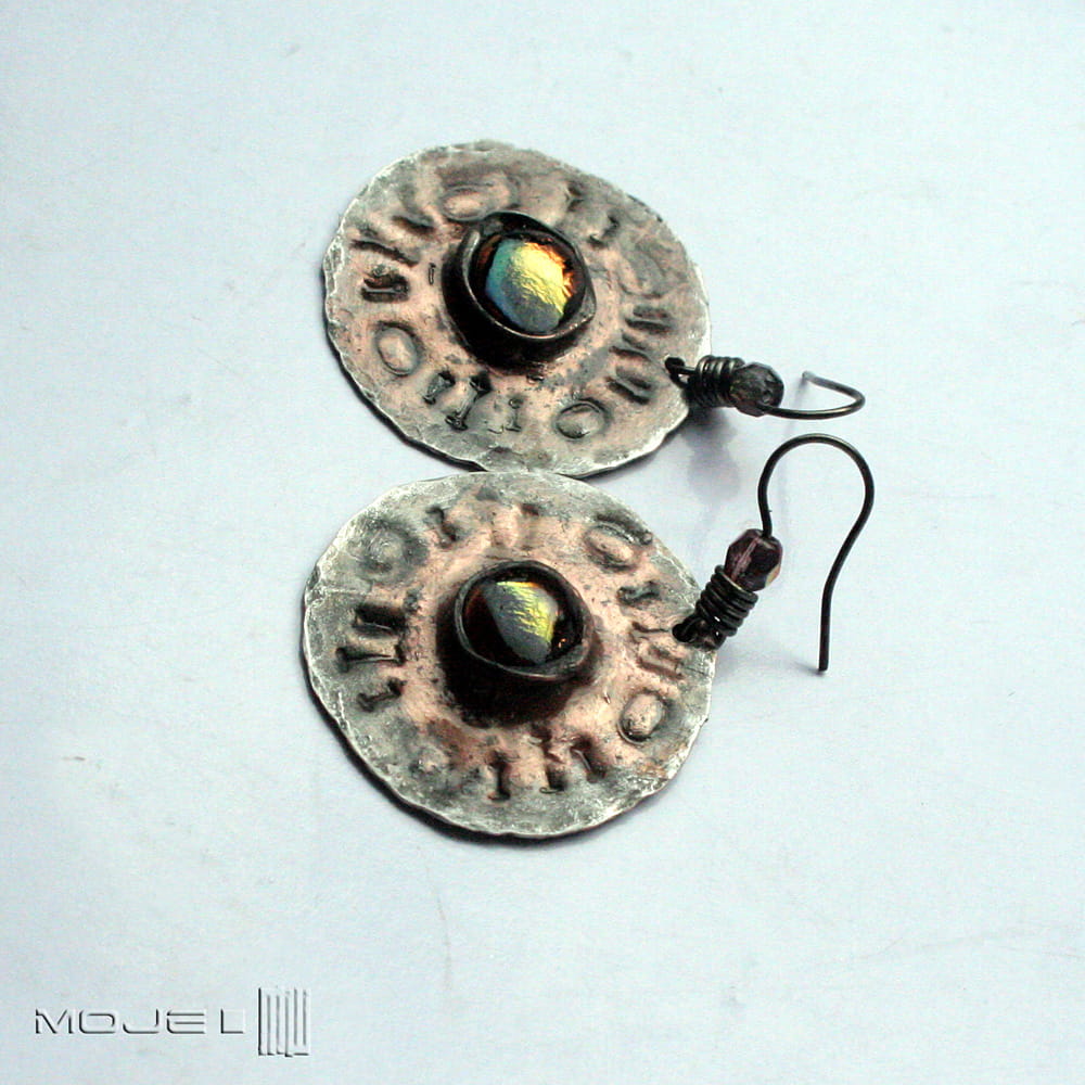 Kolczyki ze szklanym okiem. Szklane kaboszony, pięknie opalizujące w słońcu, osadzone są na okrągłej miedzianej blasze z wybitymi znakami - młotkowanej, cynowanej, patynowanej i przecieranej. Metalowe bigle.