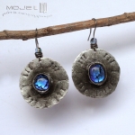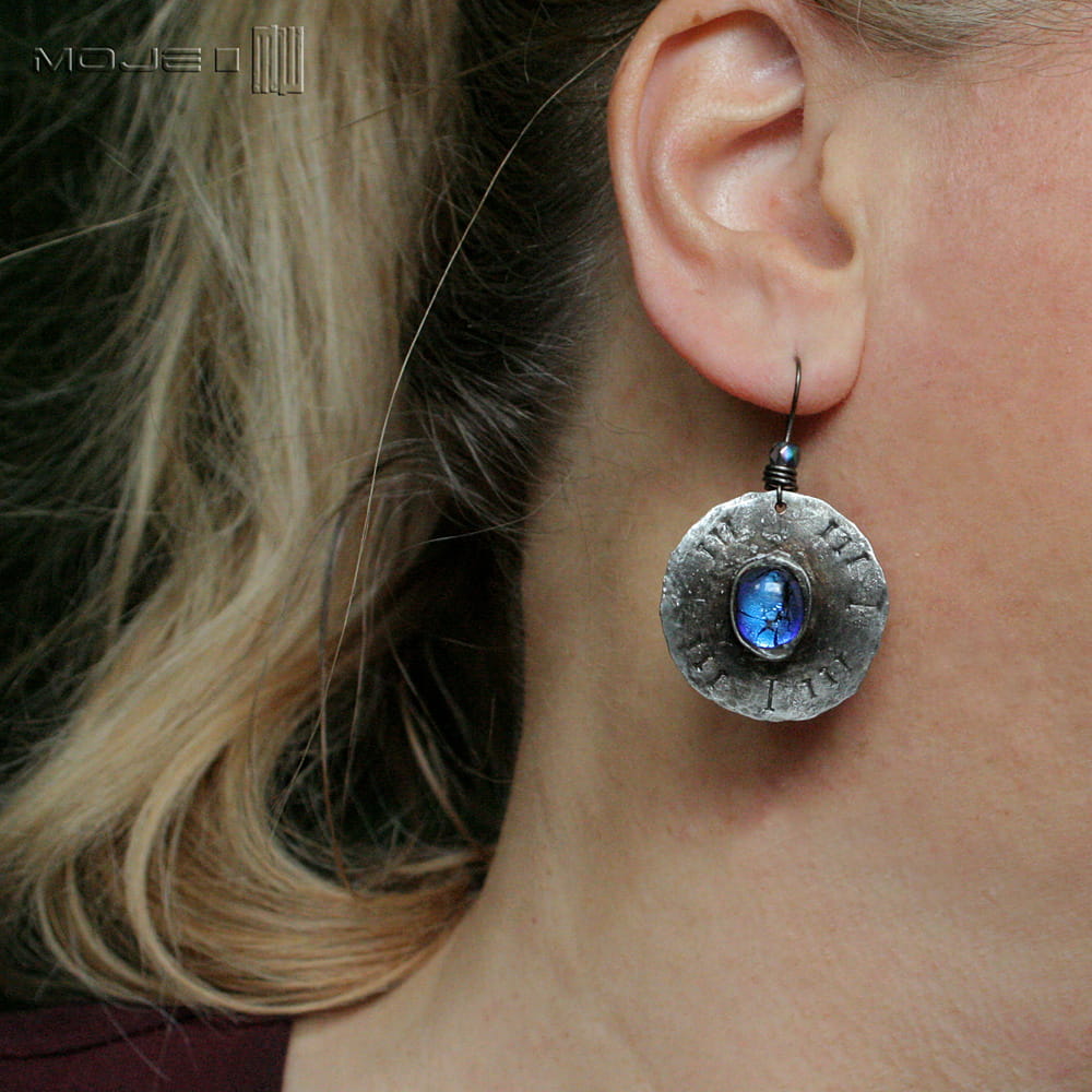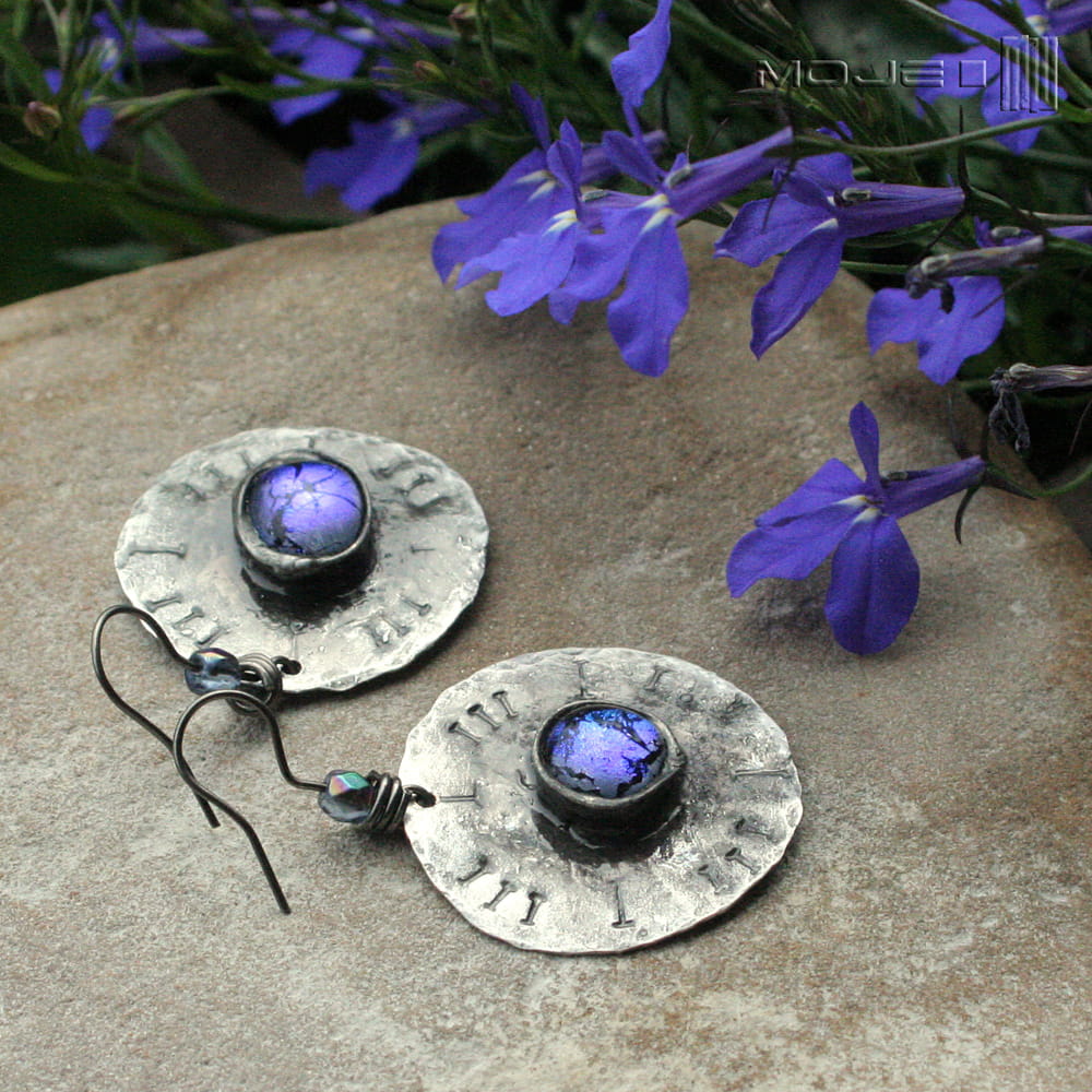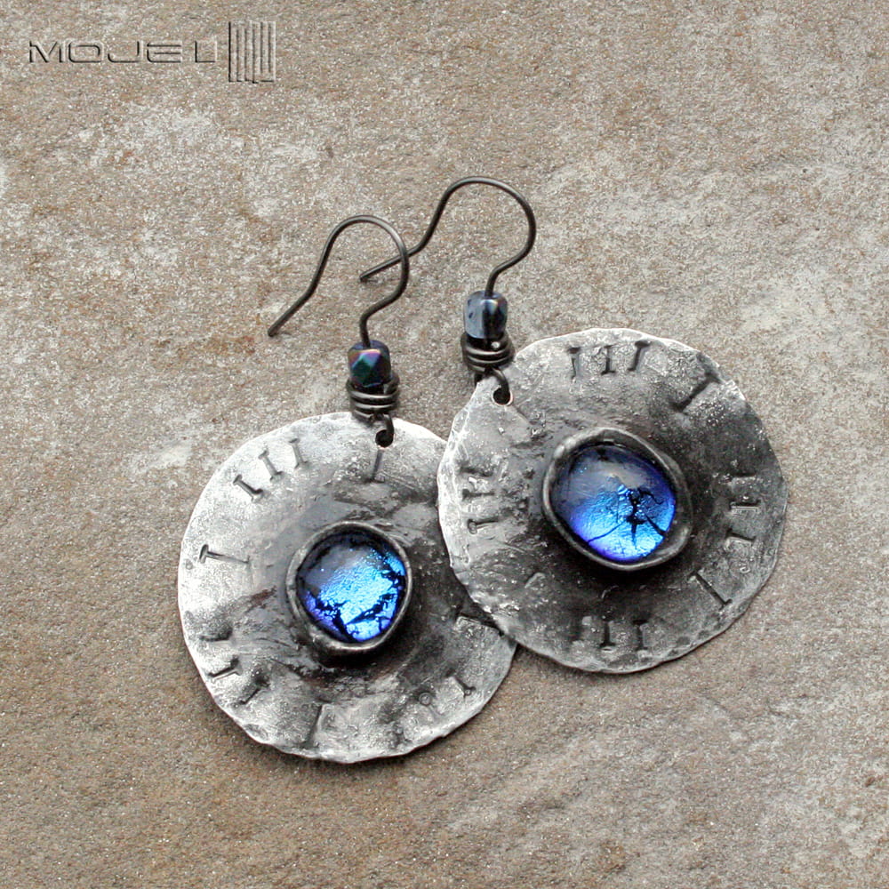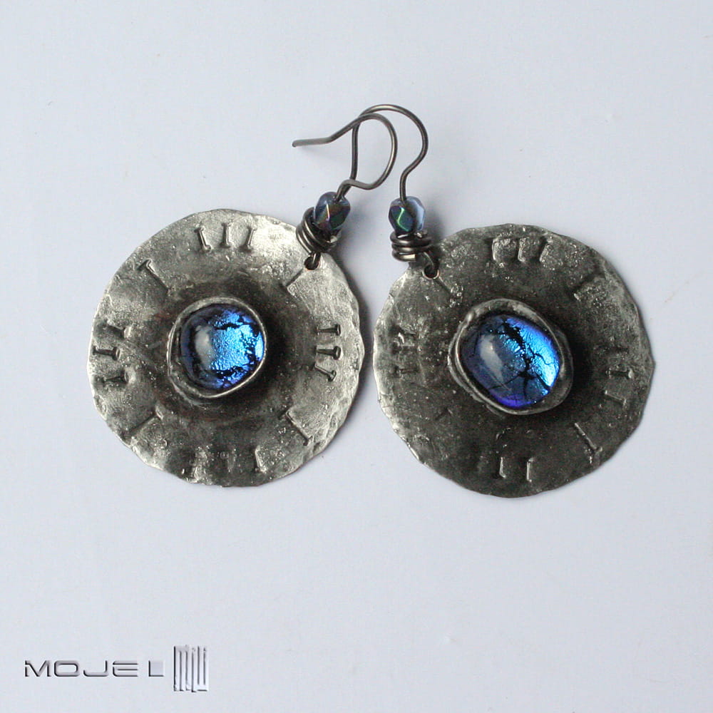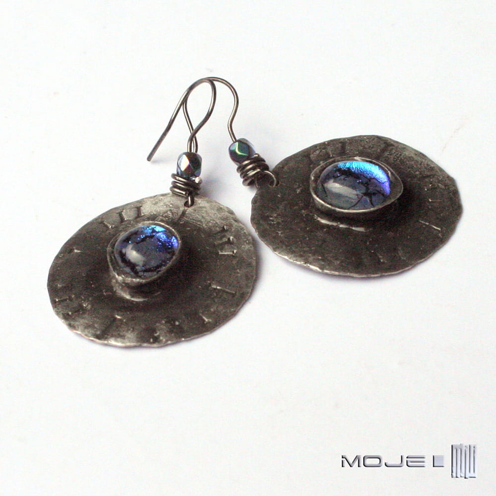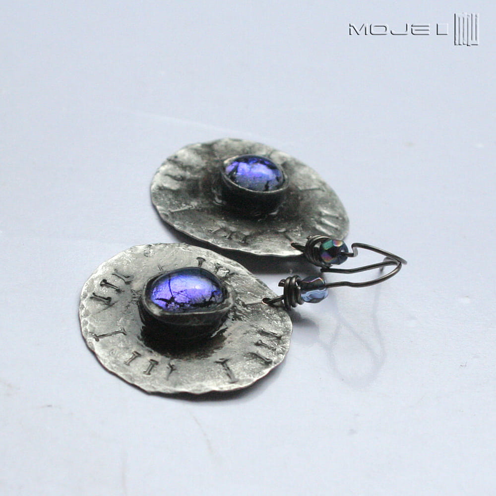 Miedziane kolczyki ze szklanym okiem. Szklane kaboszony osadzone są na okrągłej miedzianej blasze z wybitymi znakami - młotkowanej, cynowanej, patynowanej i przecieranej. Metalowe bigle. Szkło dichroiczne użyte do wytopienia kaboszonów pięknie połyskuje i opalizuje w słońcu.