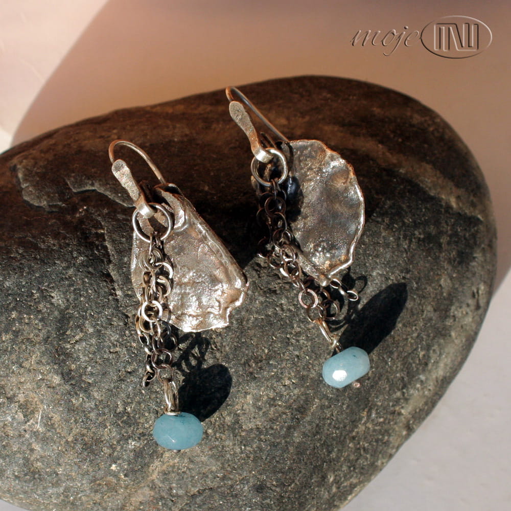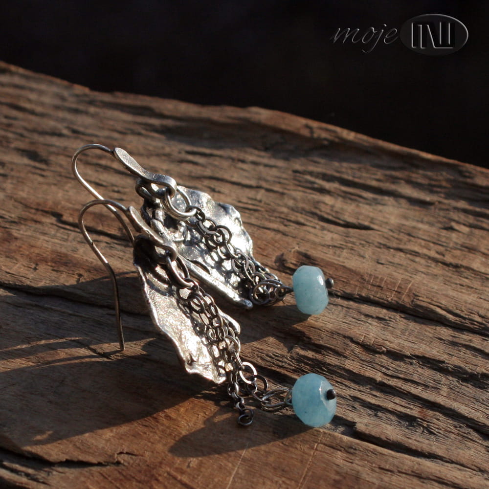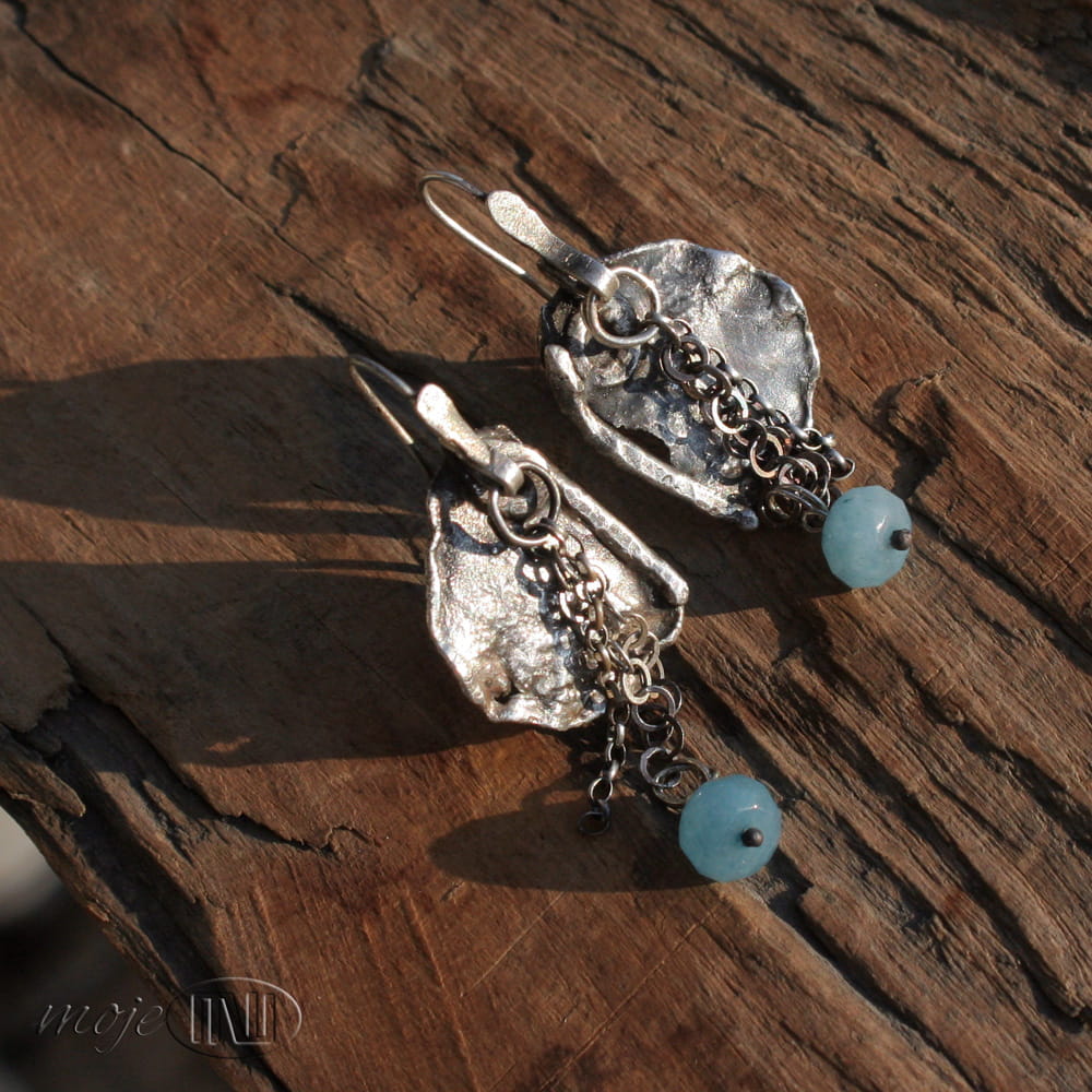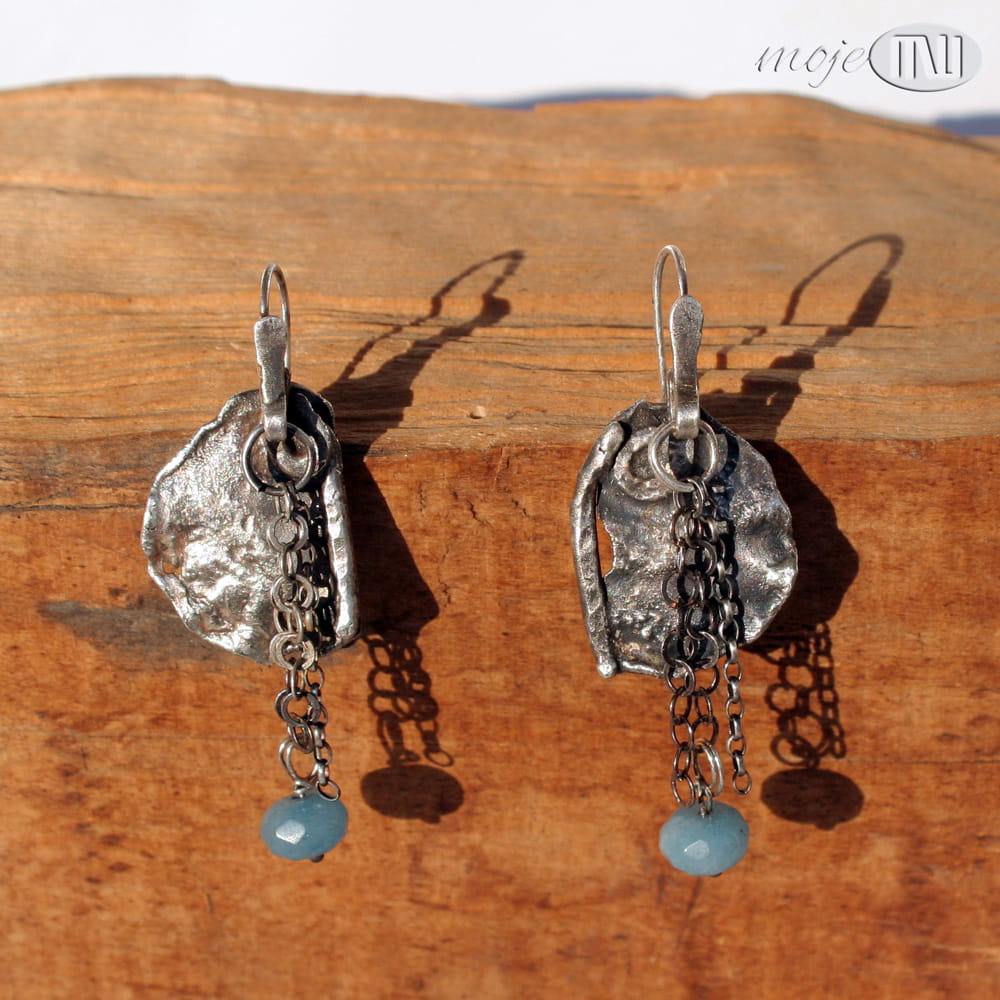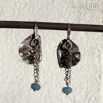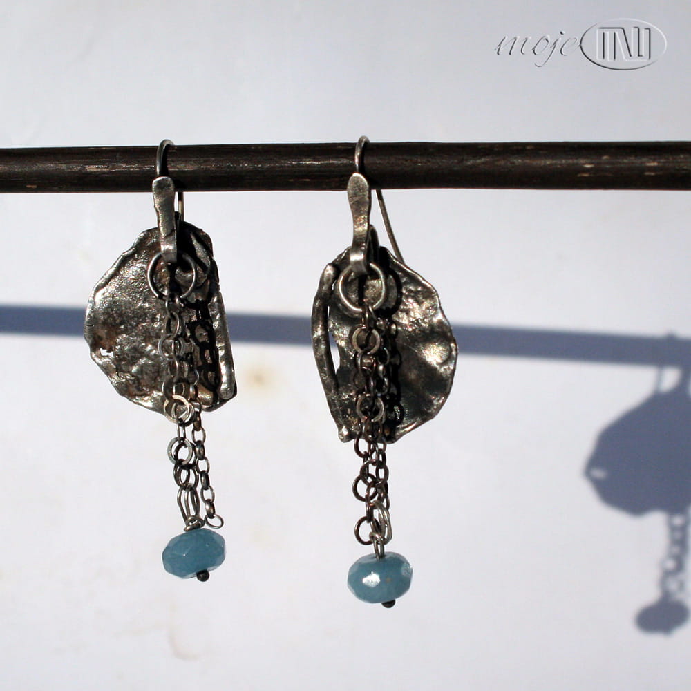 Kolczyki ze srebra i akwamarynu. Nieregularną płytkę z delikatną fakturą zdobią łańcuszki z fasetowaną oponką jasnoniebieskiego akwamarynu. Wyglądają bardzo surowo i rustykalnie. Srebro jest oksydowane i przecierane dla wydobycia faktury. Zawieszone na biglach ze srebrnego drutu.