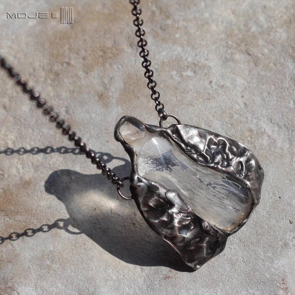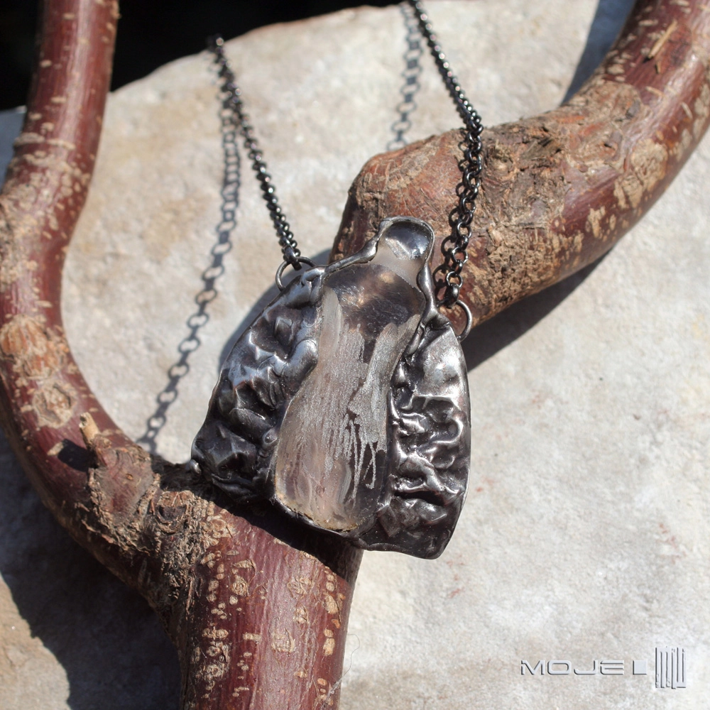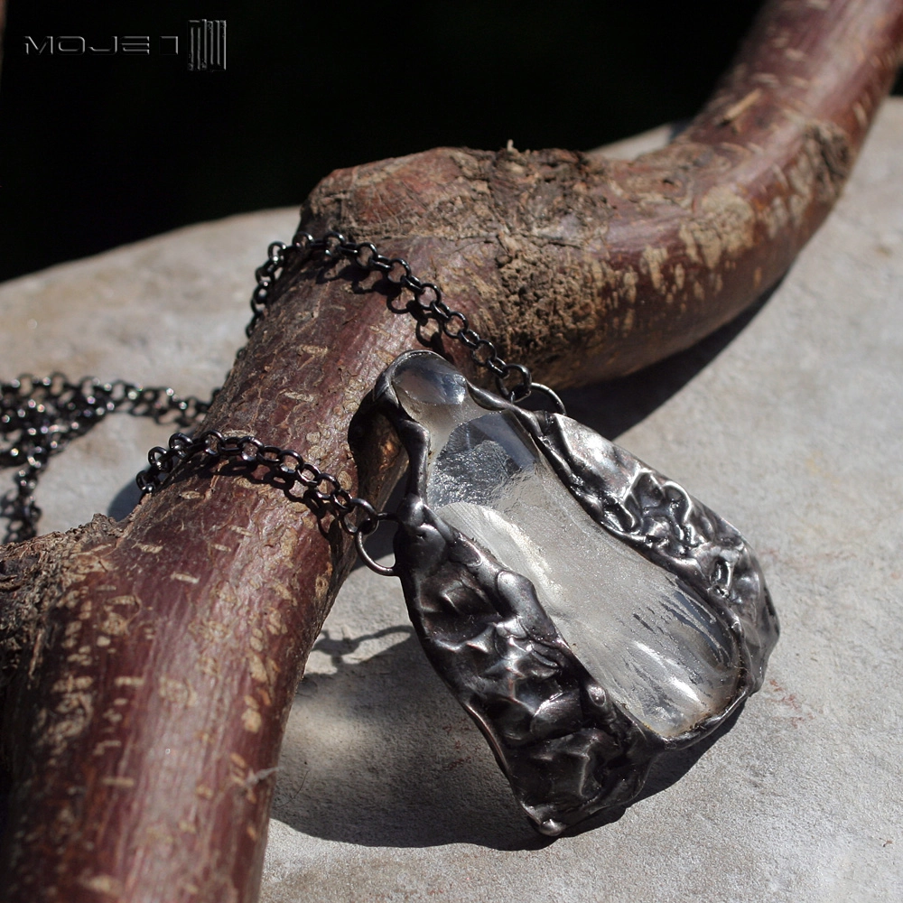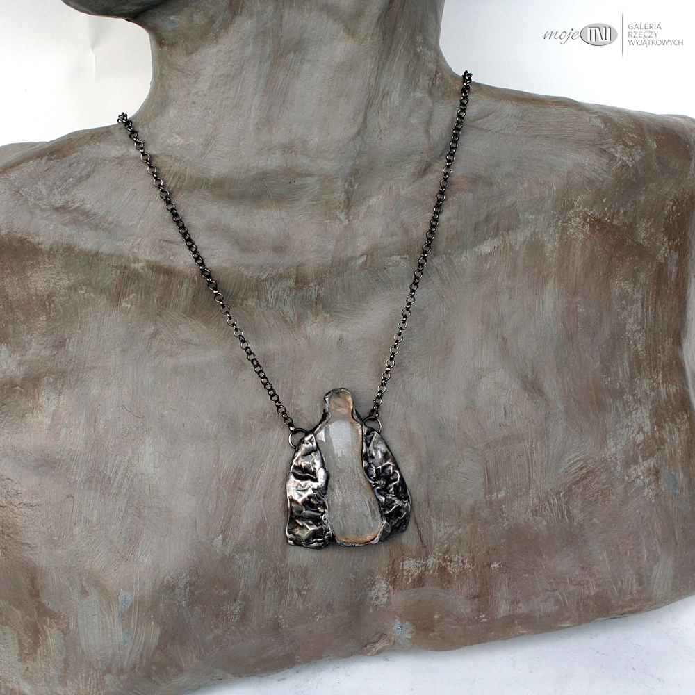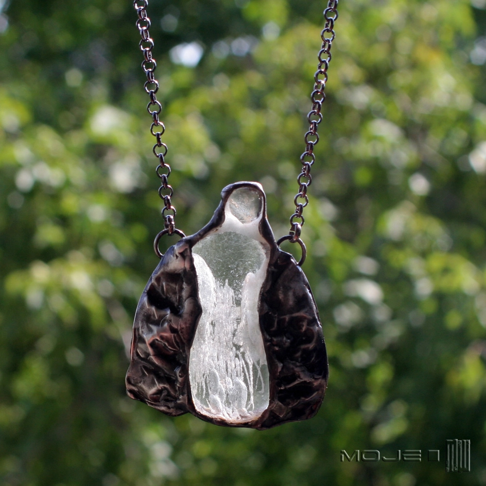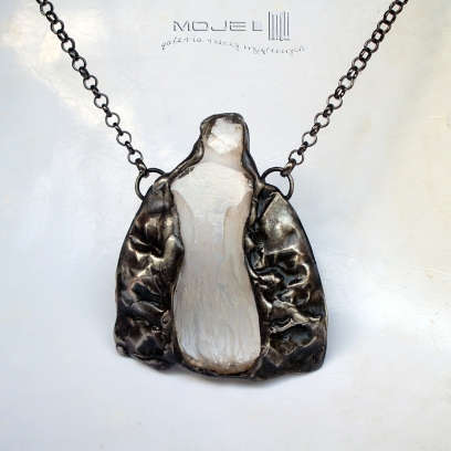 Wisior/naszyjnik z topionego szkła i miedzi. Szkło uformowałam w enigmatyczną postać - może to duch?... i stopiłam metodą fusingu. Powierzchnia szkła jest częściowo nieregularnie zmatowiona. Oprawiony i wykończony jest miedzią pokrytą cyną i patynowaną na kolor starego srebra.