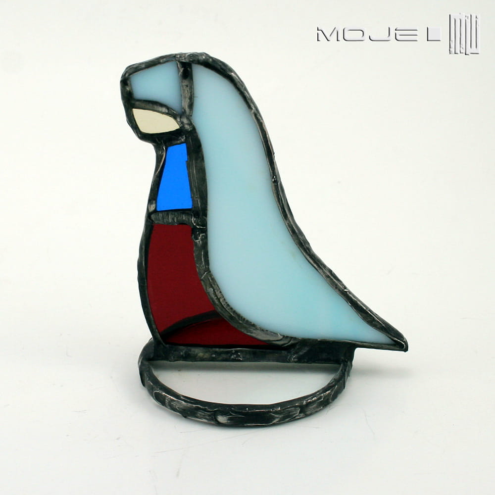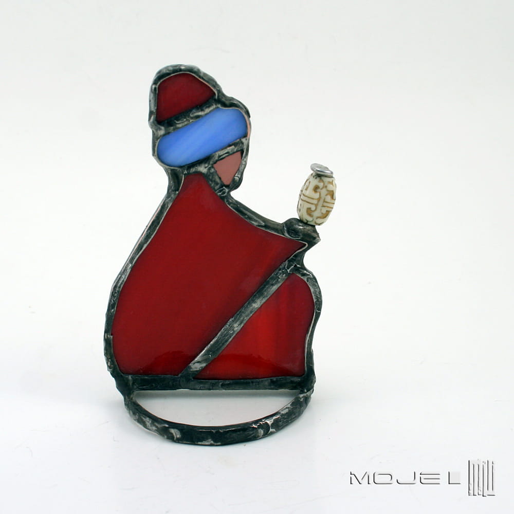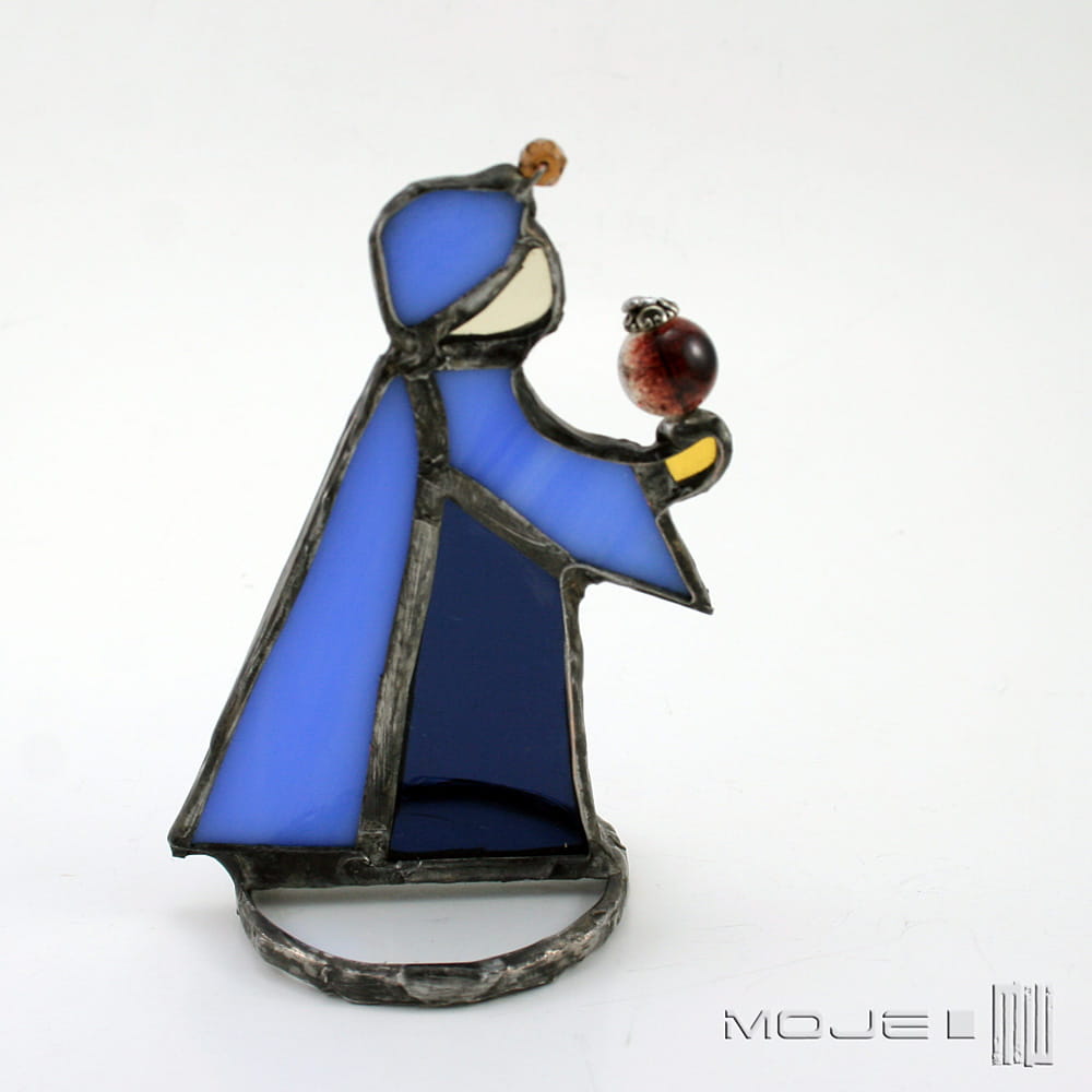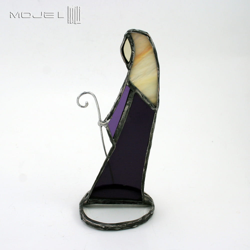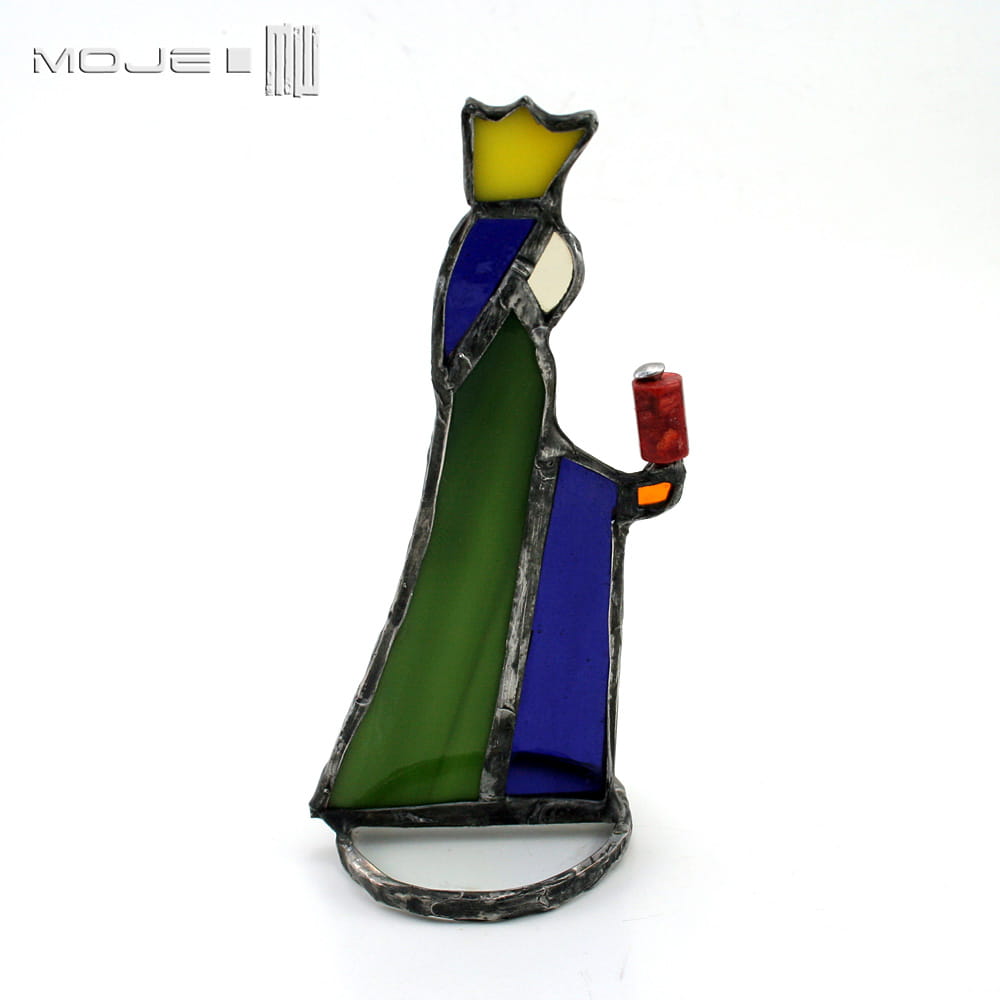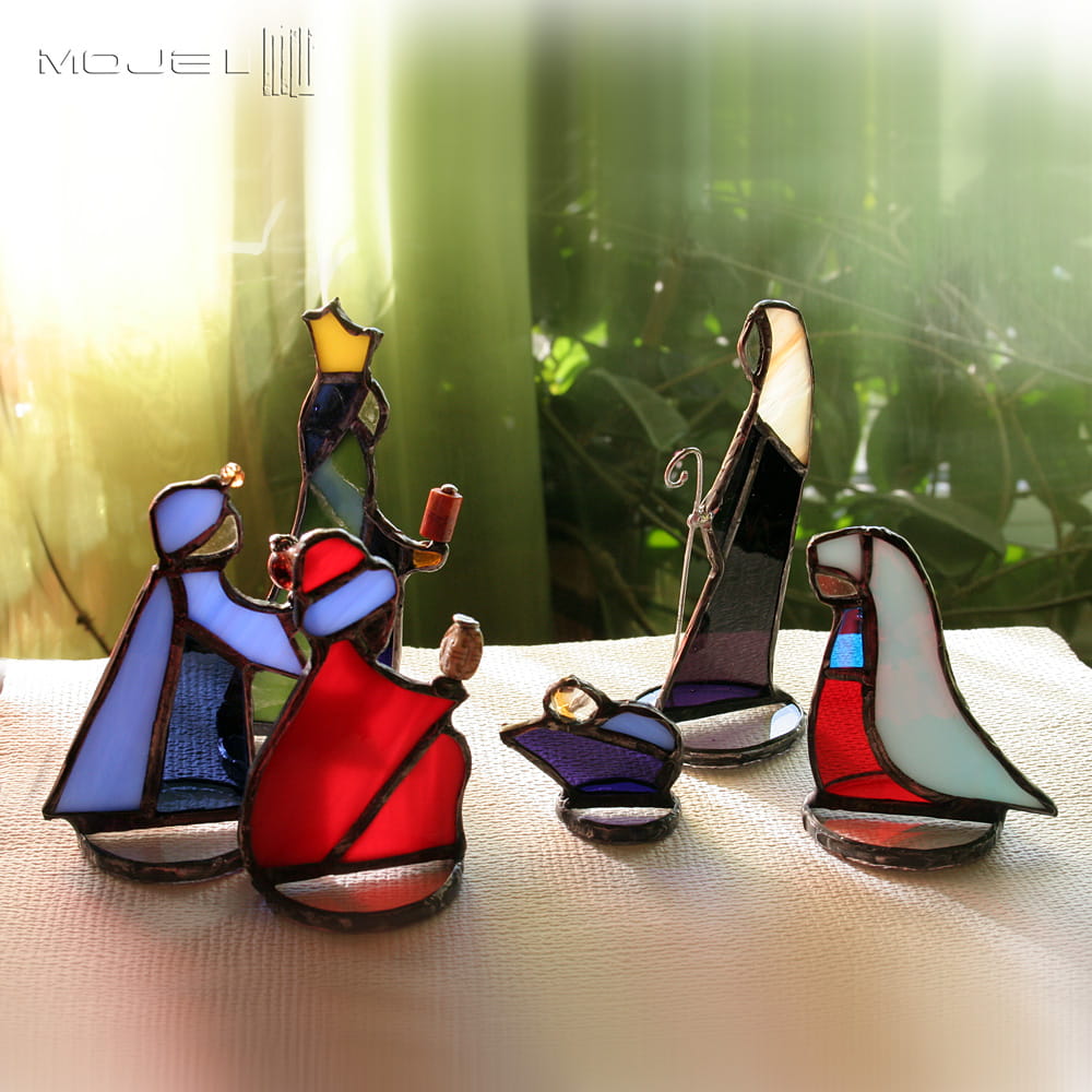 Witrażowe figurki do szopki. Wszystkie figurki zrobione są z kolorowego szkła witrażowego i oprawione techniką Tiffany w miedź - cynowaną, patynowaną i przecieraną. W skład zestawu wchodzi 6 elementów: Józef, Maria, Król pierwszy, Król drugi i Król trzeci oraz Dzieciątko.