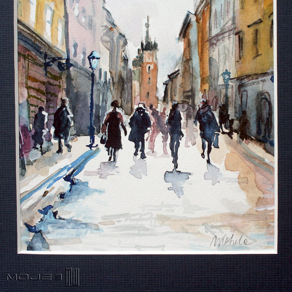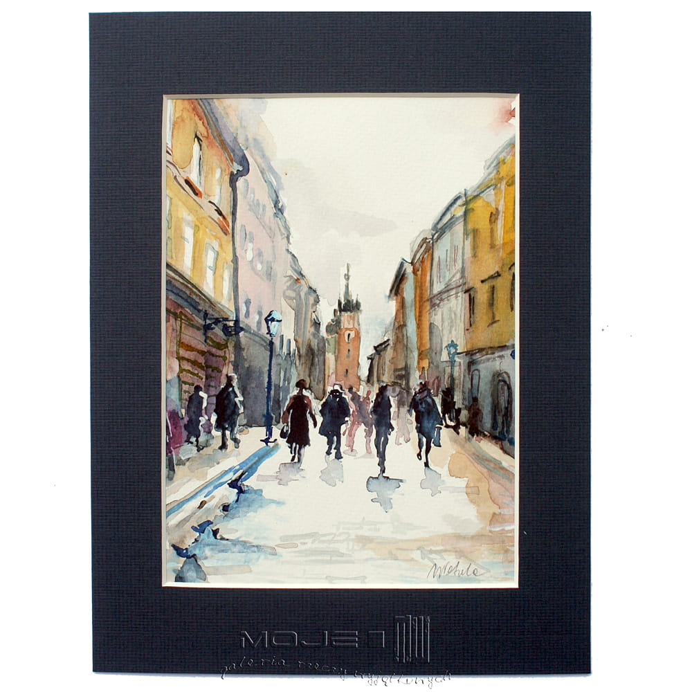Ulica Floriańska w Krakowie z zarysem kościoła Mariackiego... - akwarela.