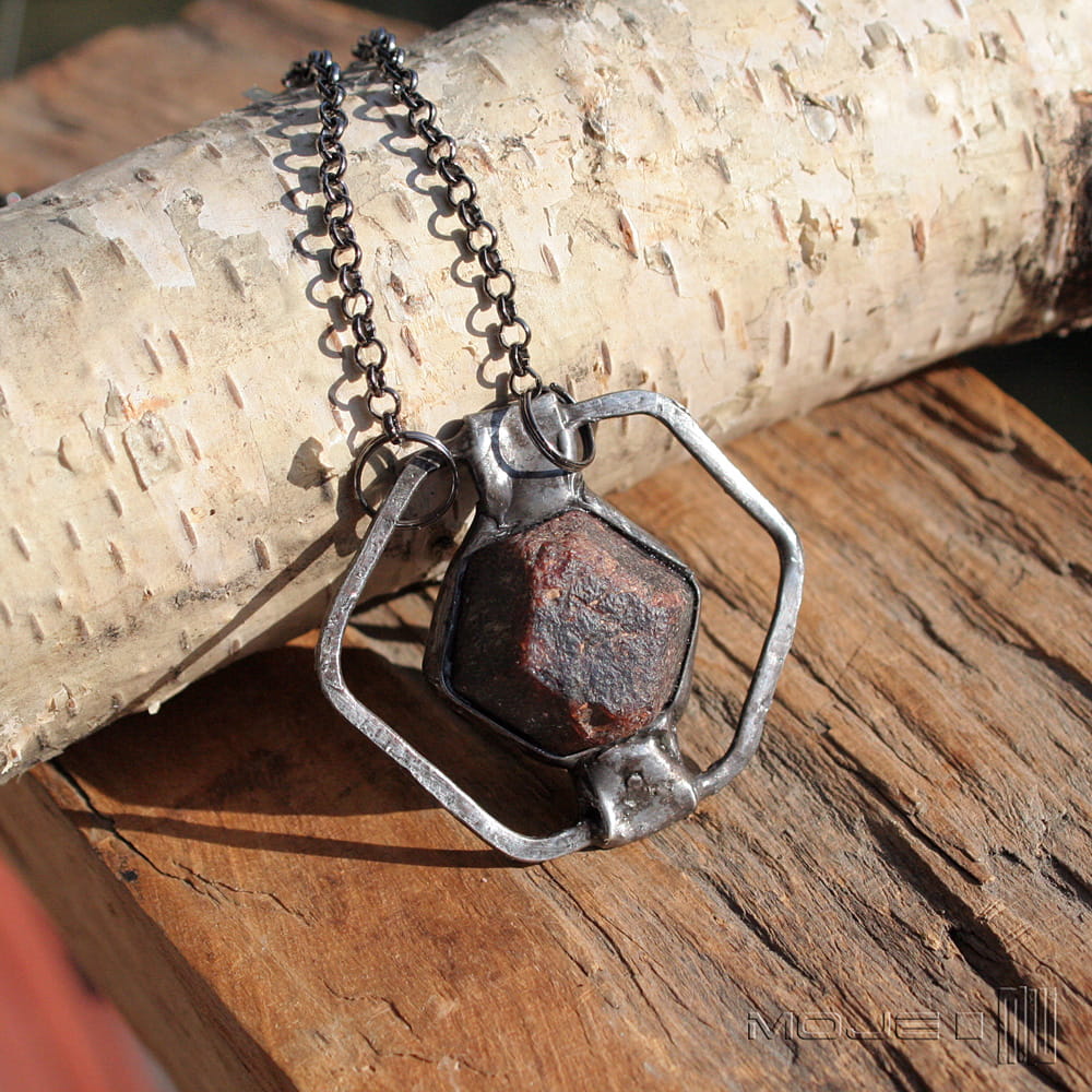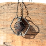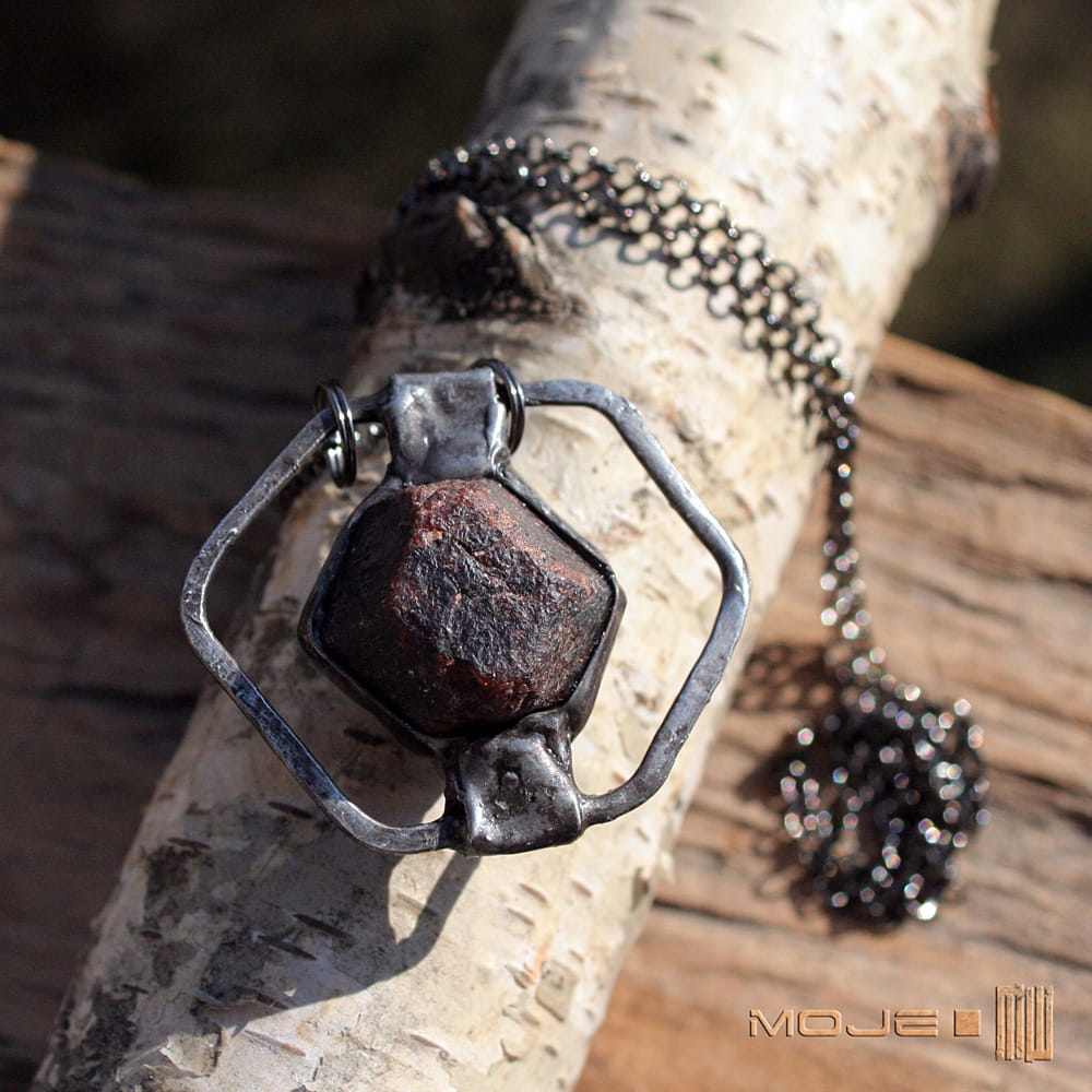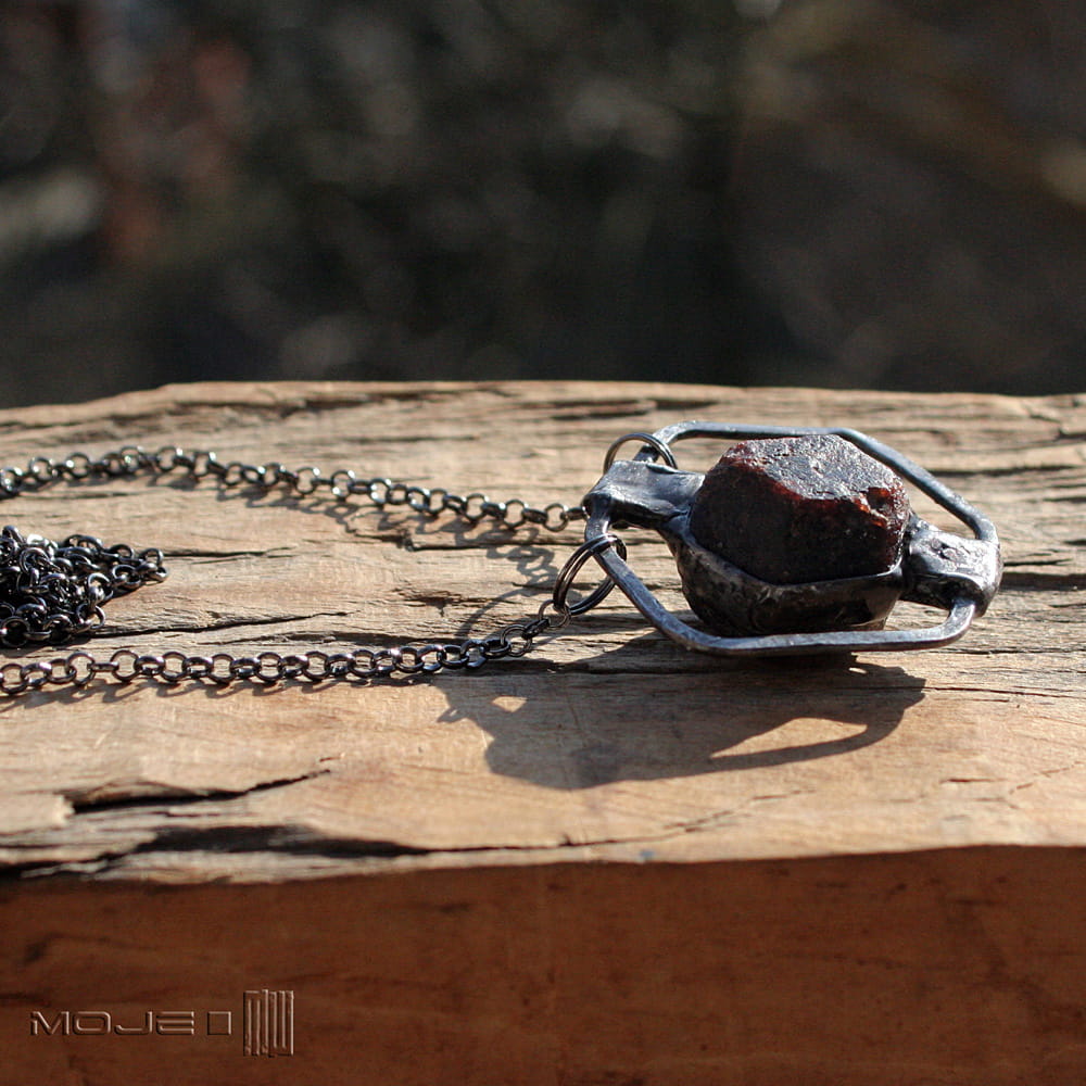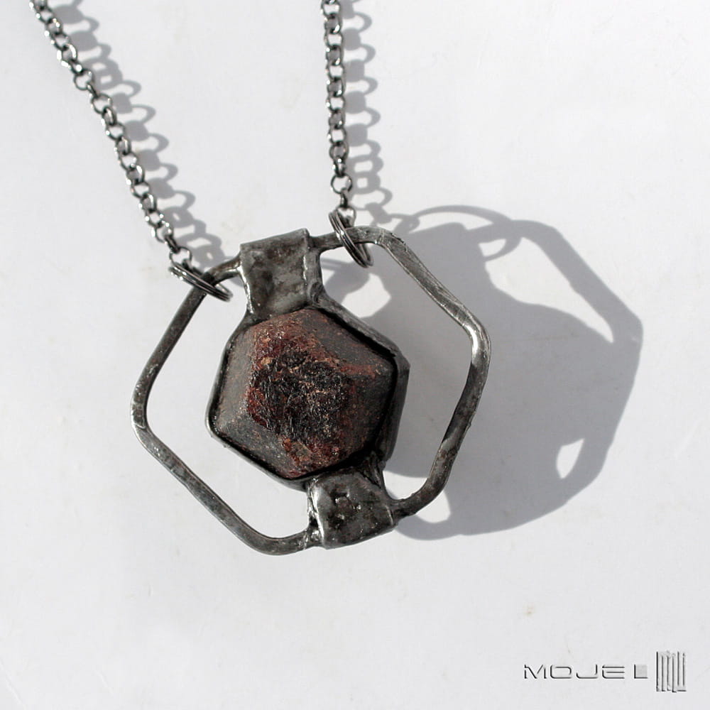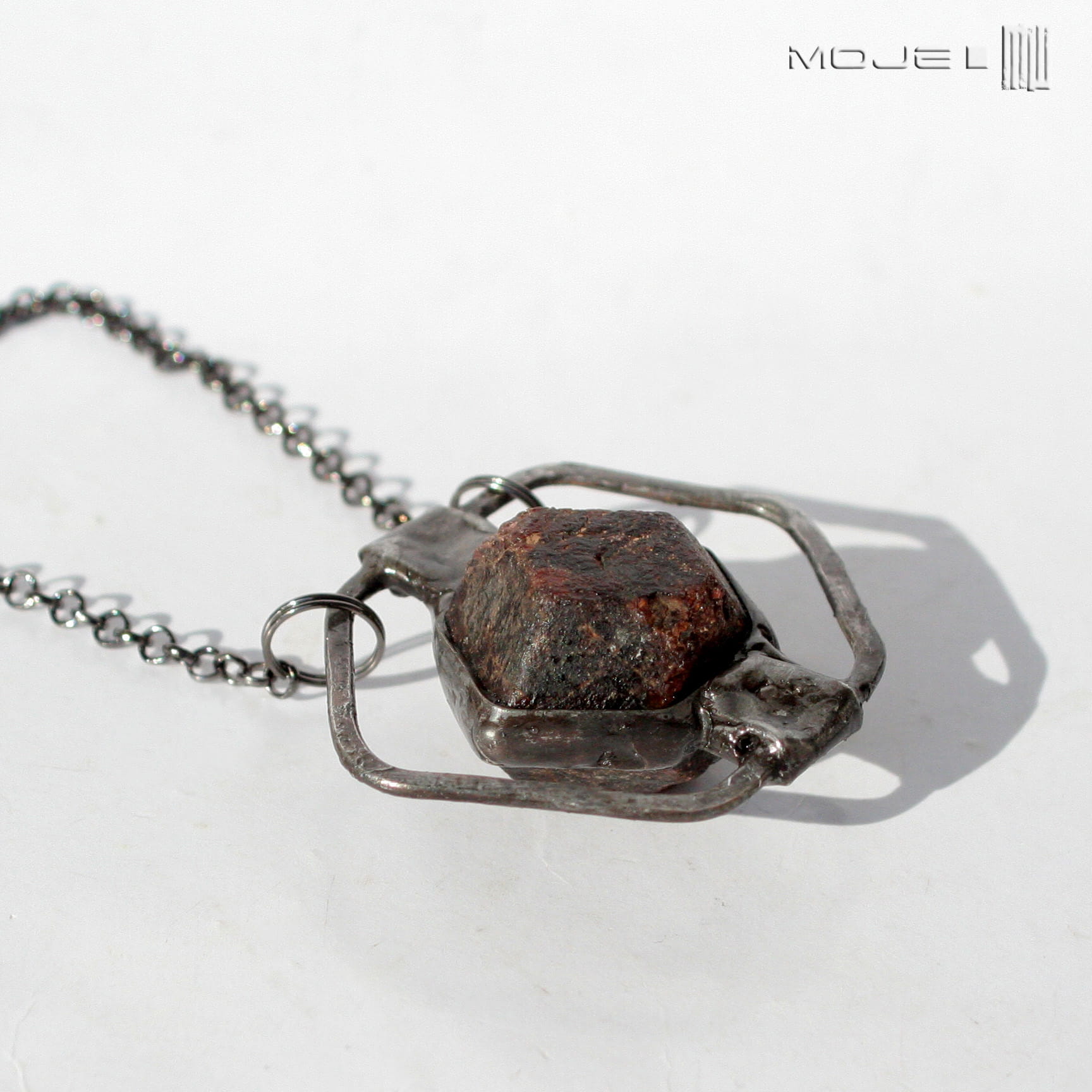Rustykalny wisior z surową, ciosaną bryłką granatu.