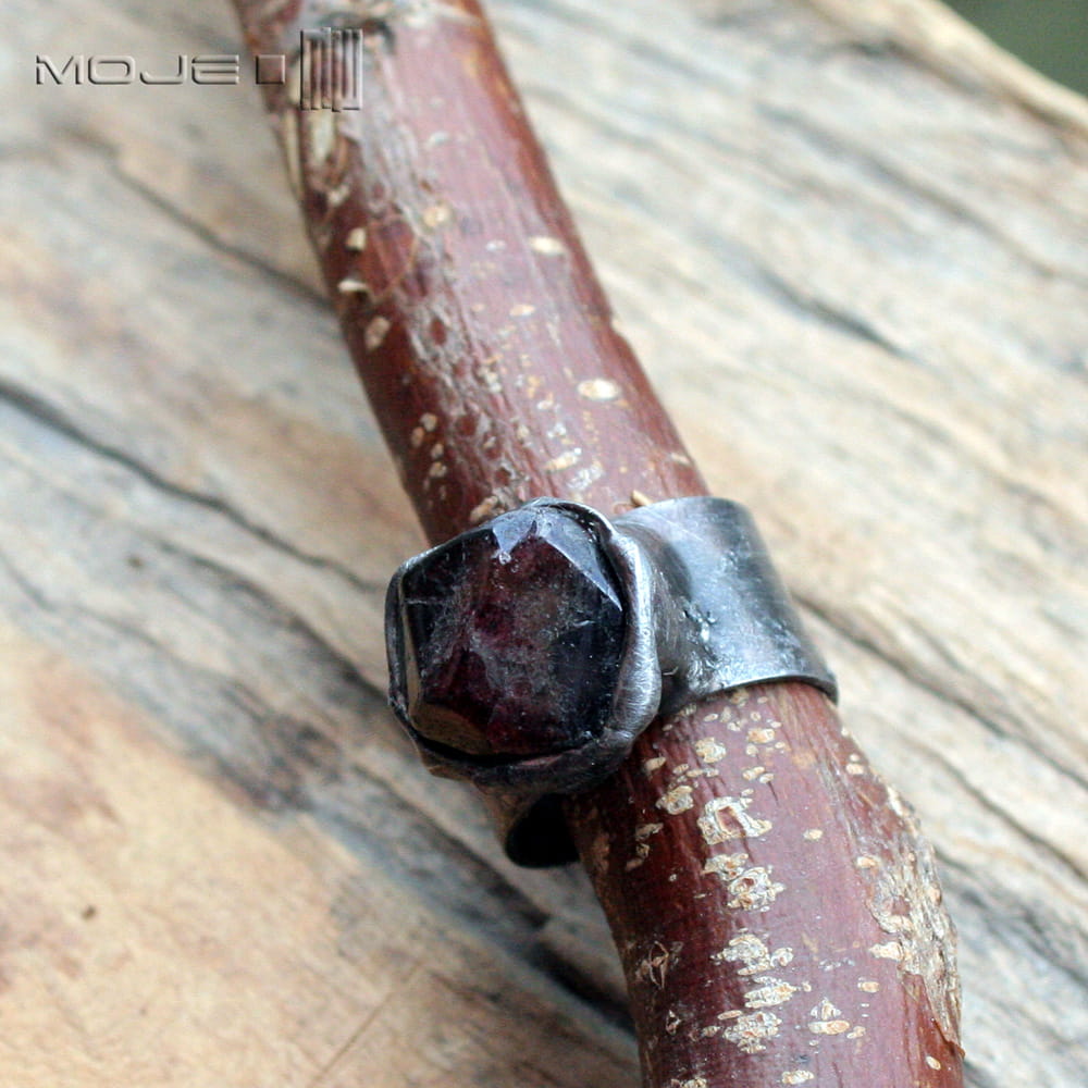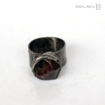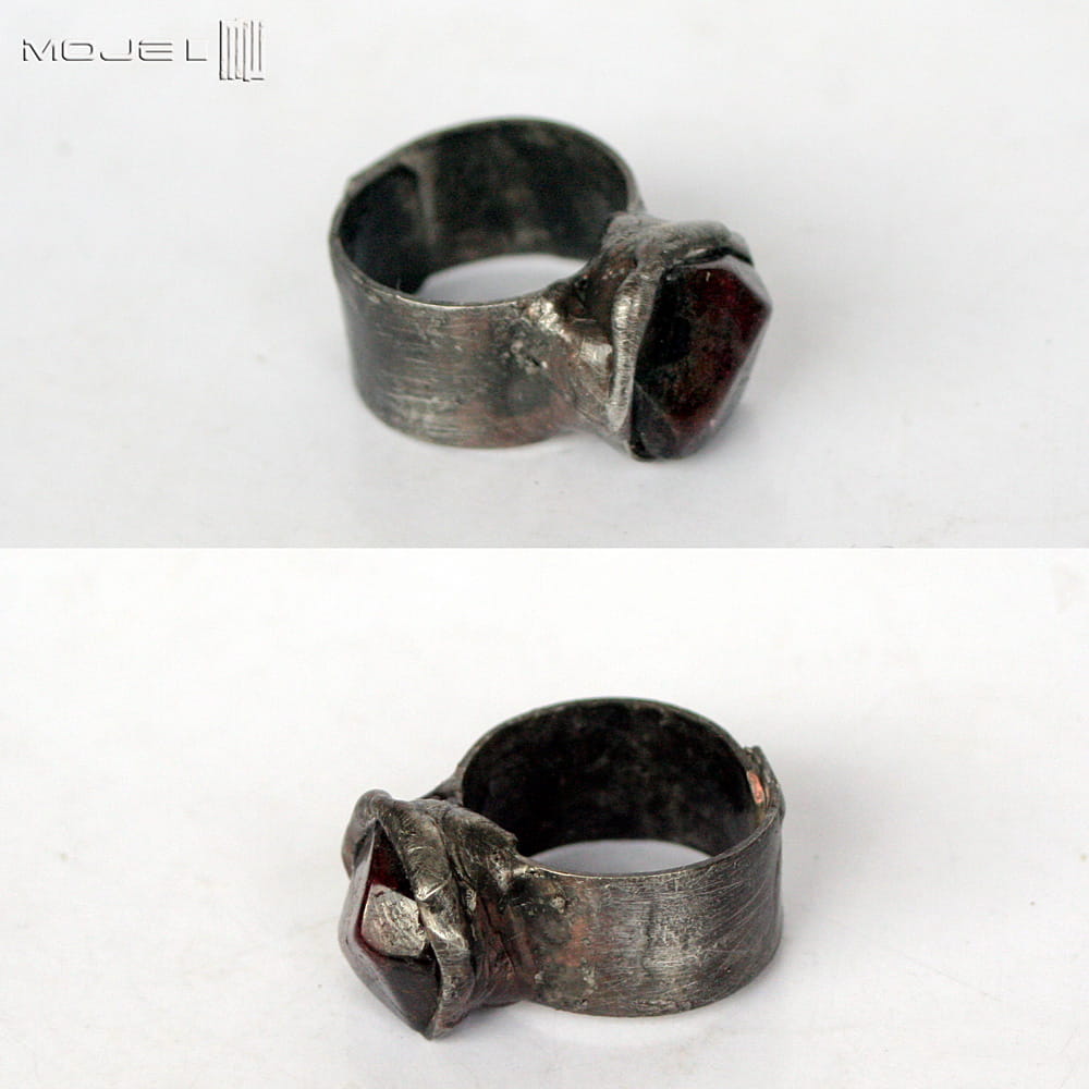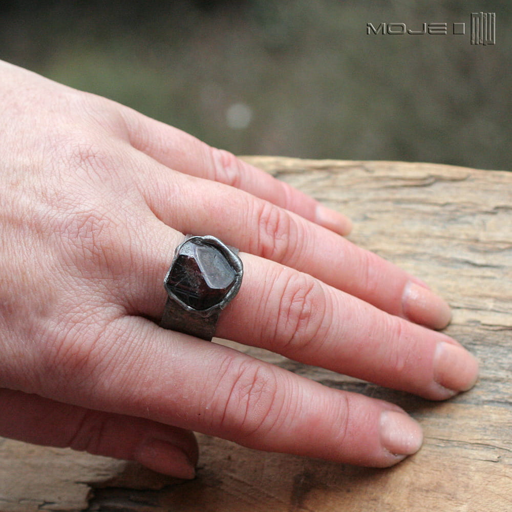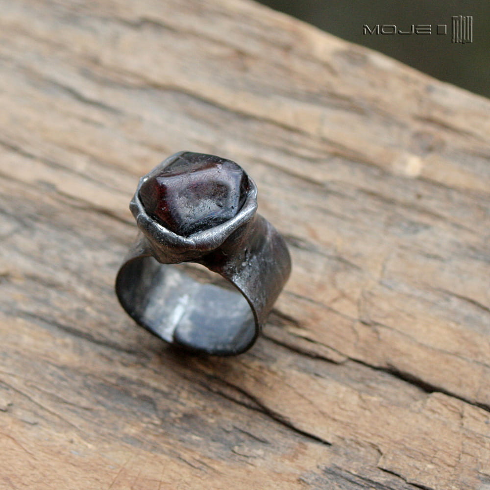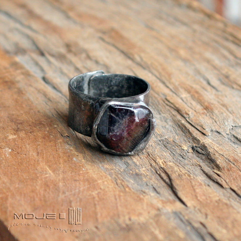 Rustykalny pierścionek z ciosaną i lekko gładzoną bryłką granatu.
