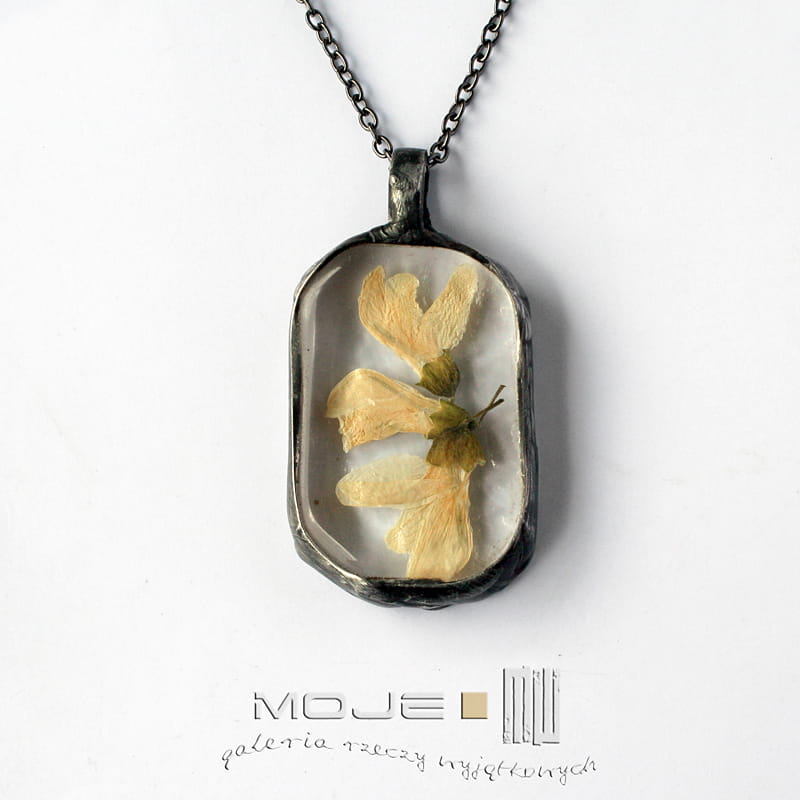Czarowny wisior-zielnik z zamkniętym w jego wnętrzu fragmentem wiosny. Suszony kwiat akacji zamknięty jest między dwoma taflami bezbarwnego szkła. Szkło zewnętrzne jest lekko wypukłe. Całość oprawiona jest w miedź - cynowaną, patynowaną i przecieraną. Wisior zawieszony jest na łańcuszku w kolorze grafitowym. Zazwyczaj dodaję łańcuszek o długości ok. 60-70 cm, ale klient może podać długość, która go interesuje. Intensywność barwy suszonego kwiatu z czasem może być mniejsza, jest to naturalny proces.