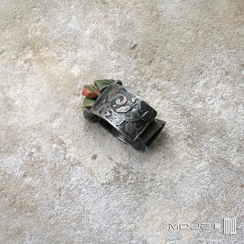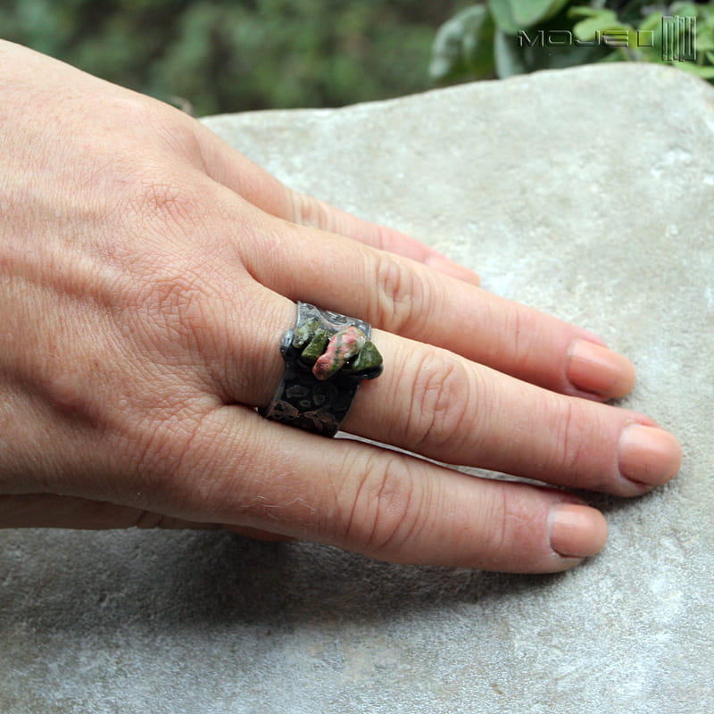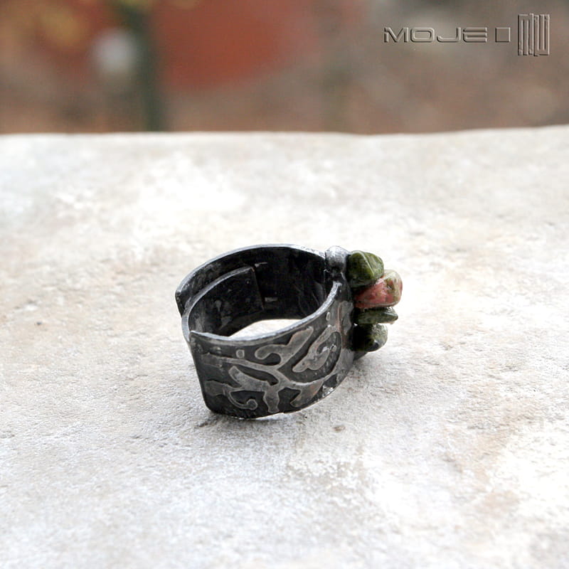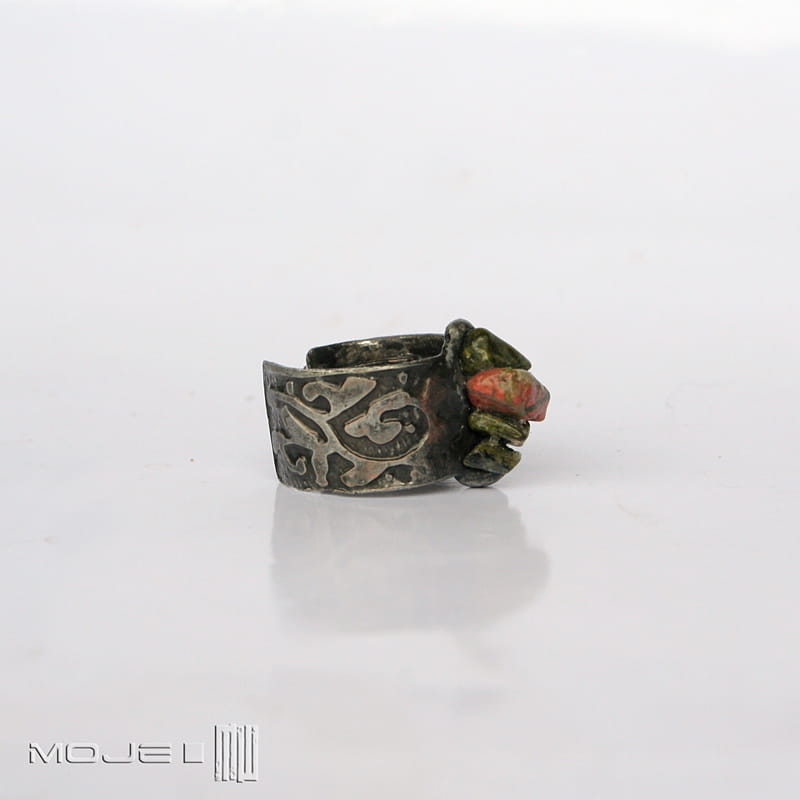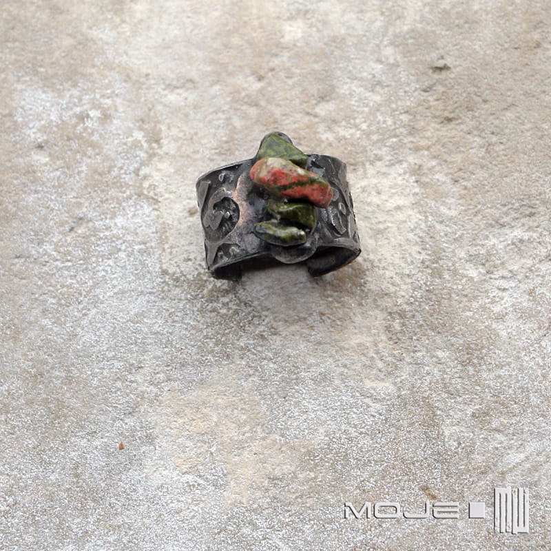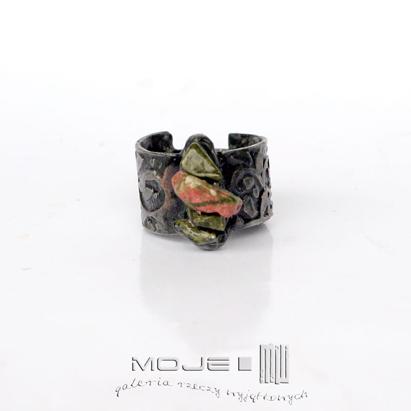 Szeroka obrączka z wytrawionym ozdobnym motywem roślinnym, ozdobiona kamyczkami unakitu. Surowy wygląd obrączki nadaje całości rustykalny charakter.